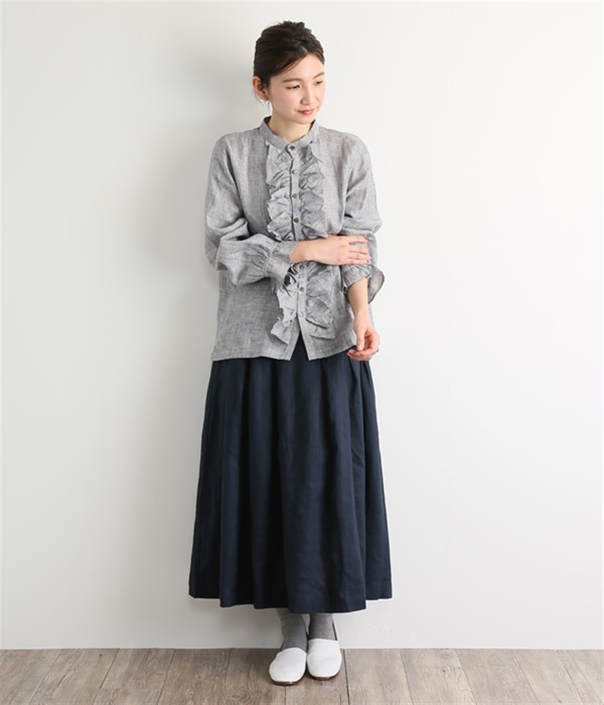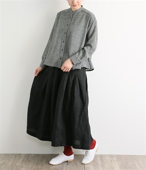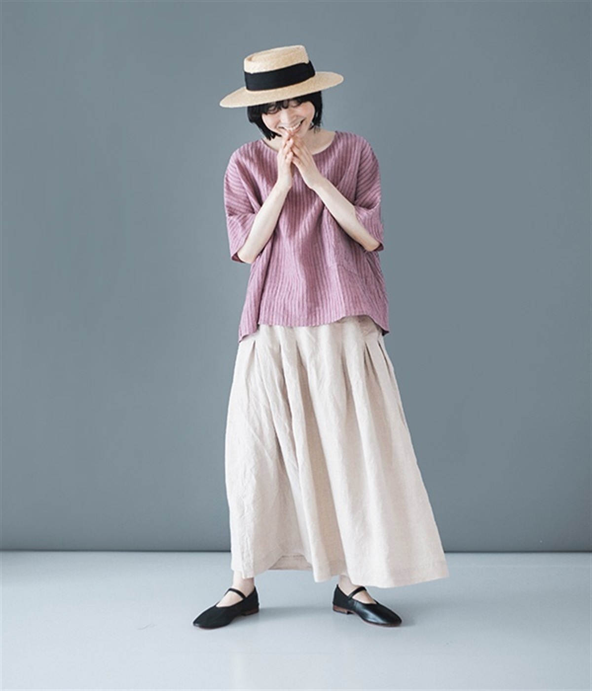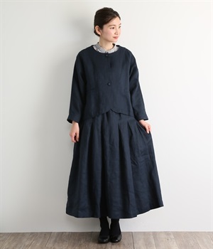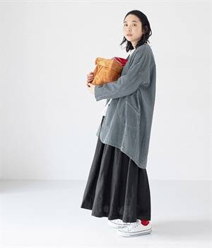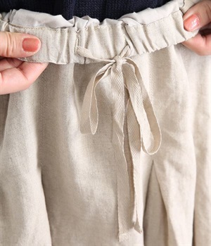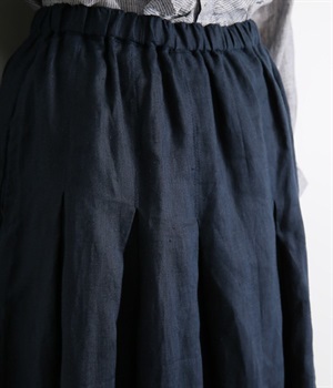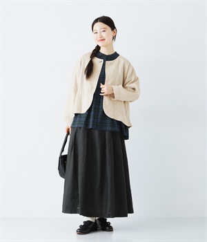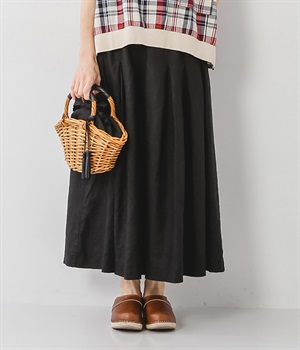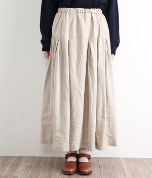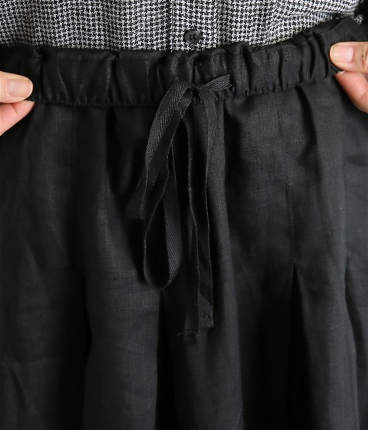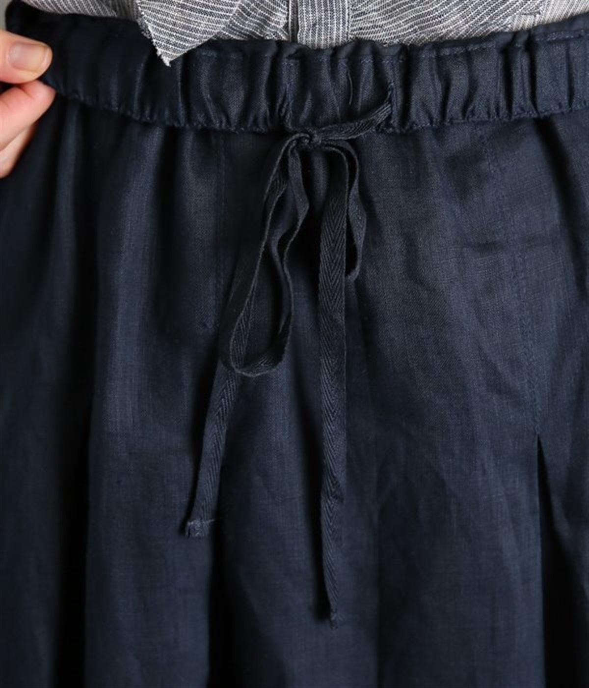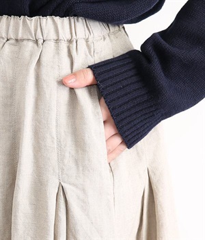 上品な光沢と、目の詰まったハリ感のあるリネンオックス生地で仕立てたミモレ丈スカートです。ウエスト下にタックを施したボリュームシルエットが魅力的。シンプルなのでトップスやシューズによって、カジュアルにもキレイめにも合わせられるシーズンレスな1枚です。ウエストは総ゴムで内側の紐によって調節も可能です。同素材のジャケットと合わせてセットアップで着用するのもおすすめです。両サイドにはポケット付きです。