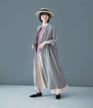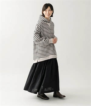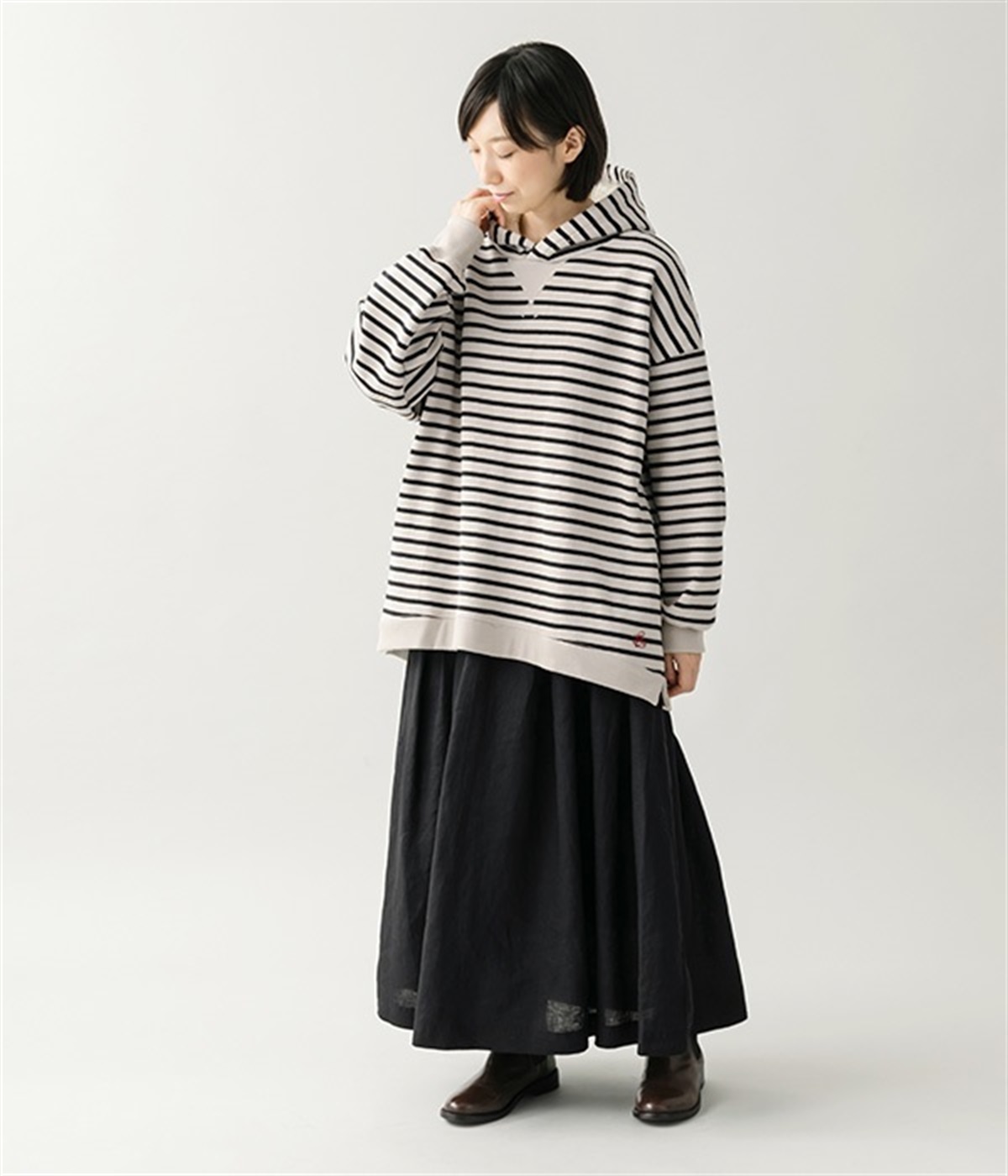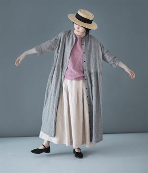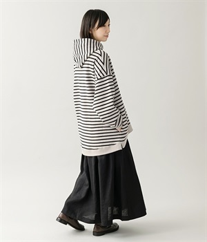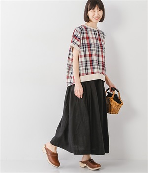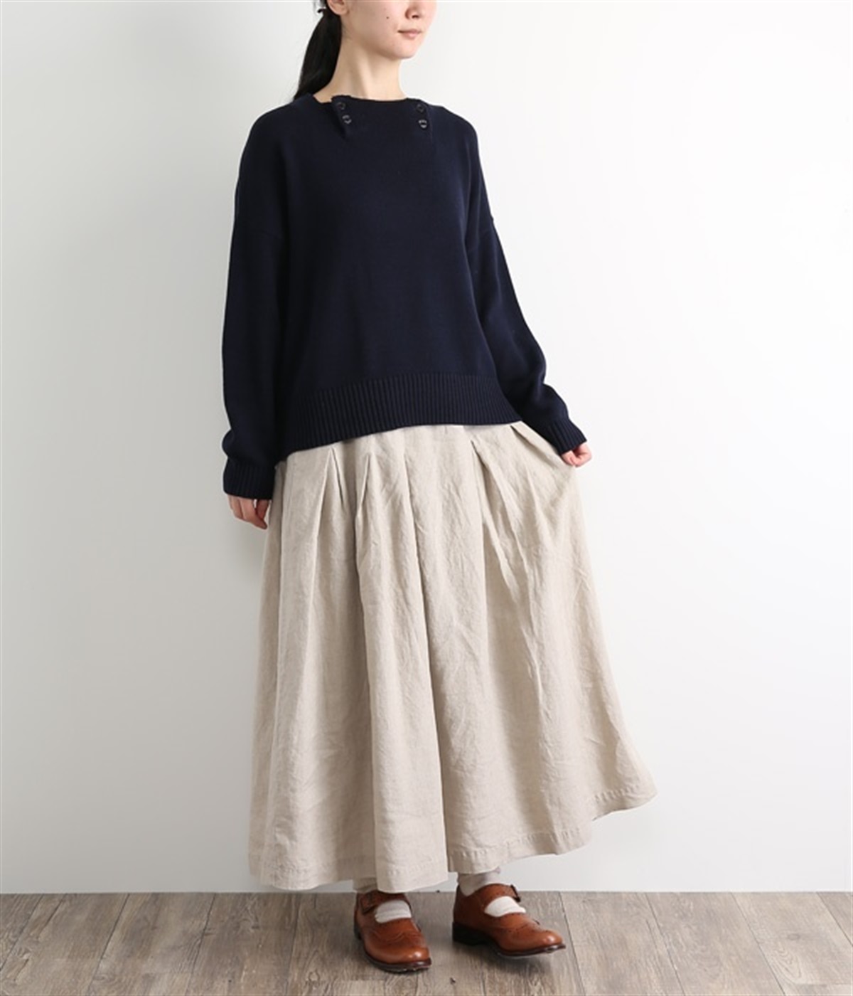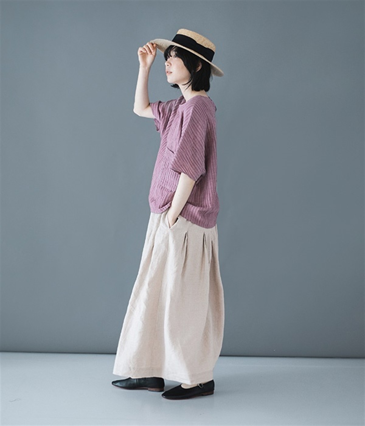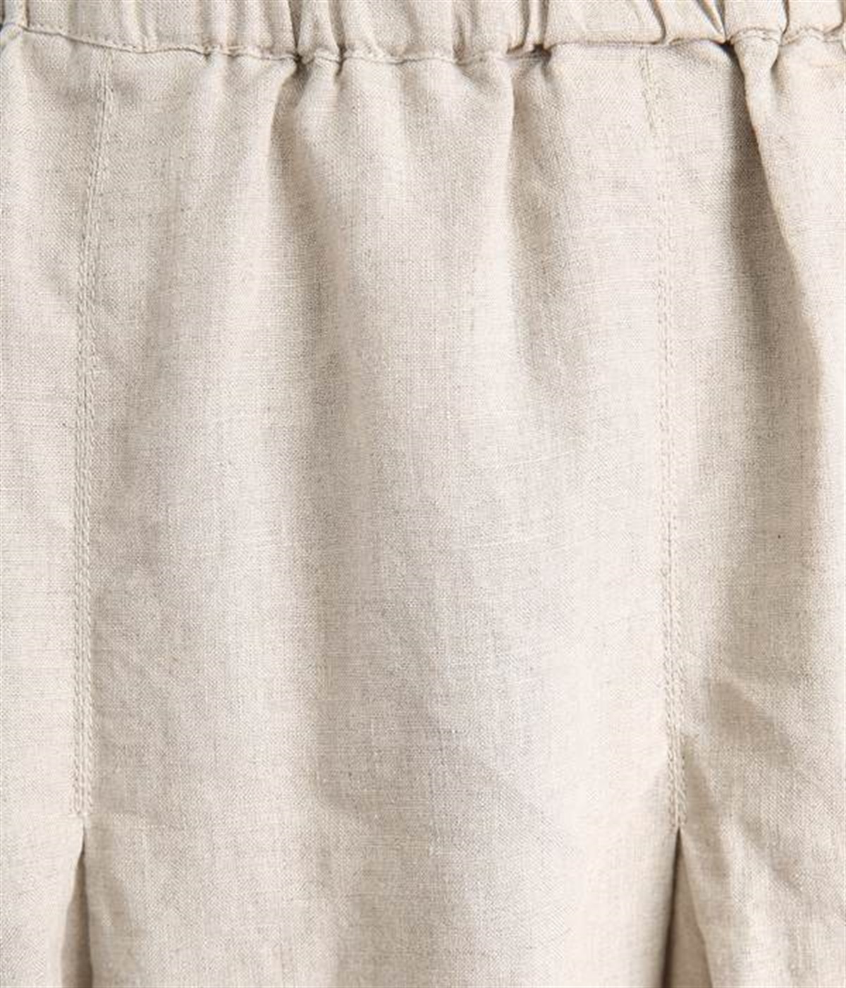 上品な光沢と、目の詰まったハリ感のあるリネンオックス生地で仕立てたミモレ丈スカートです。ウエスト下にタックを施したボリュームシルエットが魅力的。シンプルなのでトップスやシューズによって、カジュアルにもキレイめにも合わせられるシーズンレスな1枚です。ウエストは総ゴムで内側の紐によって調節も可能です。同素材のジャケットと合わせてセットアップで着用するのもおすすめです。両サイドにはポケット付きです。