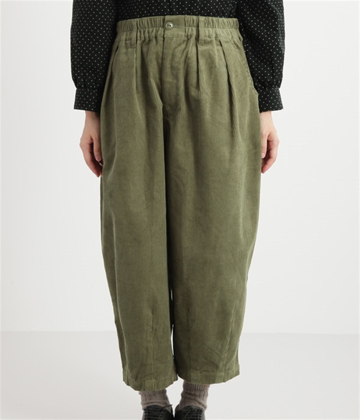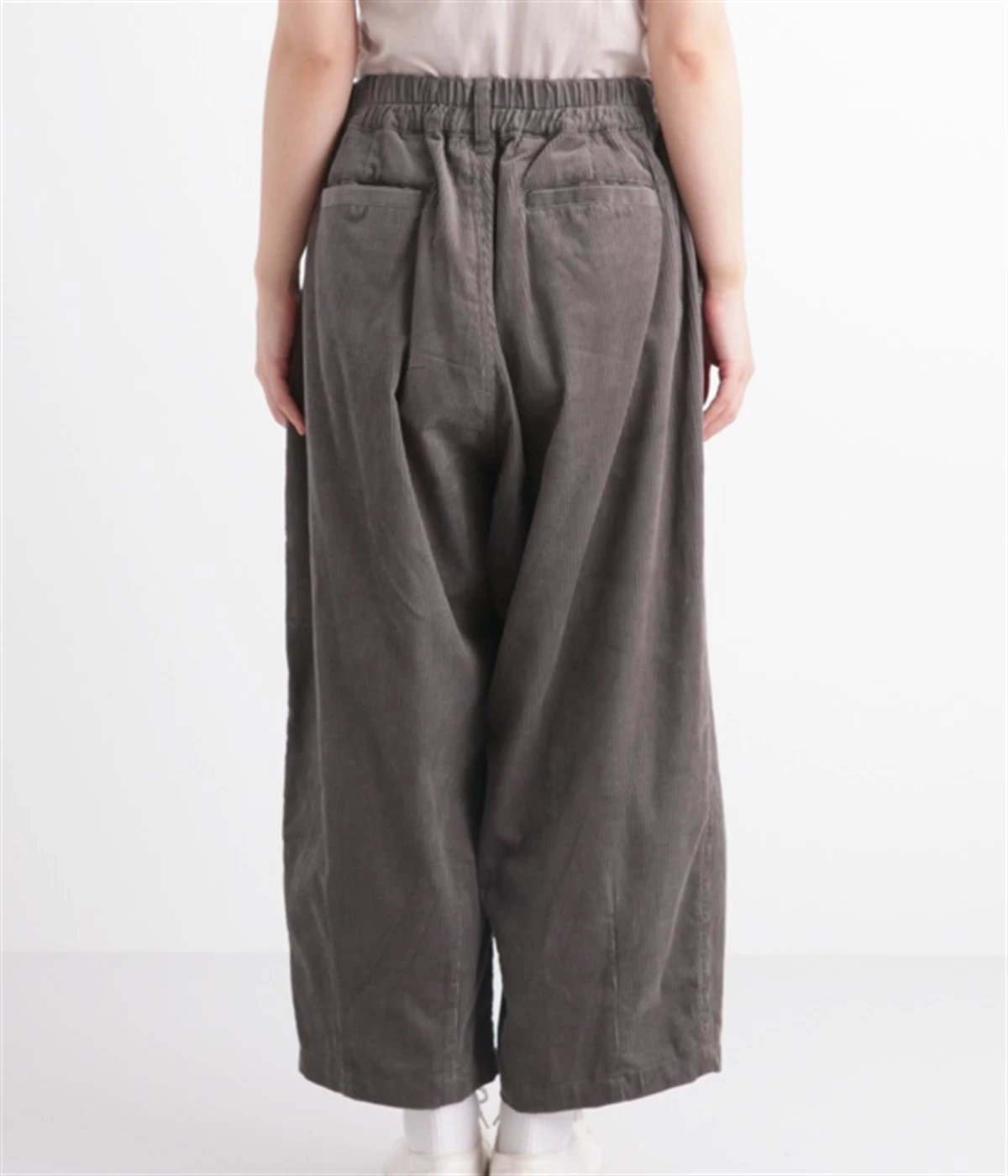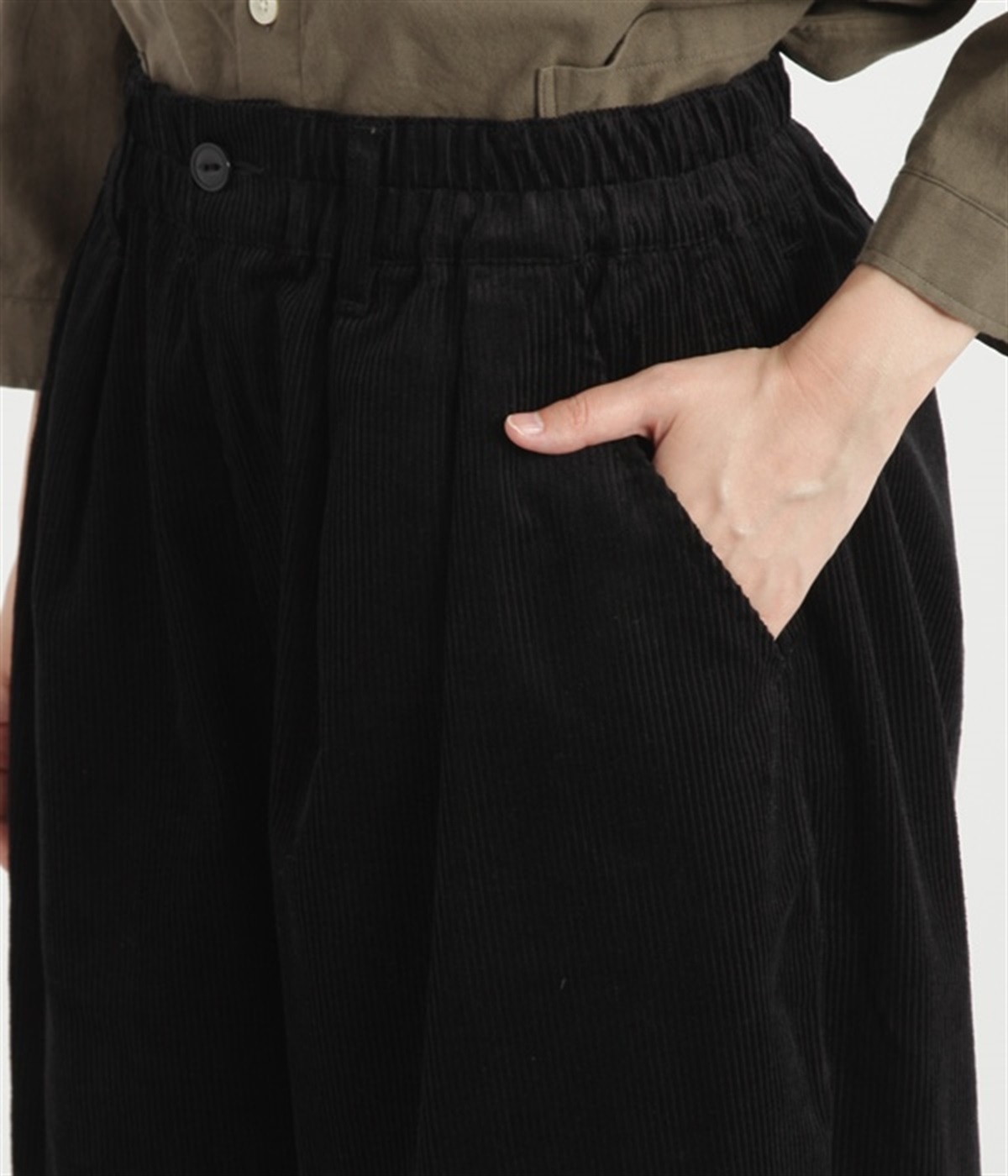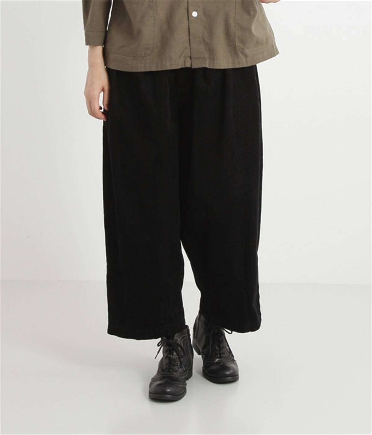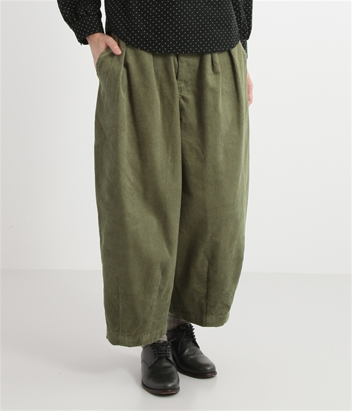 コットンのコーデュロイ生地でほどよい厚みがあり、ウォーム感たっぷりなワイドパンツです。ウエスト下にタックを施したゆったりシルエットながら、裾にダーツを入れて足もとのボリュームはセーブしています。フロントファスナー開閉にウエストゴム入りで着脱しやすく、穿き心地も快適。両サイドに便利なポケット付きです。