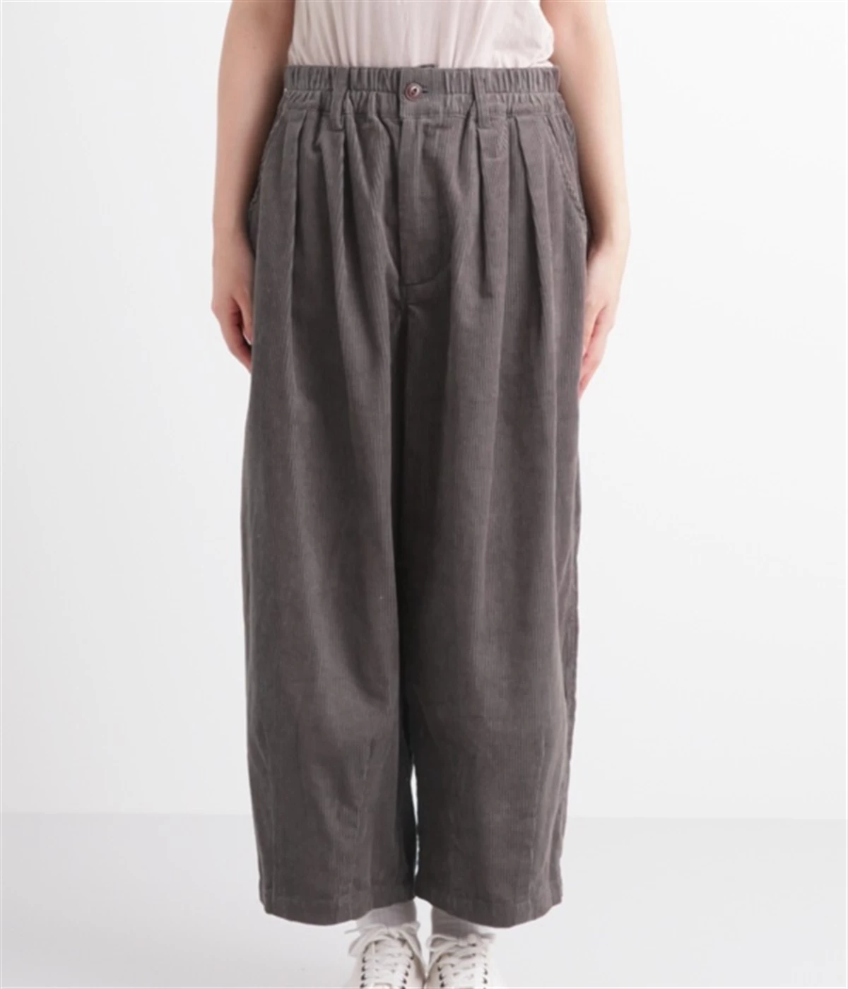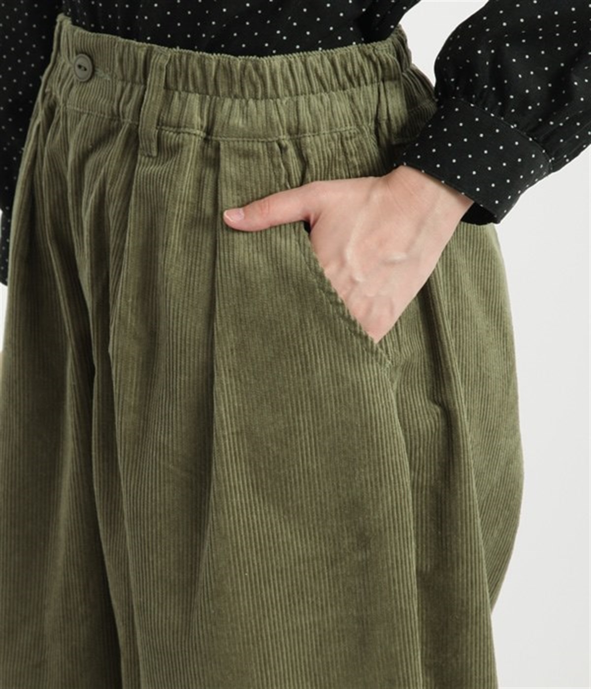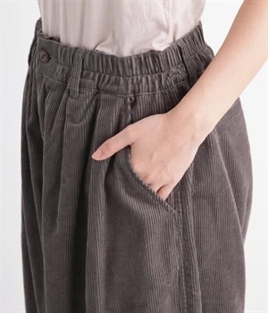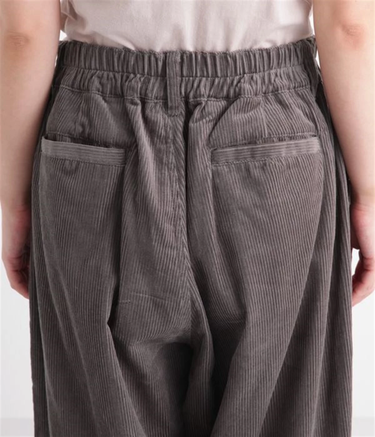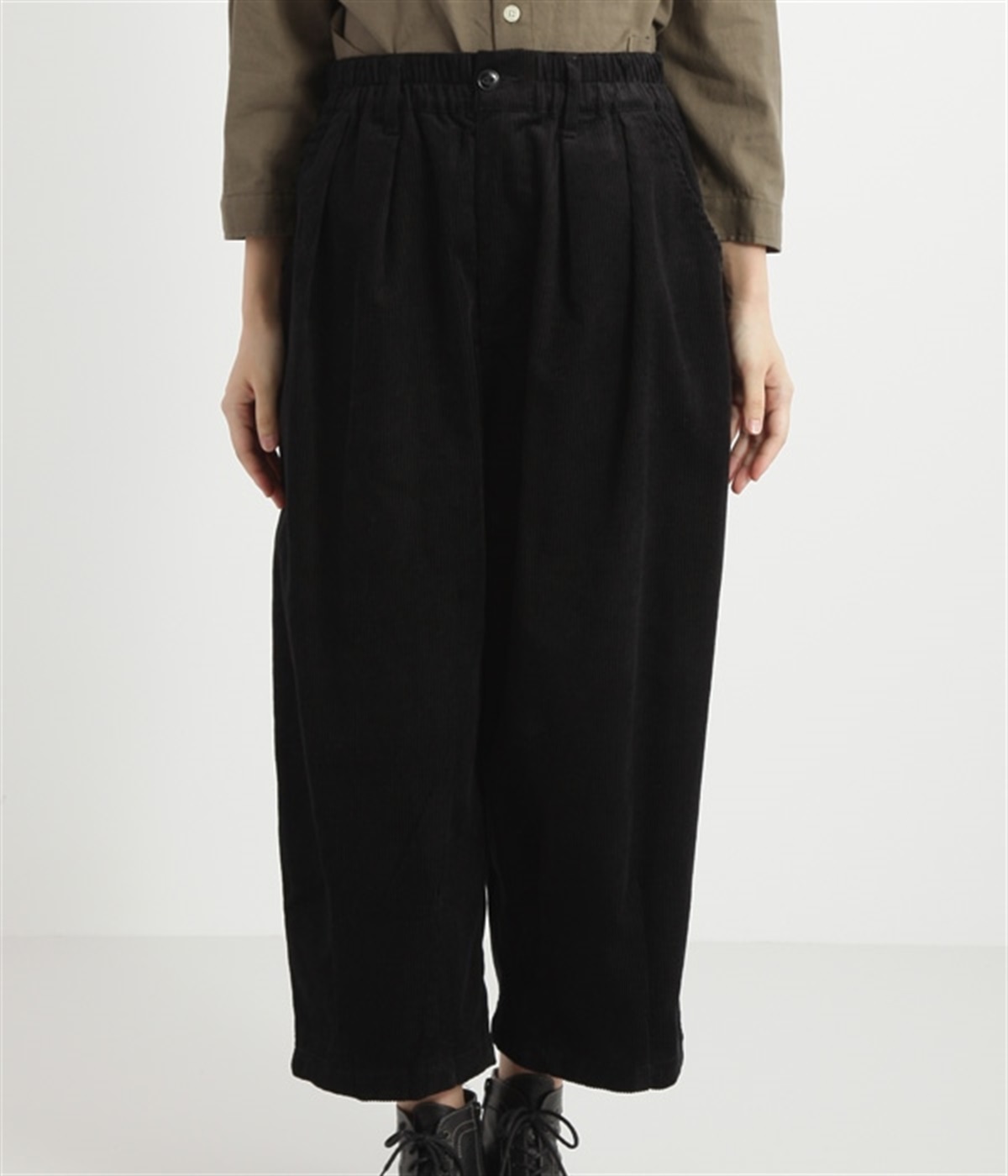 コットンのコーデュロイ生地でほどよい厚みがあり、ウォーム感たっぷりなワイドパンツです。ウエスト下にタックを施したゆったりシルエットながら、裾にダーツを入れて足もとのボリュームはセーブしています。フロントファスナー開閉にウエストゴム入りで着脱しやすく、穿き心地も快適。両サイドに便利なポケット付きです。