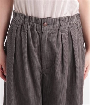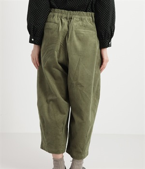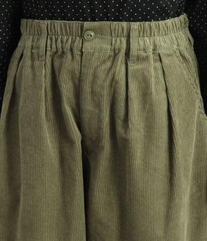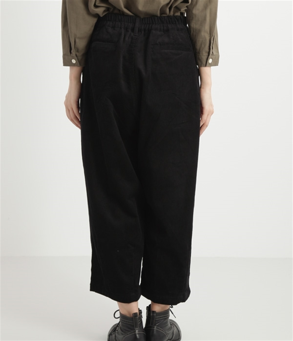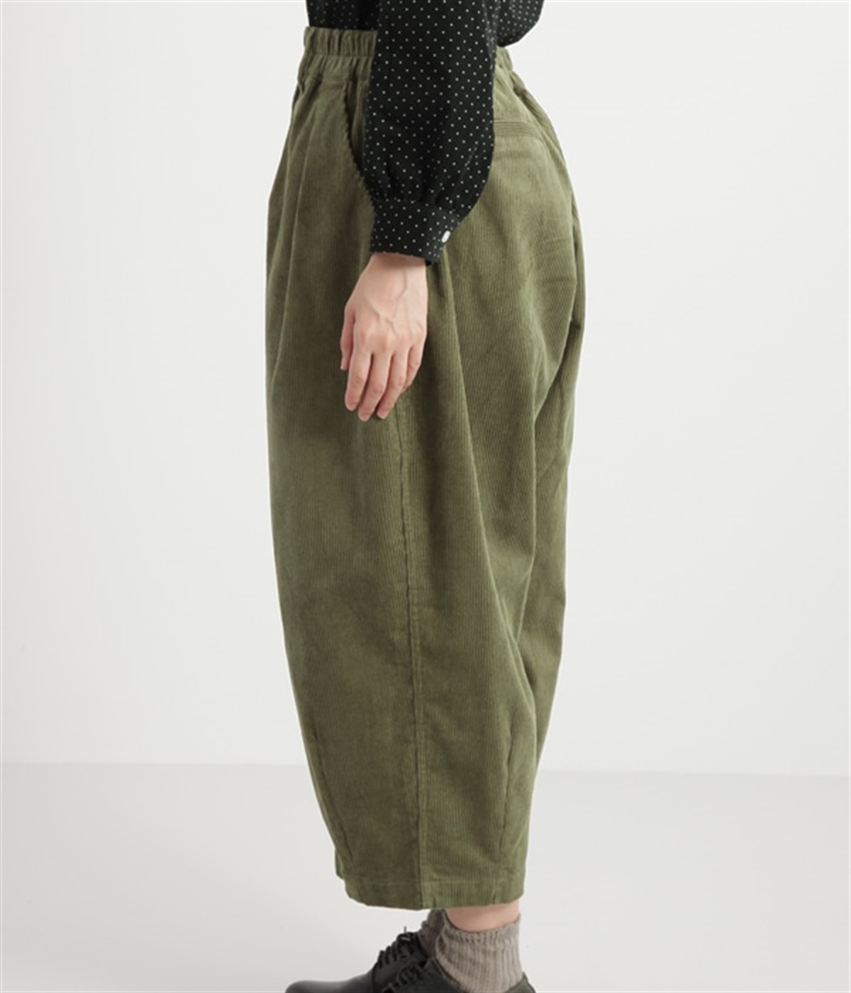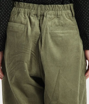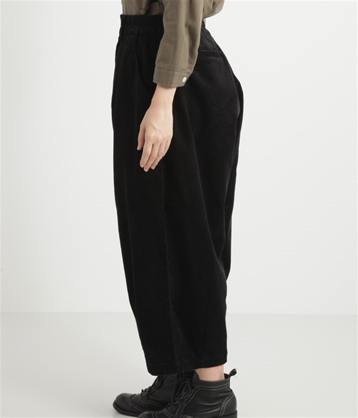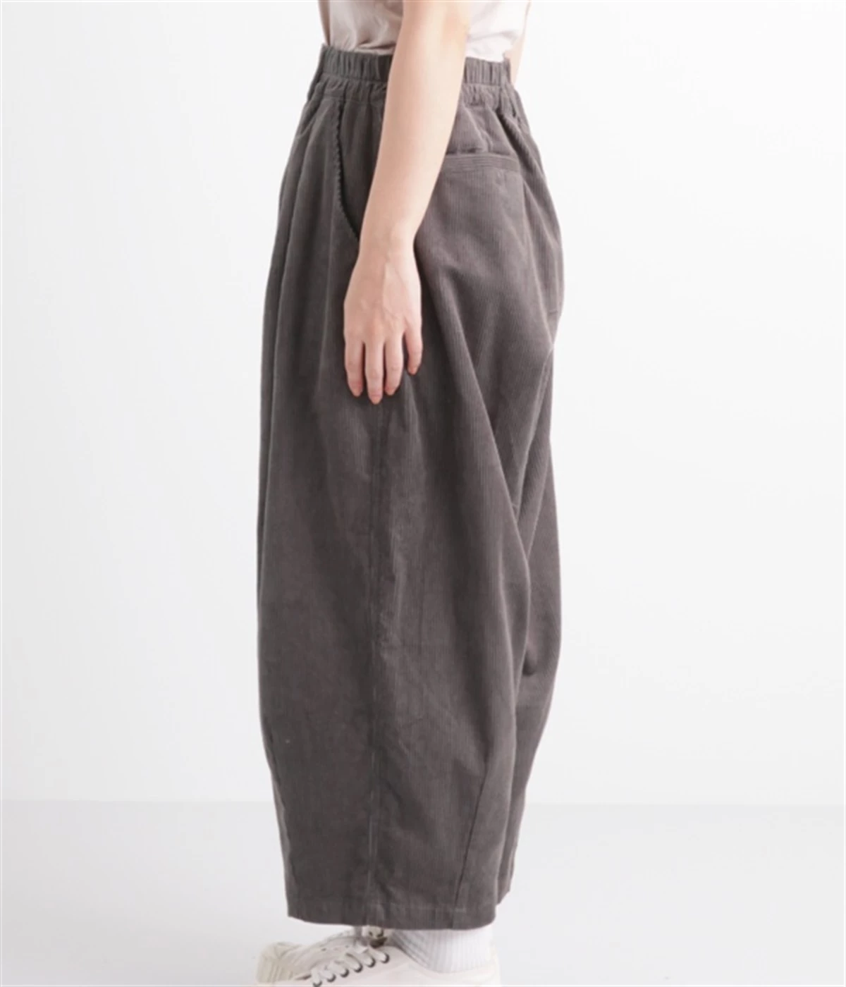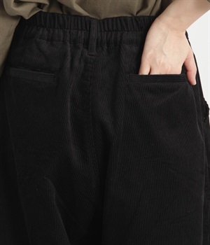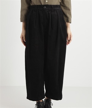 コットンのコーデュロイ生地でほどよい厚みがあり、ウォーム感たっぷりなワイドパンツです。ウエスト下にタックを施したゆったりシルエットながら、裾にダーツを入れて足もとのボリュームはセーブしています。フロントファスナー開閉にウエストゴム入りで着脱しやすく、穿き心地も快適。両サイドに便利なポケット付きです。