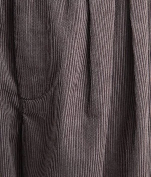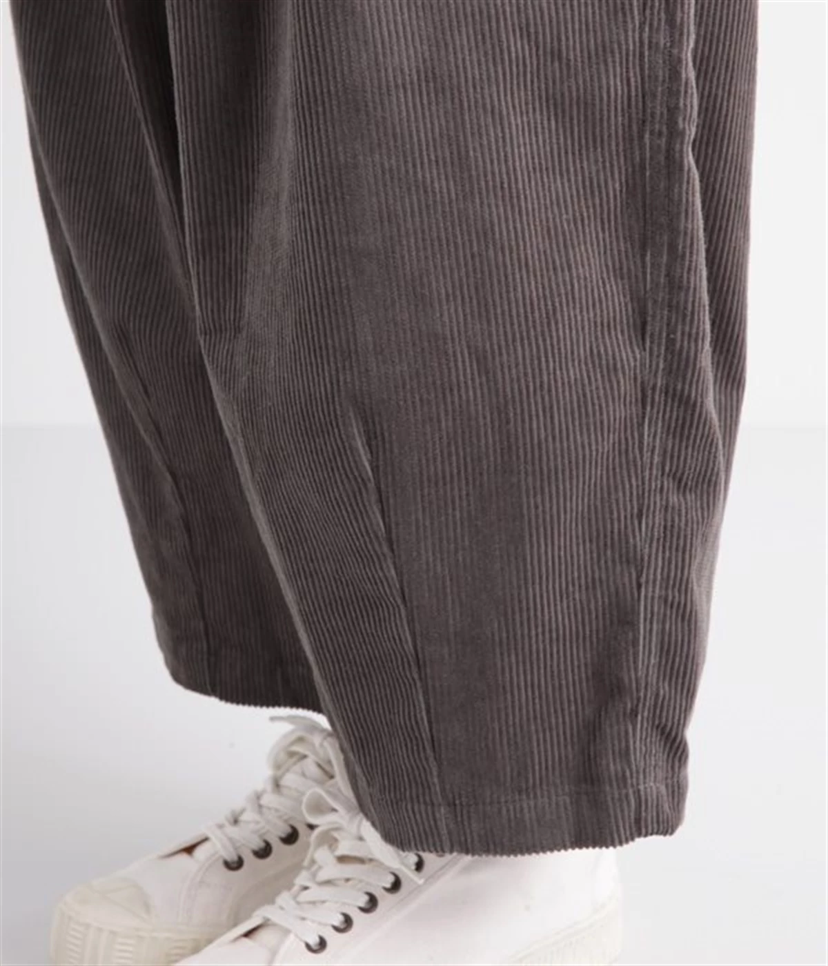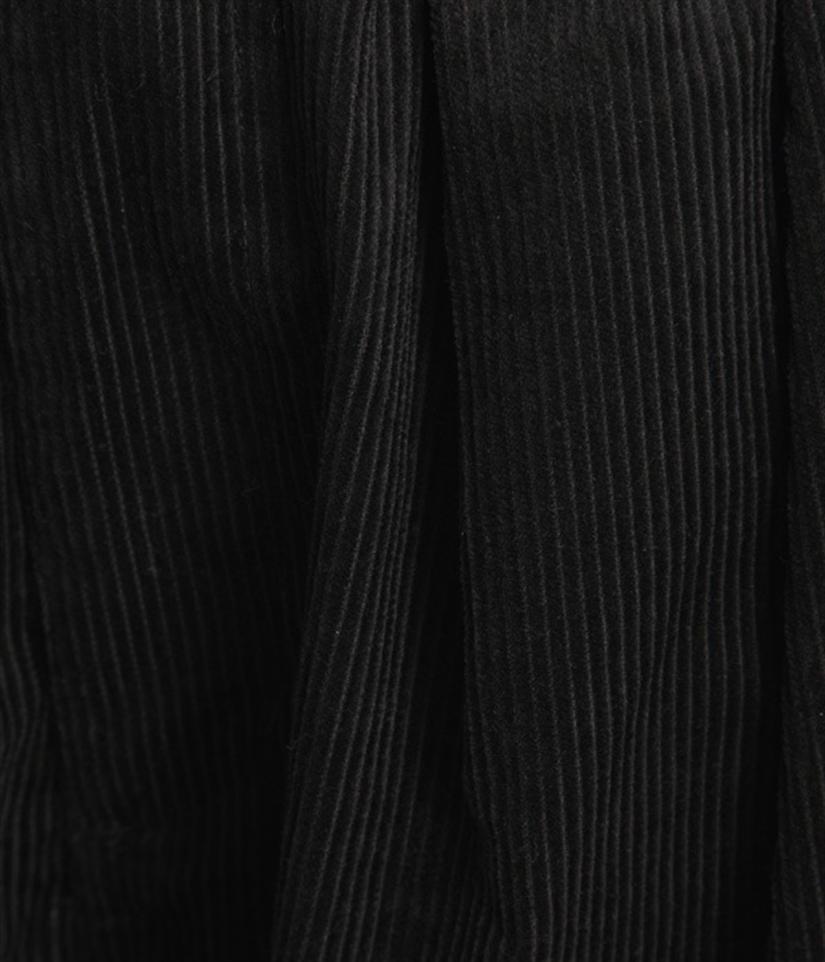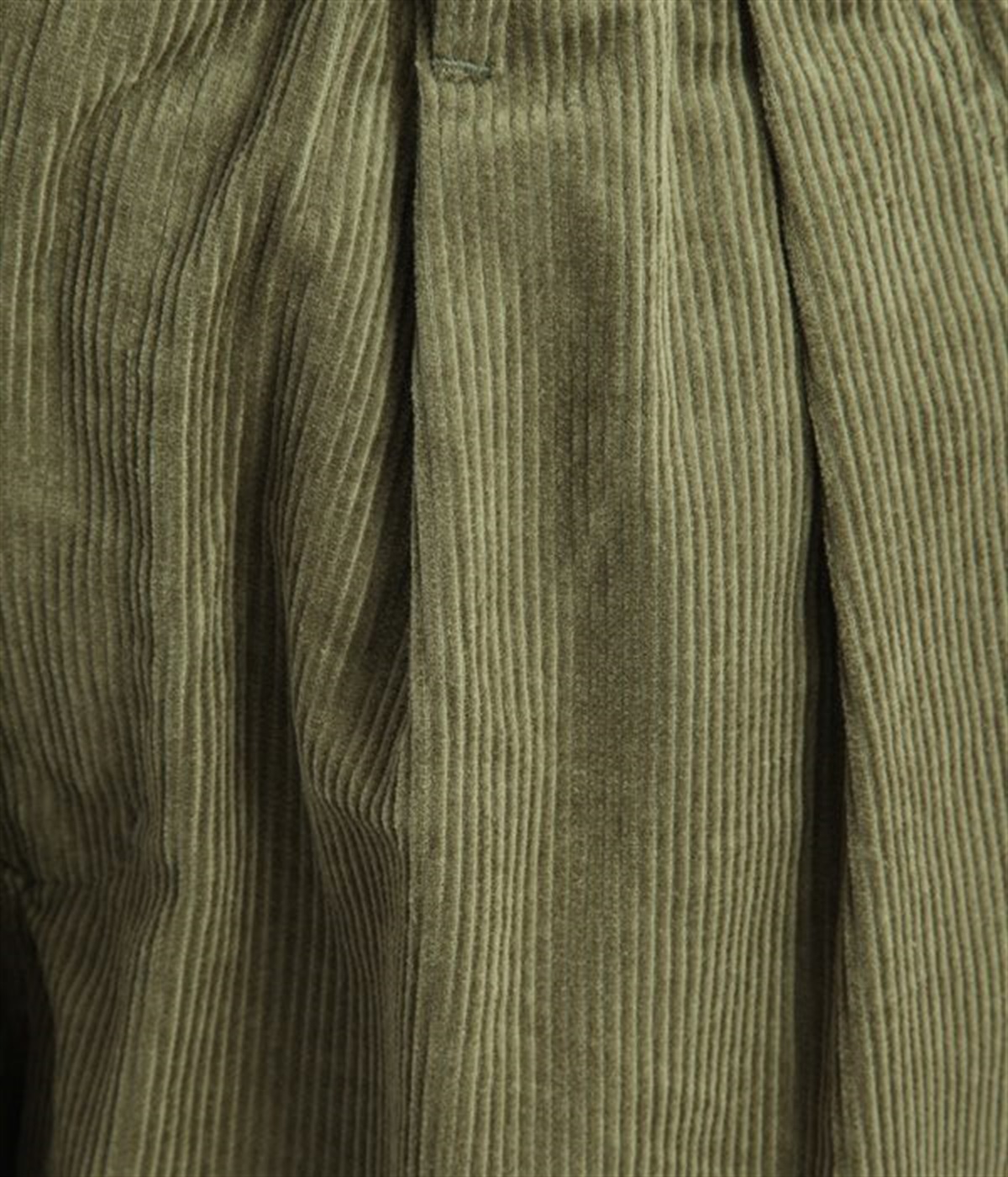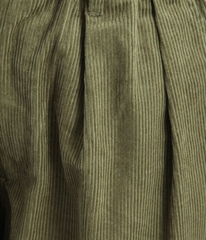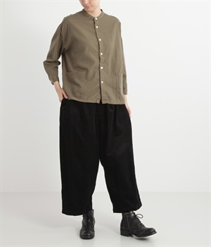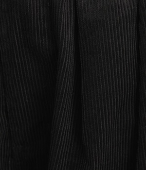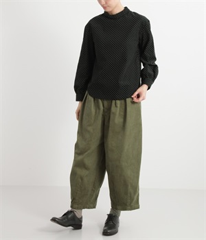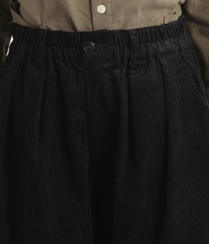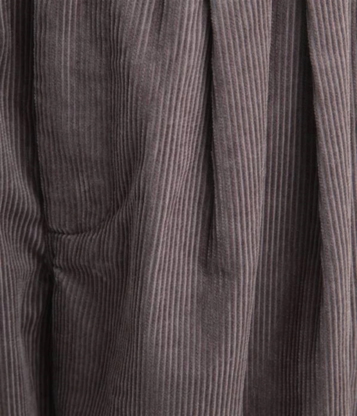 コットンのコーデュロイ生地でほどよい厚みがあり、ウォーム感たっぷりなワイドパンツです。ウエスト下にタックを施したゆったりシルエットながら、裾にダーツを入れて足もとのボリュームはセーブしています。フロントファスナー開閉にウエストゴム入りで着脱しやすく、穿き心地も快適。両サイドに便利なポケット付きです。