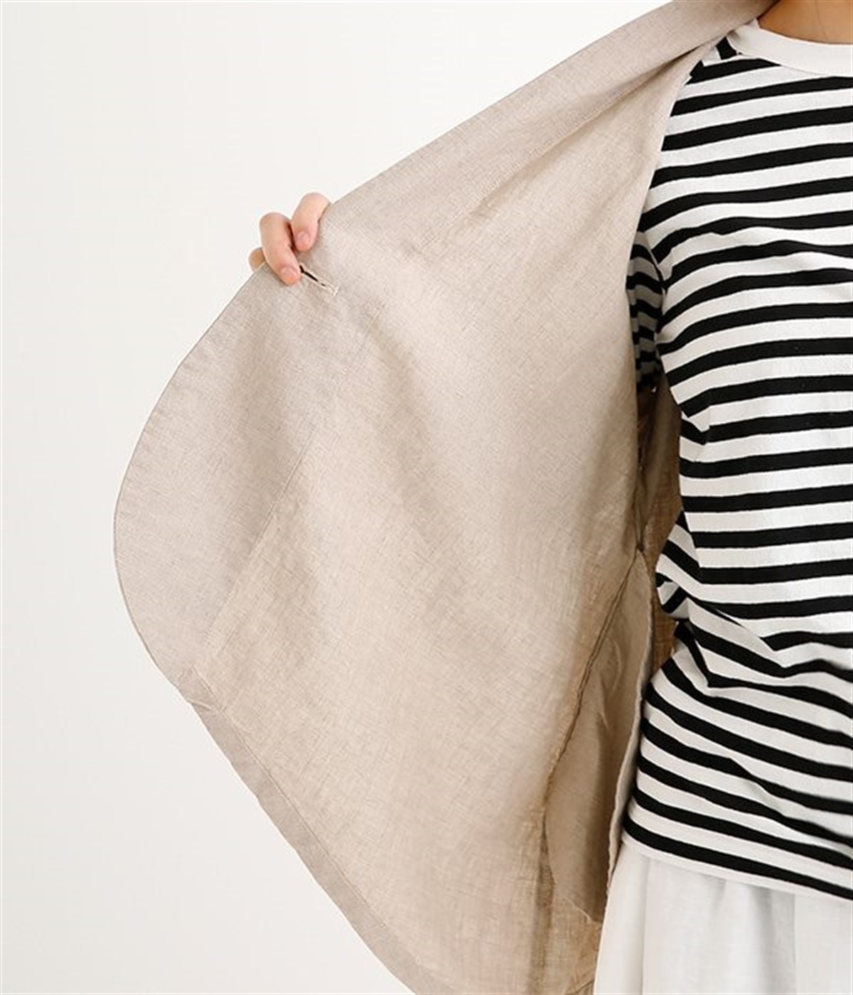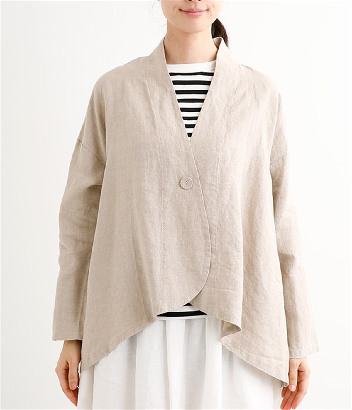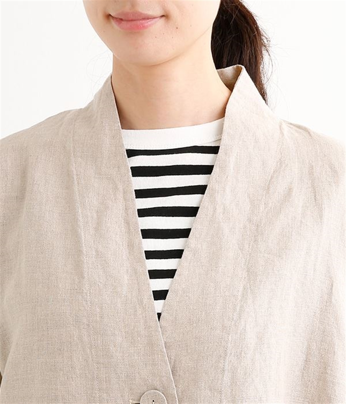 さらりとした肌触りと上品な光沢感が魅力的なリネン素材のジャケットです。前上がりのやや長めの丈なのでカジュアルにもきれいめにも使いやすく、大きめの一つボタンはシンプルなデザインに映えるアクセント。身幅をたっぷりととっているのでインナーを選ばず、すっきりとしたシルエットに仕上がります。両サイドにはポケット付きです。