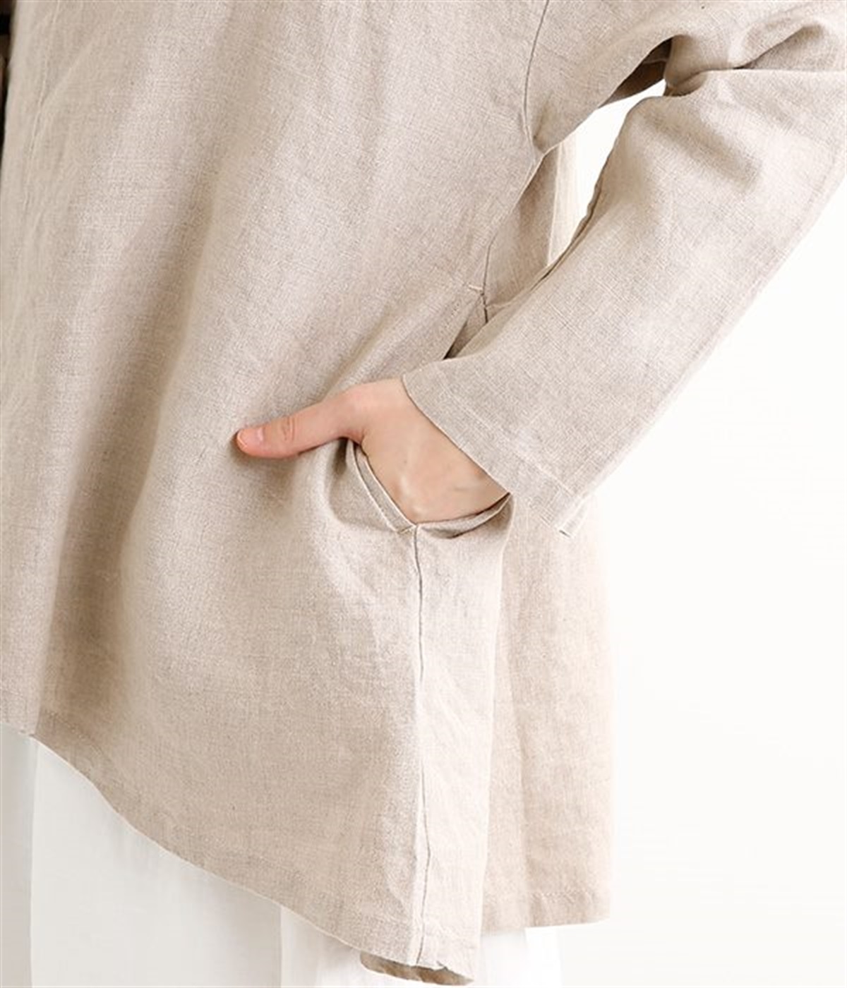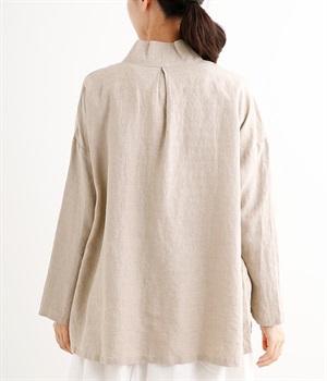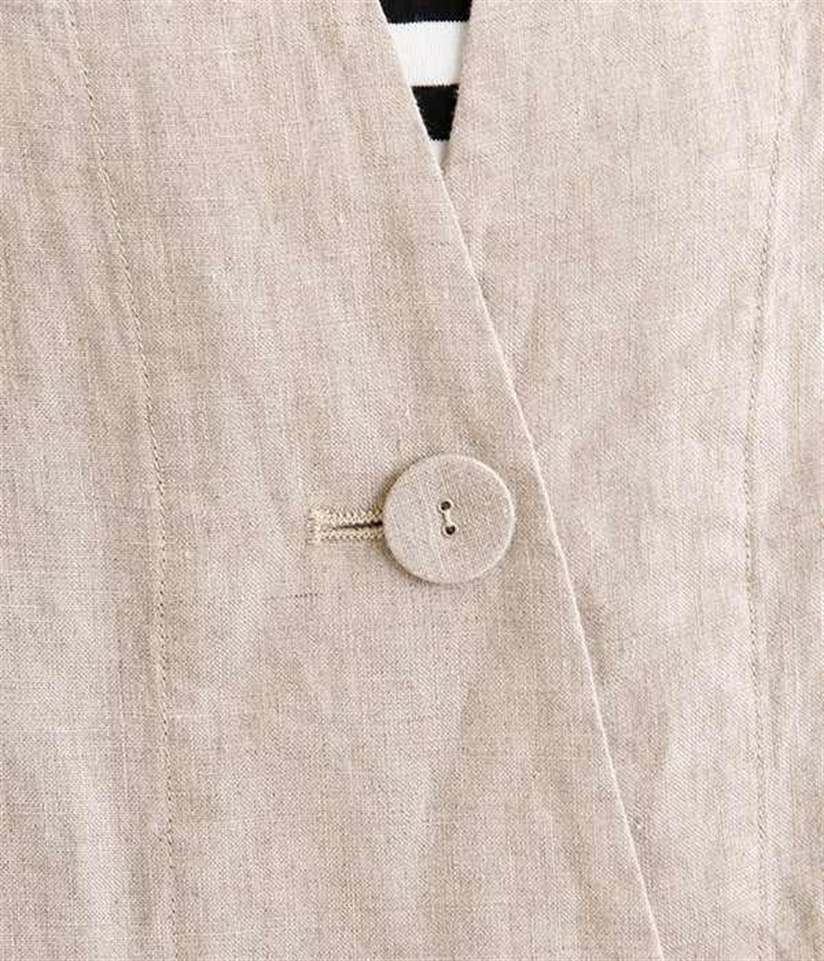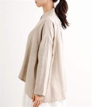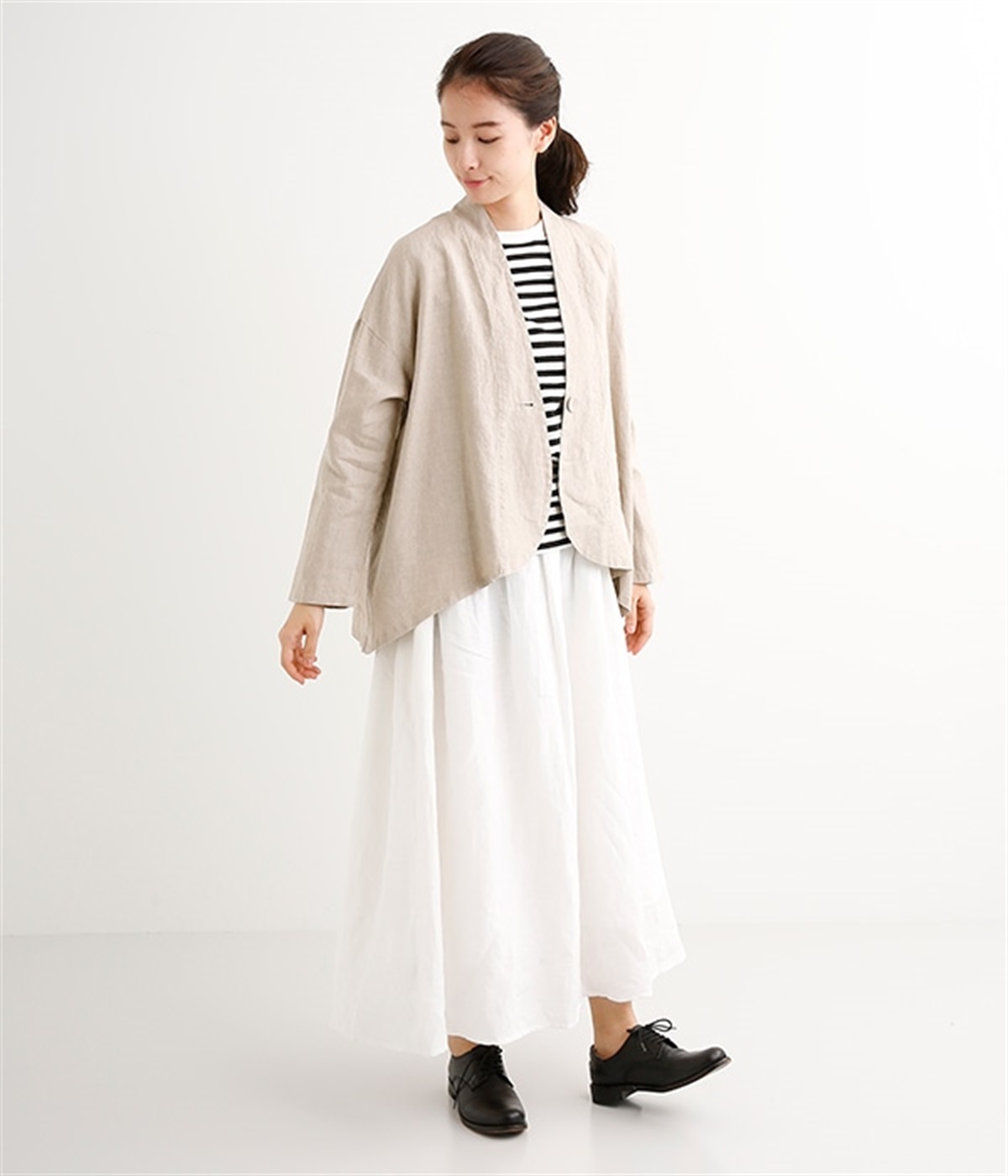 さらりとした肌触りと上品な光沢感が魅力的なリネン素材のジャケットです。前上がりのやや長めの丈なのでカジュアルにもきれいめにも使いやすく、大きめの一つボタンはシンプルなデザインに映えるアクセント。身幅をたっぷりととっているのでインナーを選ばず、すっきりとしたシルエットに仕上がります。両サイドにはポケット付きです。