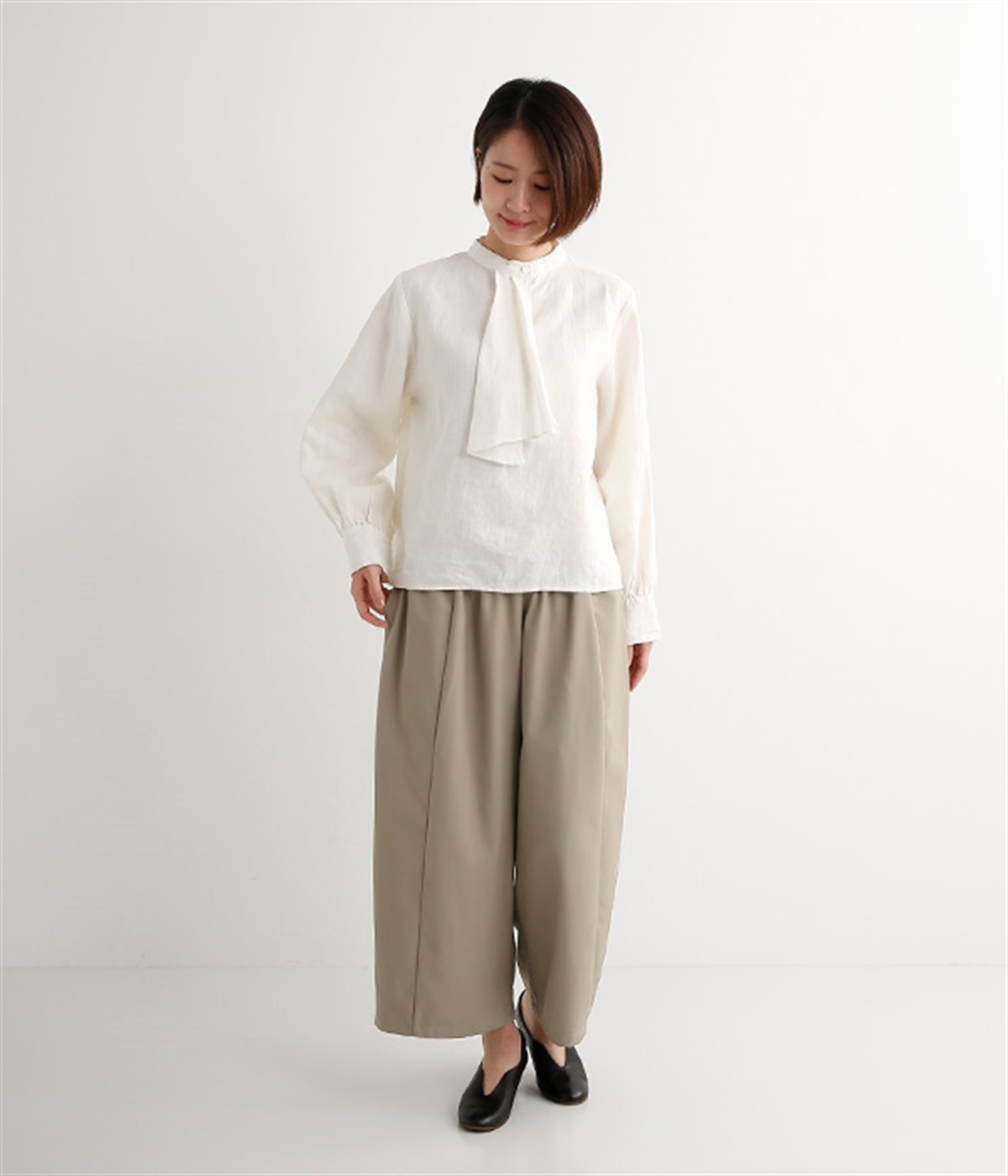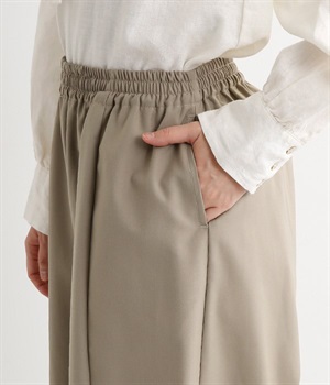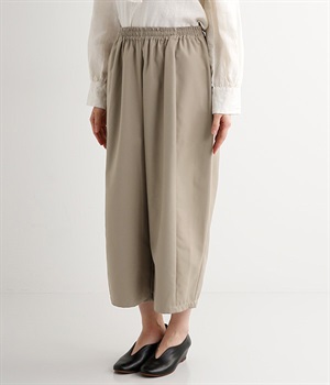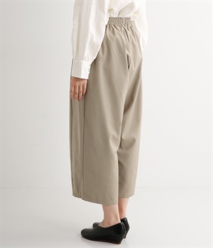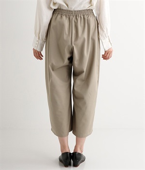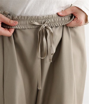 レーヨン混のしなやかな肌触りの生地で仕立てたパンツです。ラフな着心地になるよう股上はたっぷりととっていますが、タックを入れることで縦のラインを強調しているので、カジュアルになりすぎず上品に着こなせますし、スタイルよく見せてくれます。ウエストは総ゴム仕様で、はき心地のよさも◎。内側にヒモを付けているので、サイズ調節も可能です。洗練されたシンプルなつくりなので、合わせるトップスの柄やデザインを選ばず幅広いコーディネートが楽しめます。