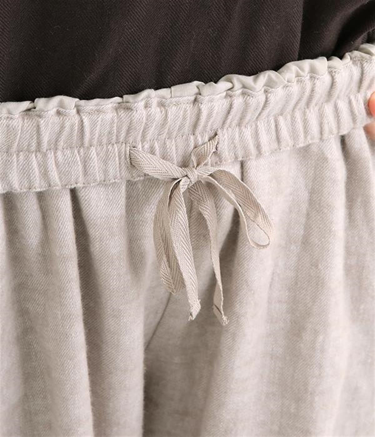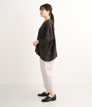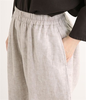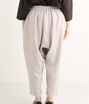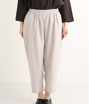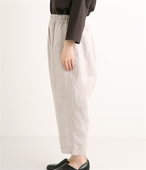 起毛加工をほどこしたリネン生地で薄手ながらあたたかさがあり、ふわっとした肌触りで優しい着心地のパンツです。股上を深く取ったデザインはラフにはきやすくこなれた印象。裾に向かってゆるやかにすぼむテーパードシルエットがバランスよくみせてくれます。ウエストはストレスフリーな総ゴム仕様。サイドポケット付きです。