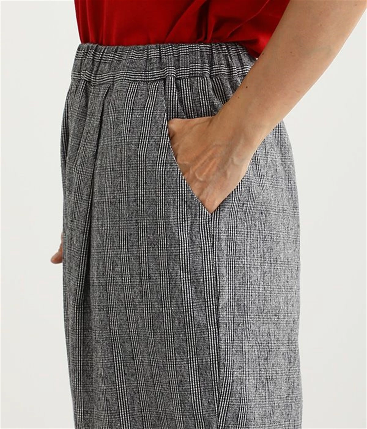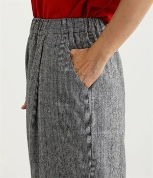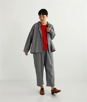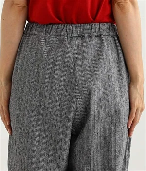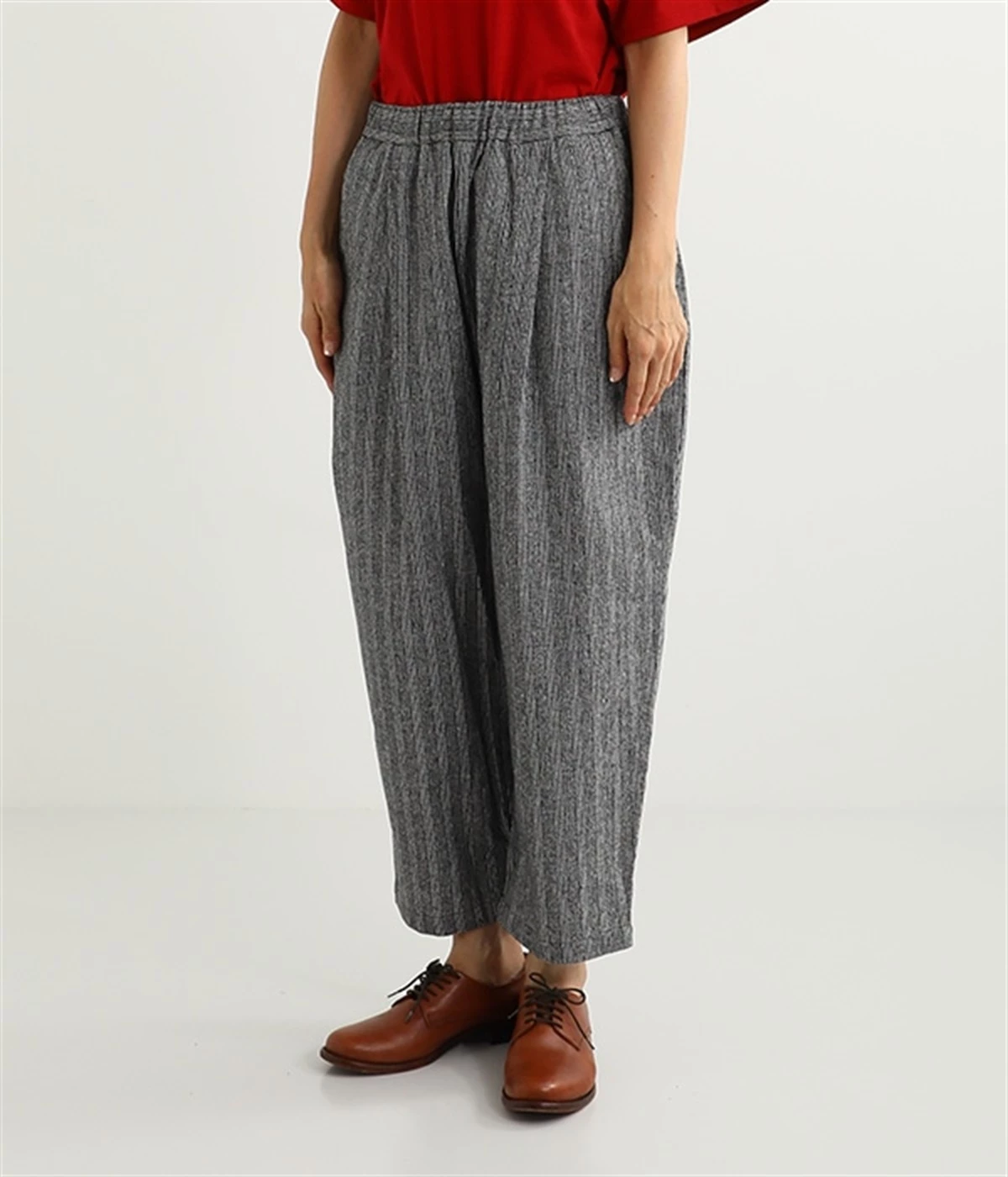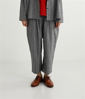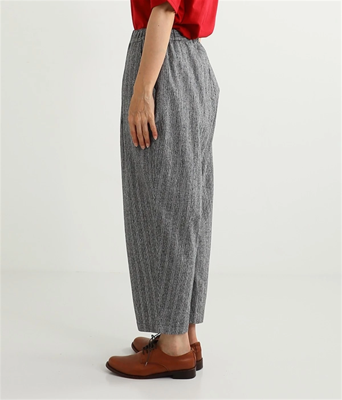 表面にうっすらと起毛加工を施したコットンビエラ生地で仕立てたパンツです。落ち着いて使いやすい色合いのチェック柄がポイント。ウエスト部分にタックの入ったテーパードシルエットにしているためはき心地よく、見た目はすっきりとした印象に仕上がります。ウエストはトップスをインしてもきれいに着こなせる後ろゴム仕様。