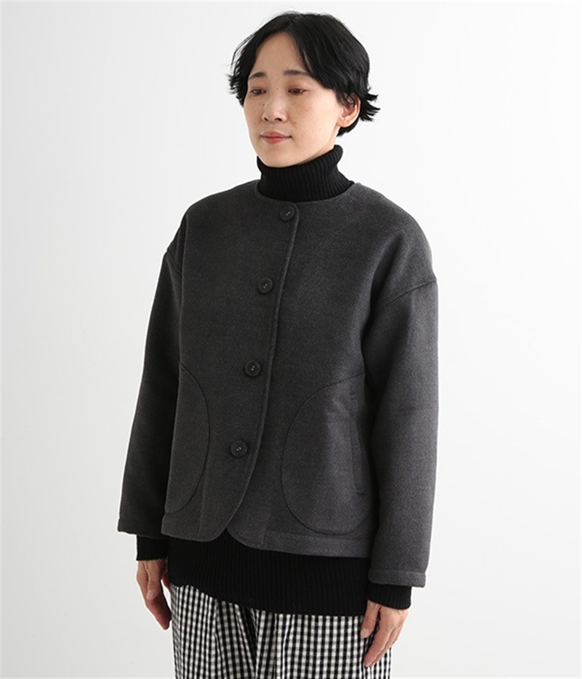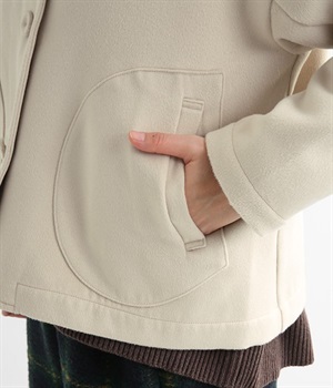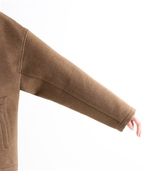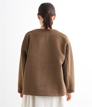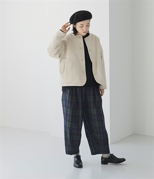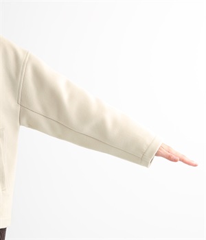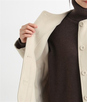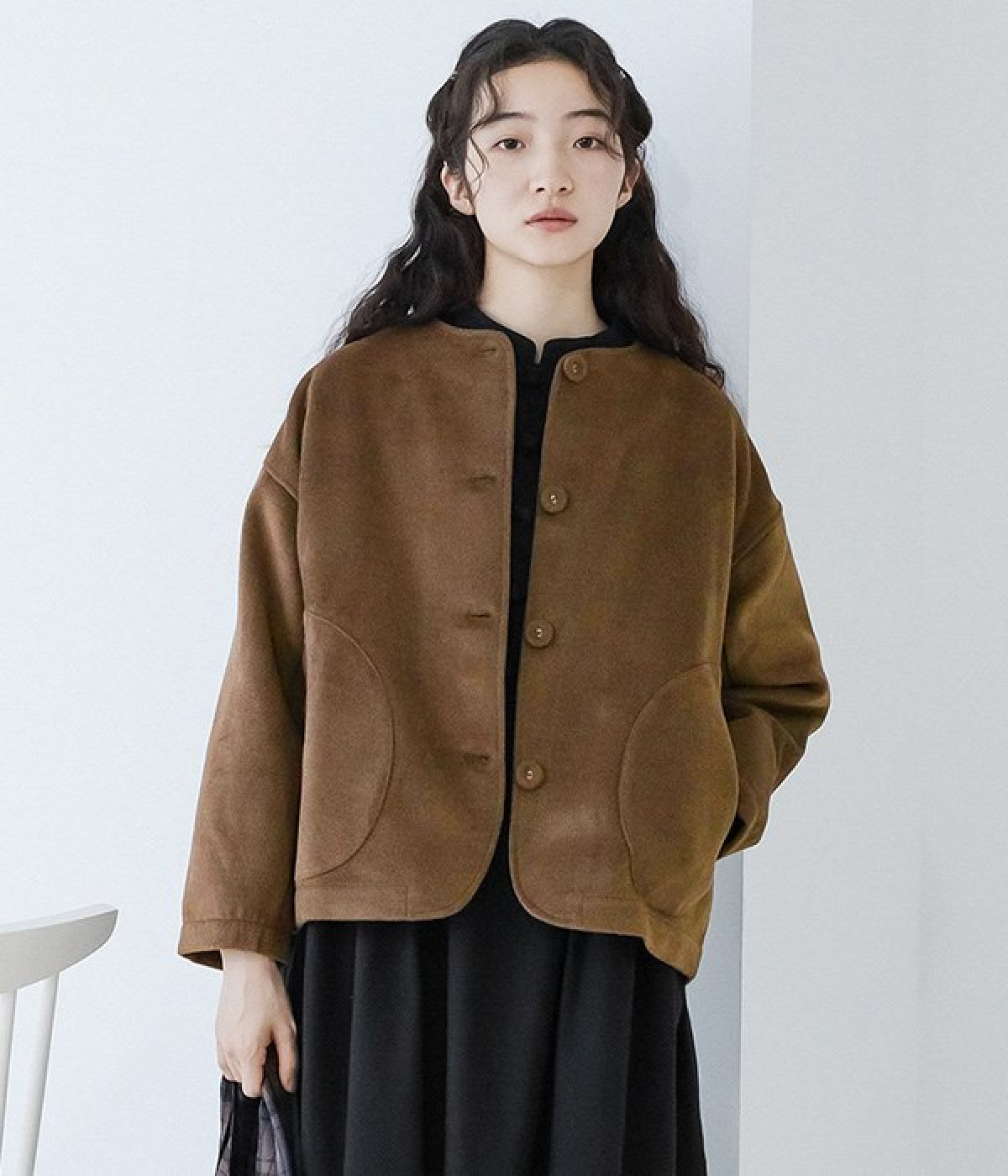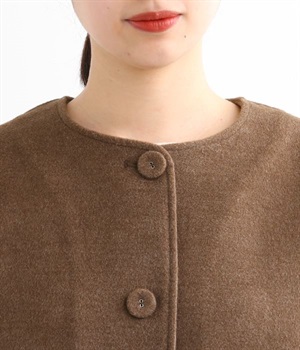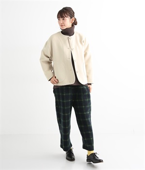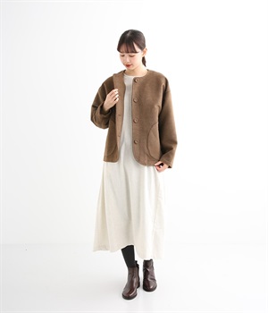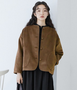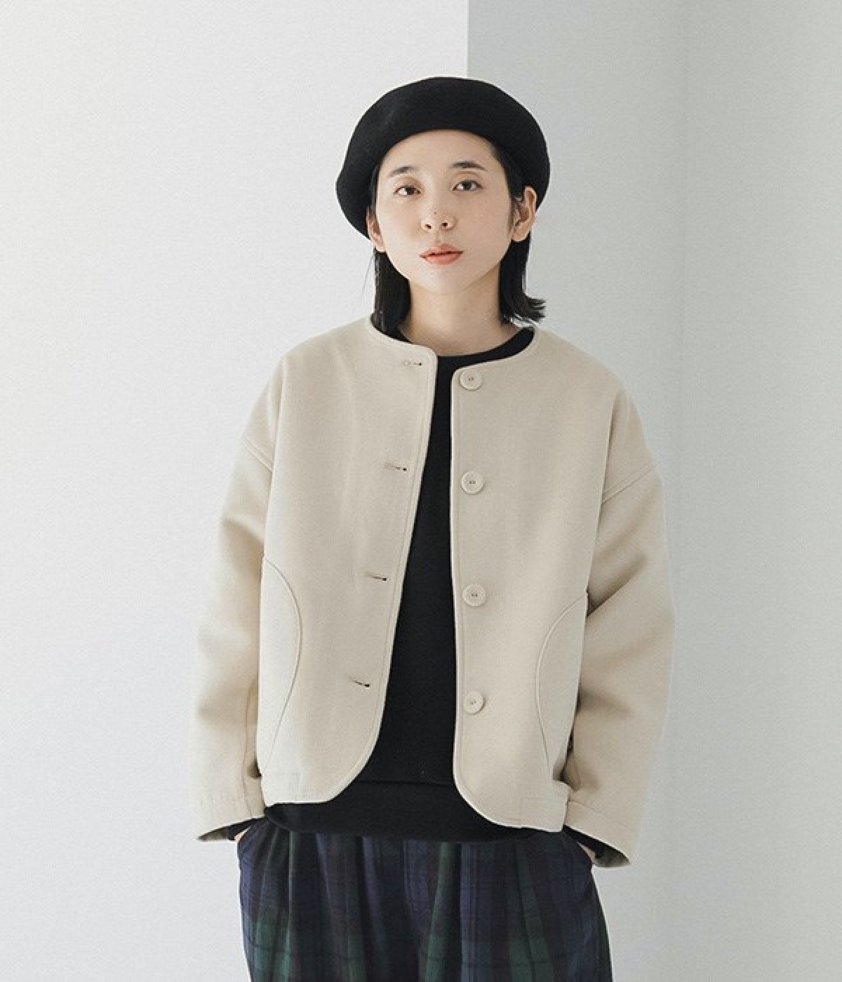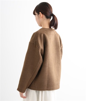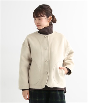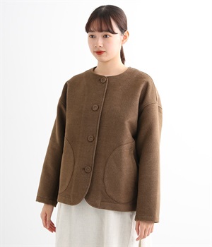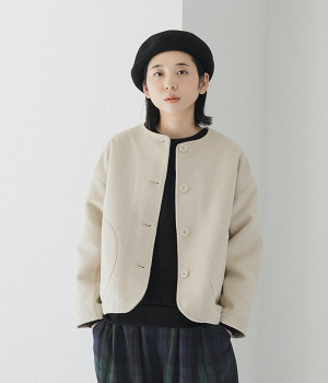 まるでウールメルトンのような上質な風合いを、ポリエステルとレーヨンの混紡素材で表現。軽くやさしい肌触りで、ストレスなく着られるジャケットです。生地表面を起毛させて、見た目も着心地もふんわりあたたかく。タートルネックやストールとも合わせやすいノーカラーのシンプルなデザインで、着こなしのアレンジも楽しめます。