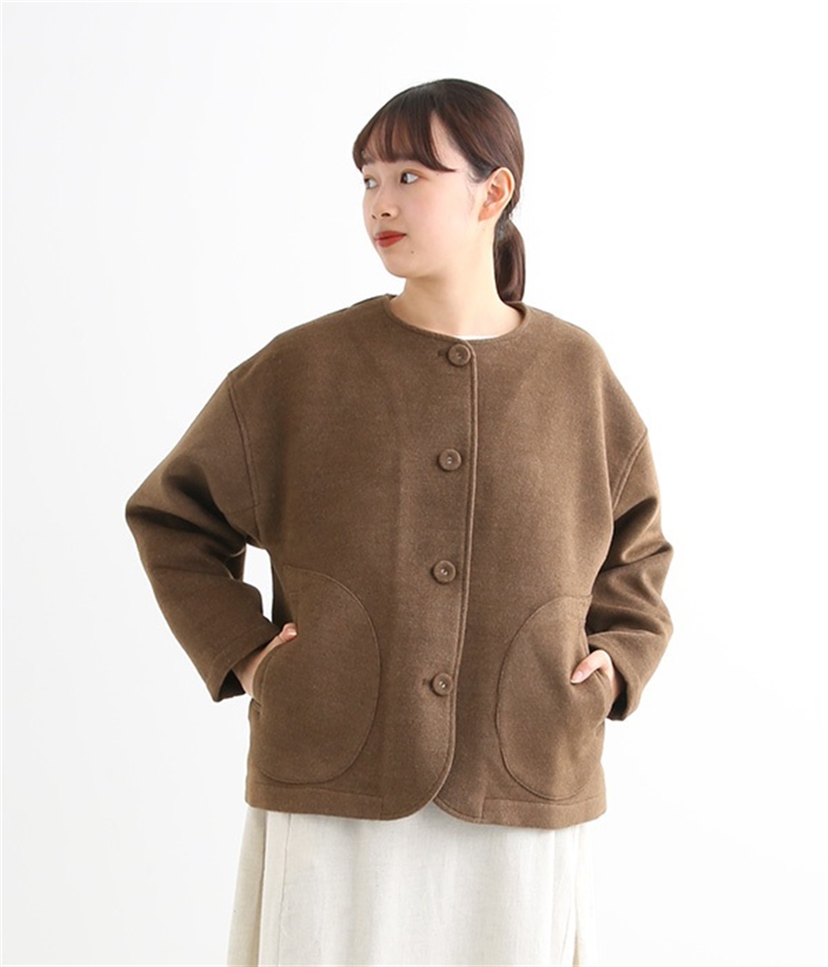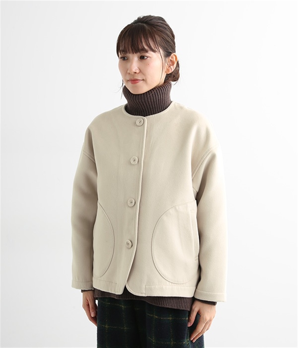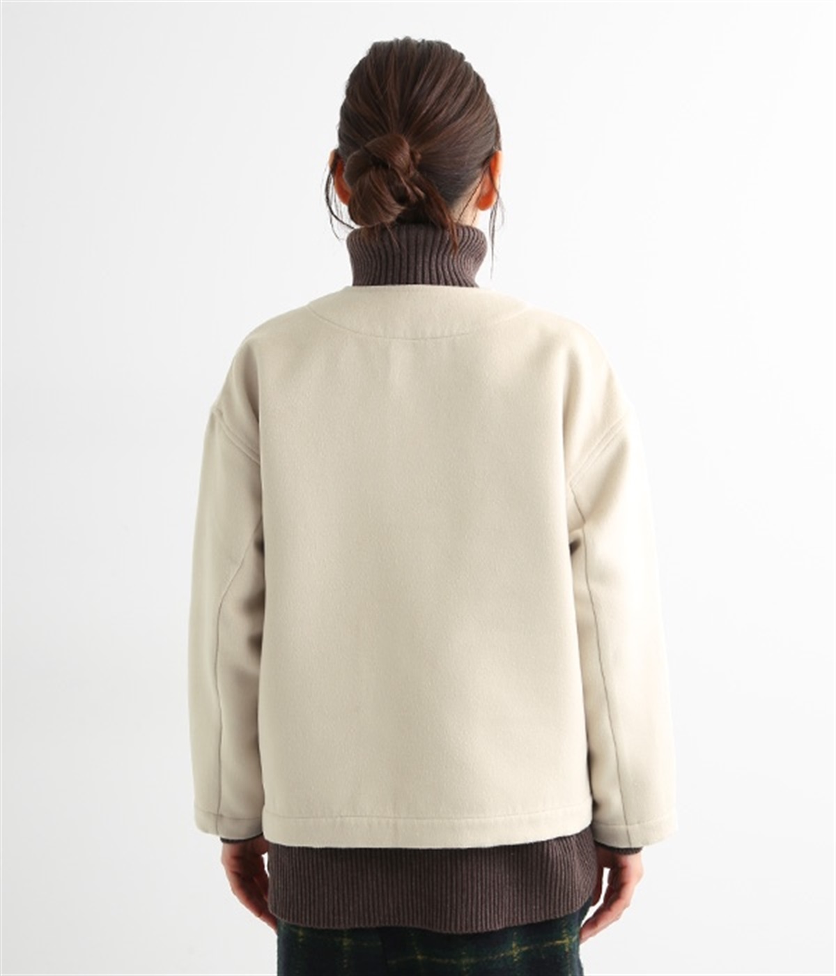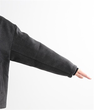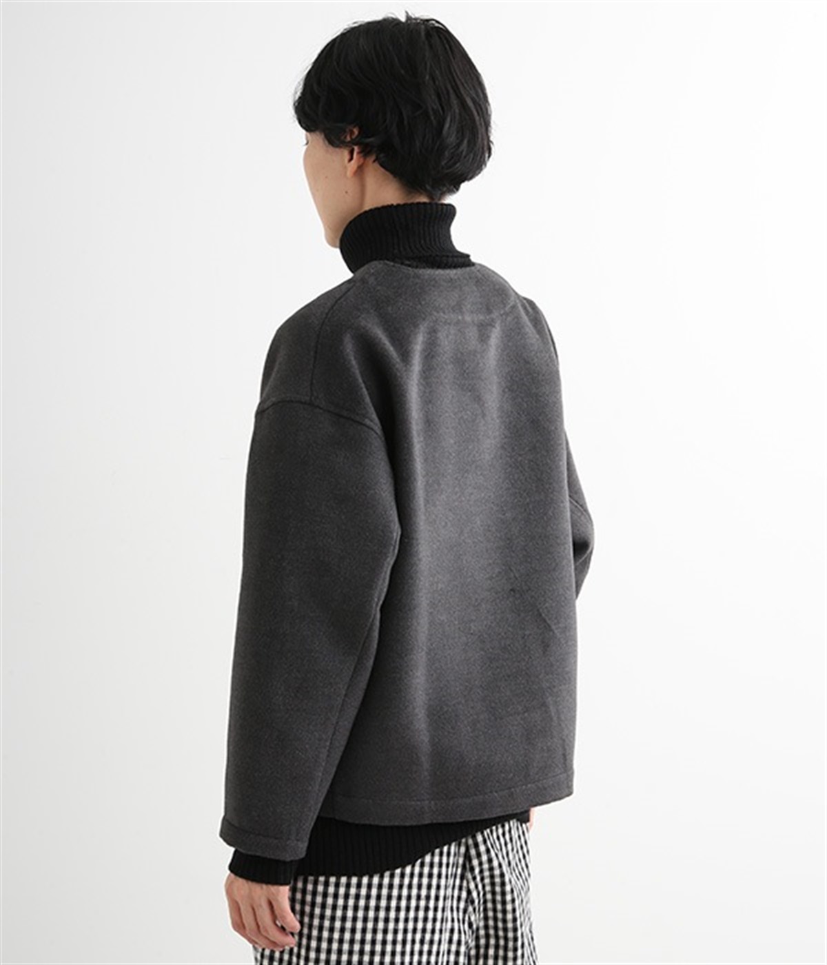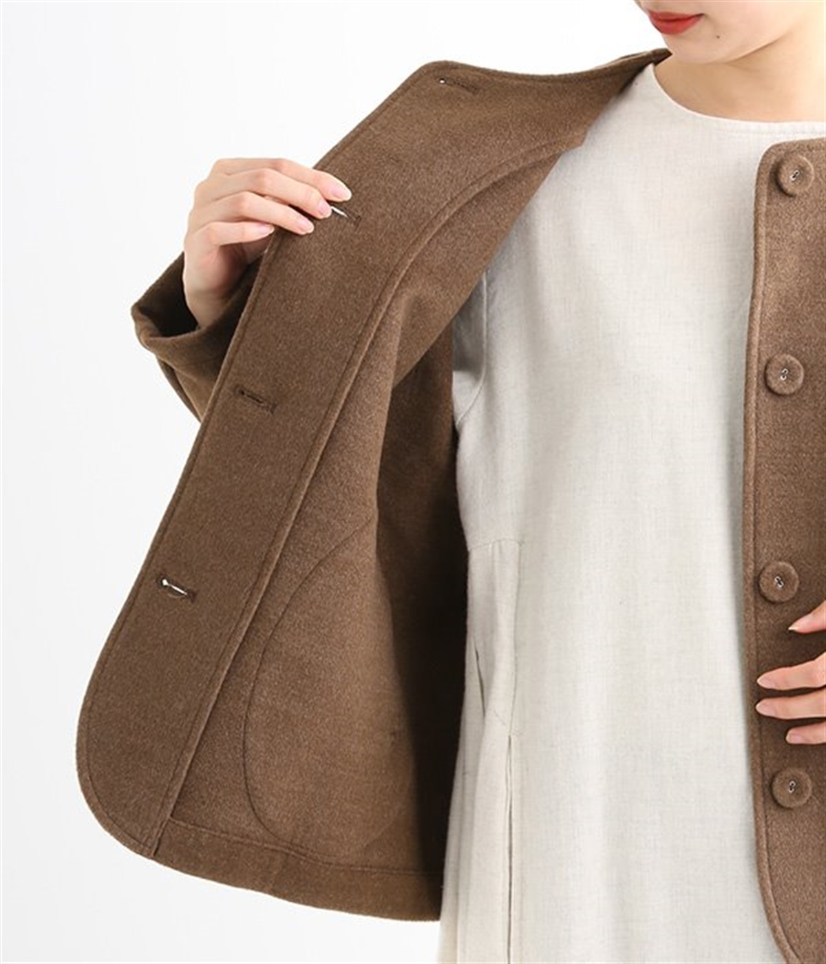 まるでウールメルトンのような上質な風合いを、ポリエステルとレーヨンの混紡素材で表現。軽くやさしい肌触りで、ストレスなく着られるジャケットです。生地表面を起毛させて、見た目も着心地もふんわりあたたかく。タートルネックやストールとも合わせやすいノーカラーのシンプルなデザインで、着こなしのアレンジも楽しめます。
