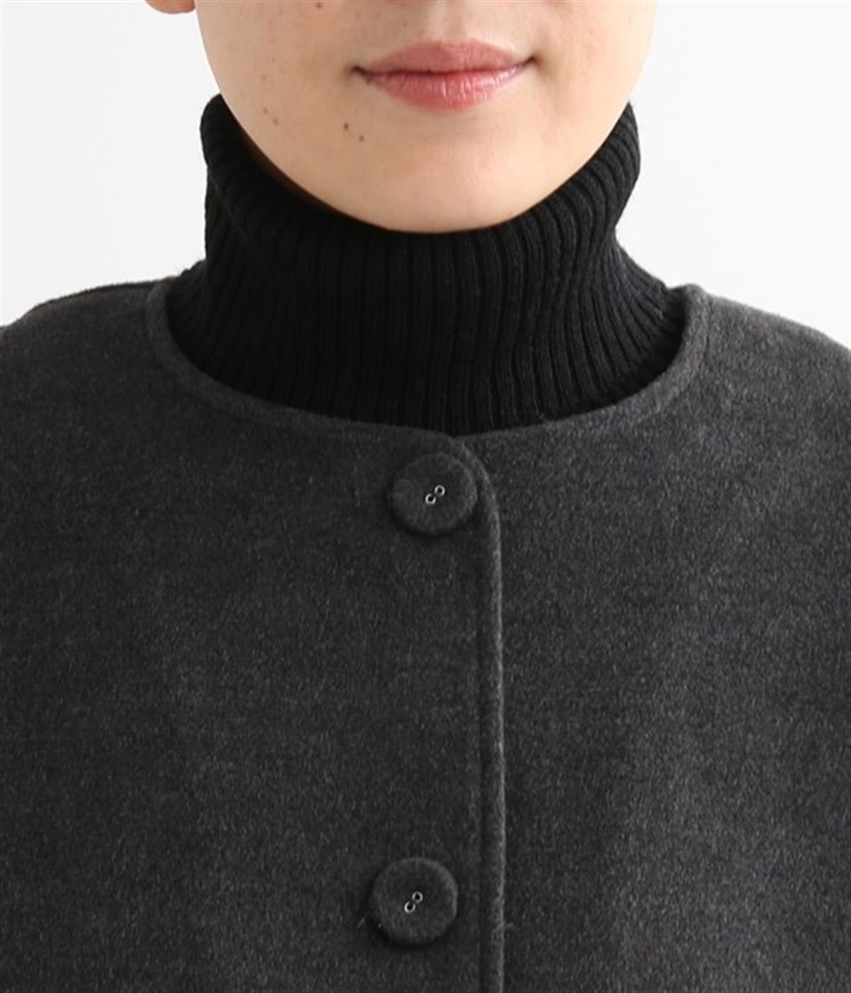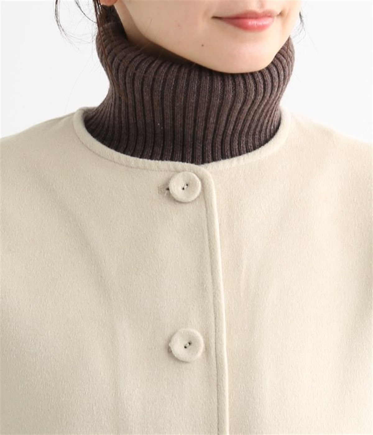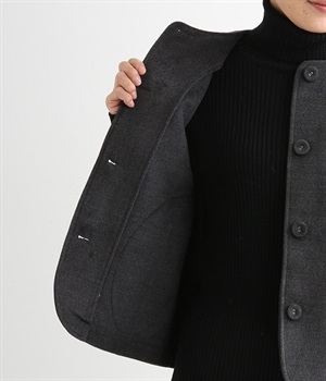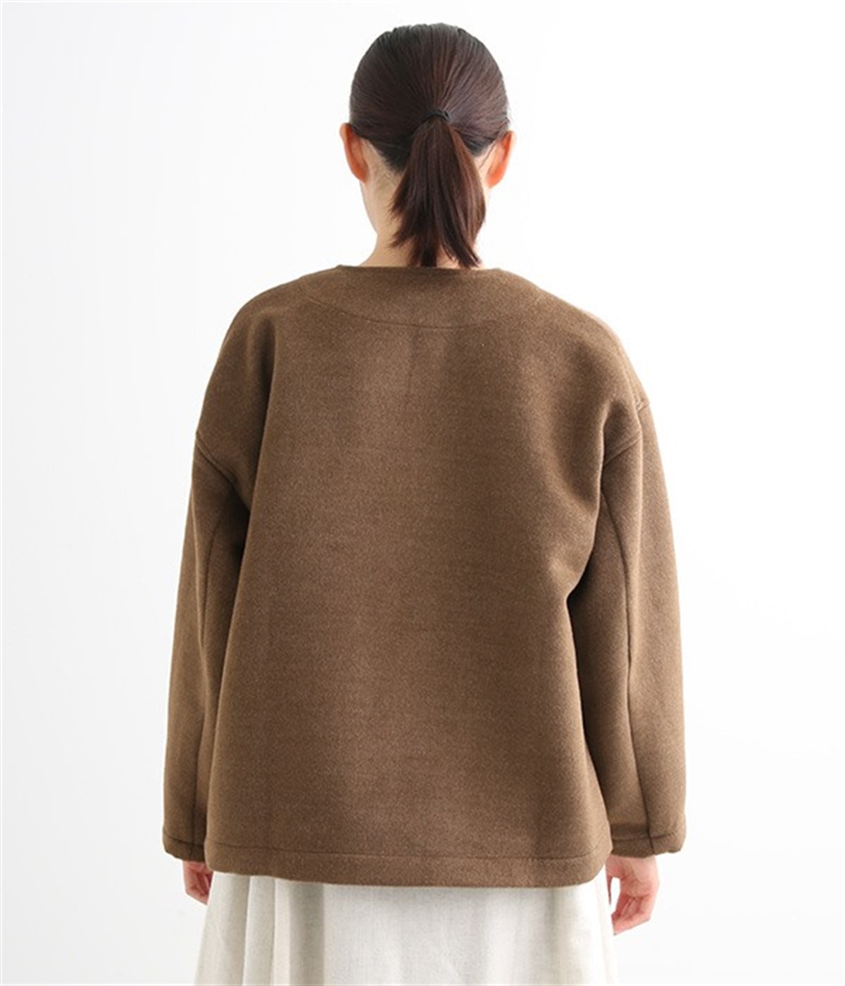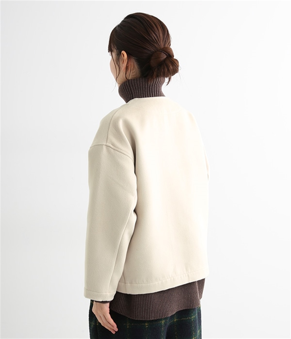 まるでウールメルトンのような上質な風合いを、ポリエステルとレーヨンの混紡素材で表現。軽くやさしい肌触りで、ストレスなく着られるジャケットです。生地表面を起毛させて、見た目も着心地もふんわりあたたかく。タートルネックやストールとも合わせやすいノーカラーのシンプルなデザインで、着こなしのアレンジも楽しめます。