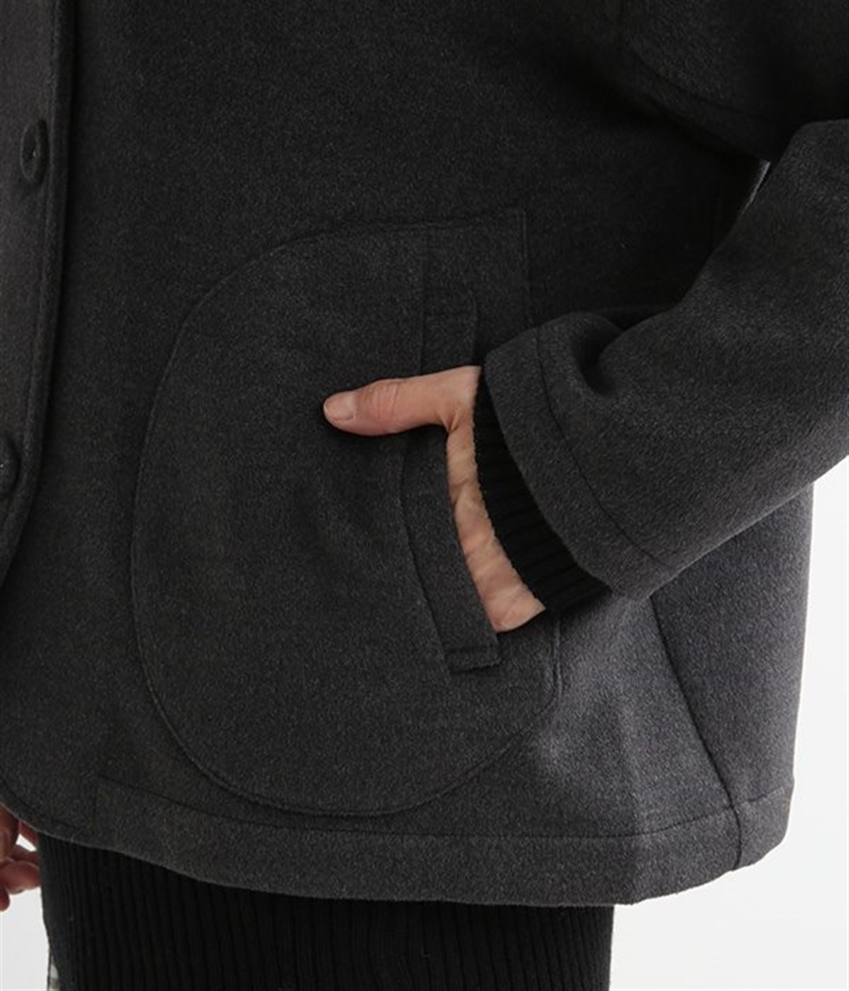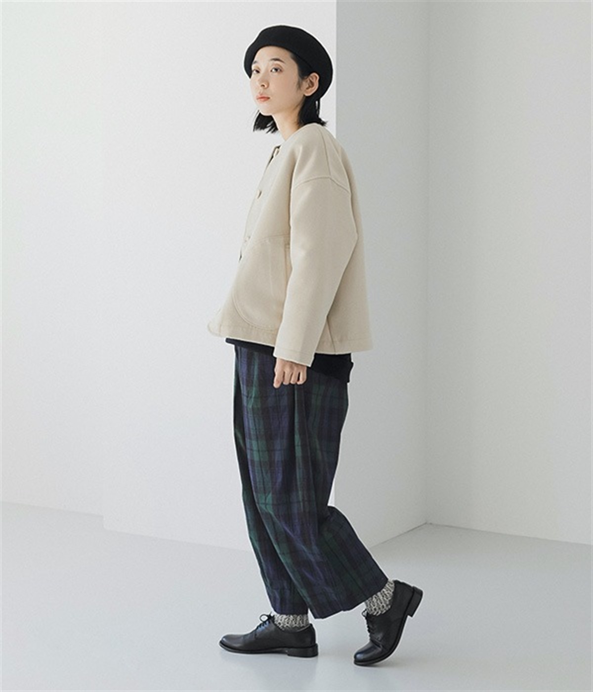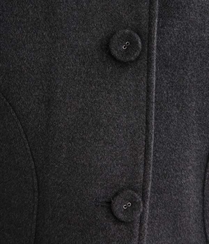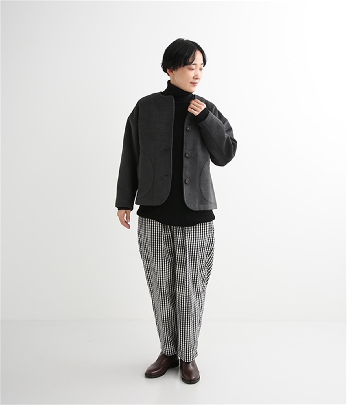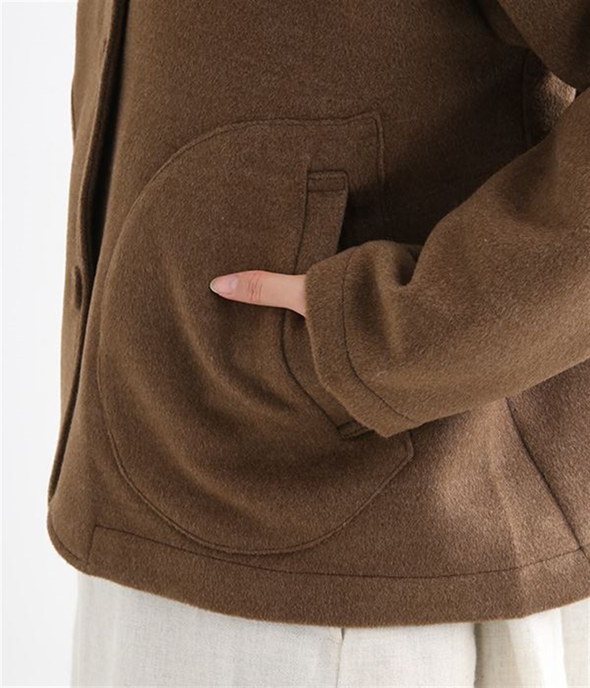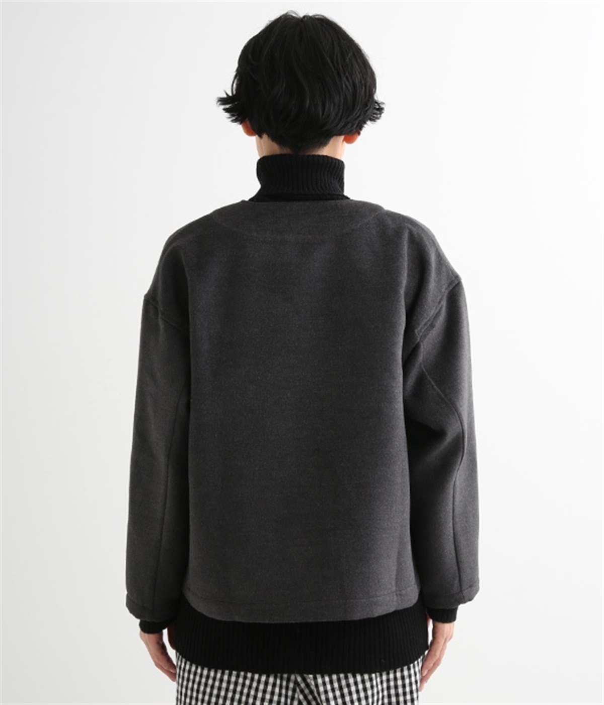 まるでウールメルトンのような上質な風合いを、ポリエステルとレーヨンの混紡素材で表現。軽くやさしい肌触りで、ストレスなく着られるジャケットです。生地表面を起毛させて、見た目も着心地もふんわりあたたかく。タートルネックやストールとも合わせやすいノーカラーのシンプルなデザインで、着こなしのアレンジも楽しめます。