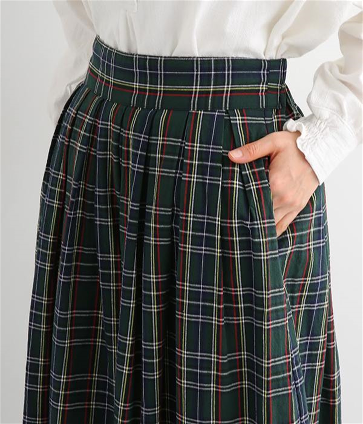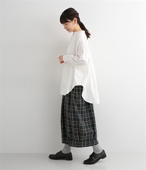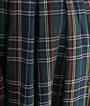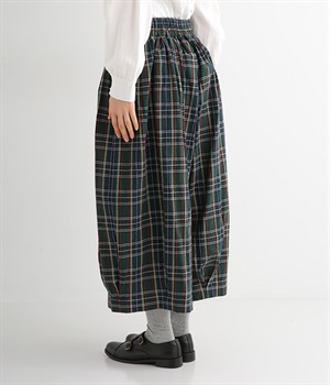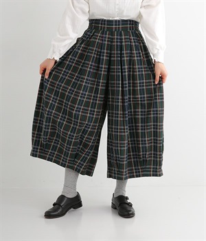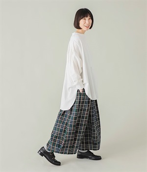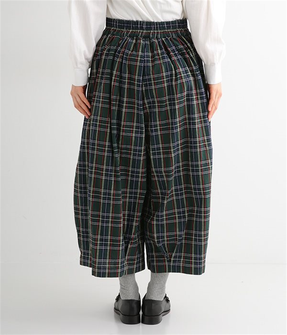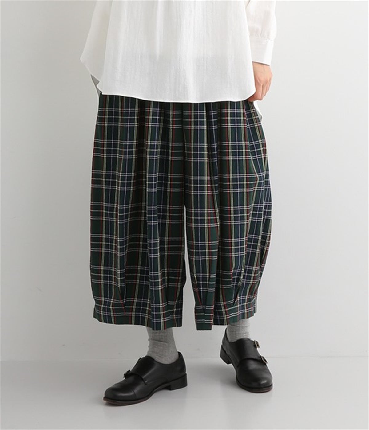 さらりとした風合いのコットンのオックスフォード生地を使用したパンツです。ウエストは後ろ側のみゴム仕様で、トップスの裾をインした着こなしにも対応。ウエスト下と裾にはタックを施し、こなれ感のあるシルエットに仕上げました。 トラッドなチェック柄がコーディネートのアクセントにぴったり。シンプルなニットやブラウスに合わせるだけでサマになります。
