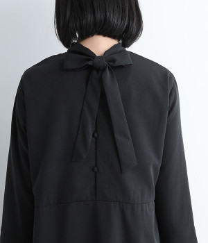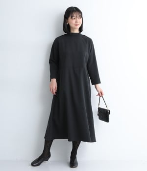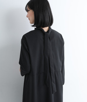 ハイネック&バックリボンの首もとで装いをクラシカルに飾るワンピース。するりとした落ち感と光沢、しなやかさを持つ上品なサージ生地を使用しました。ウエスト切り替えを高めにすることで自然にゆったりと広がりが生まれ、きれいめな印象の中に女性らしさをプラス。後ろのボタンは同生地を使用したくるみボタンで統一感を出しています。身頃から袖までの総裏付きです。