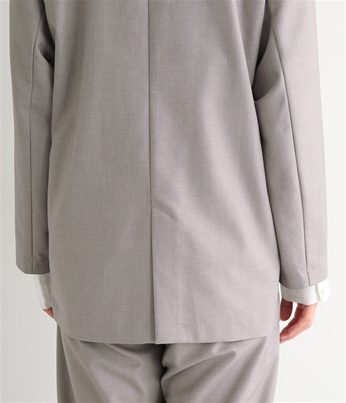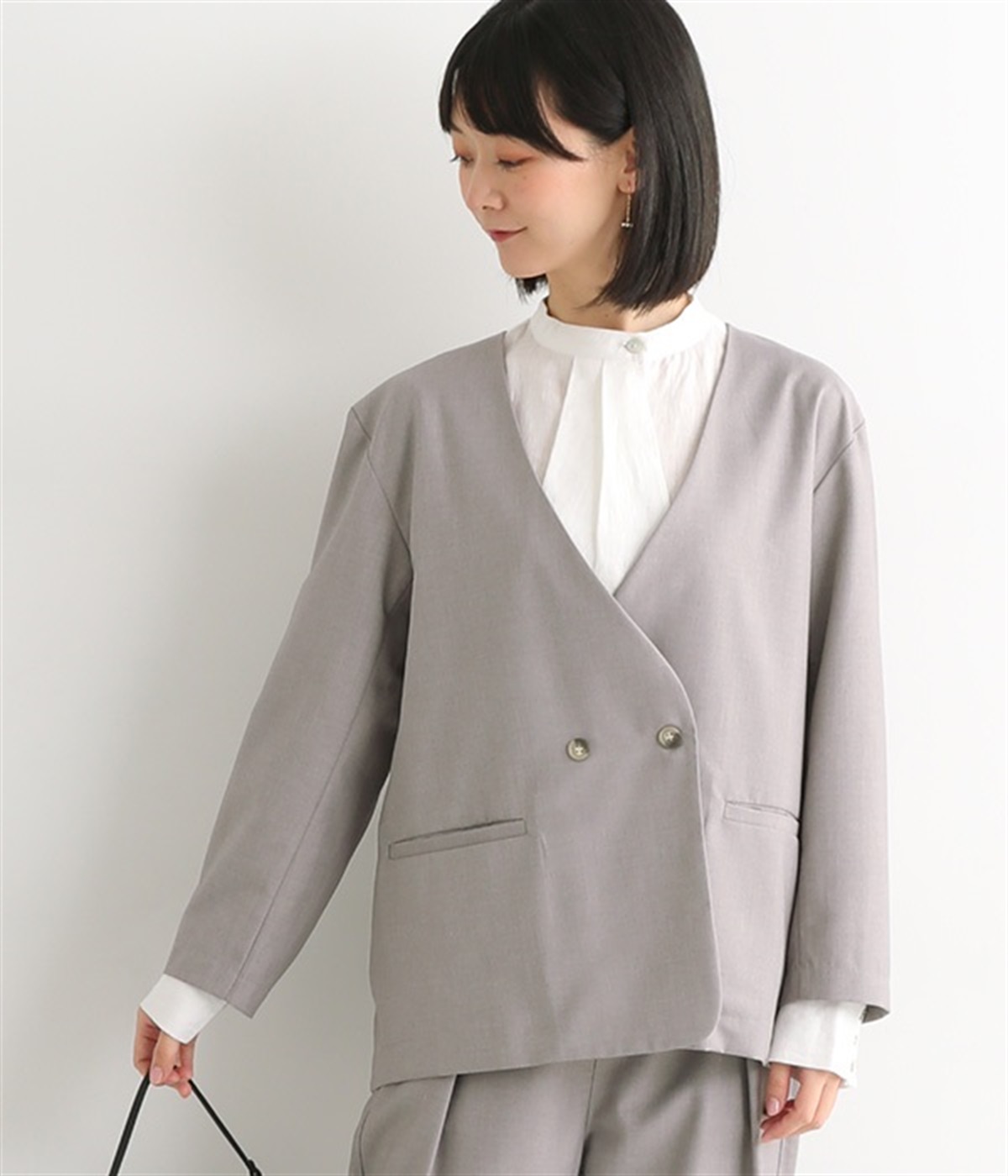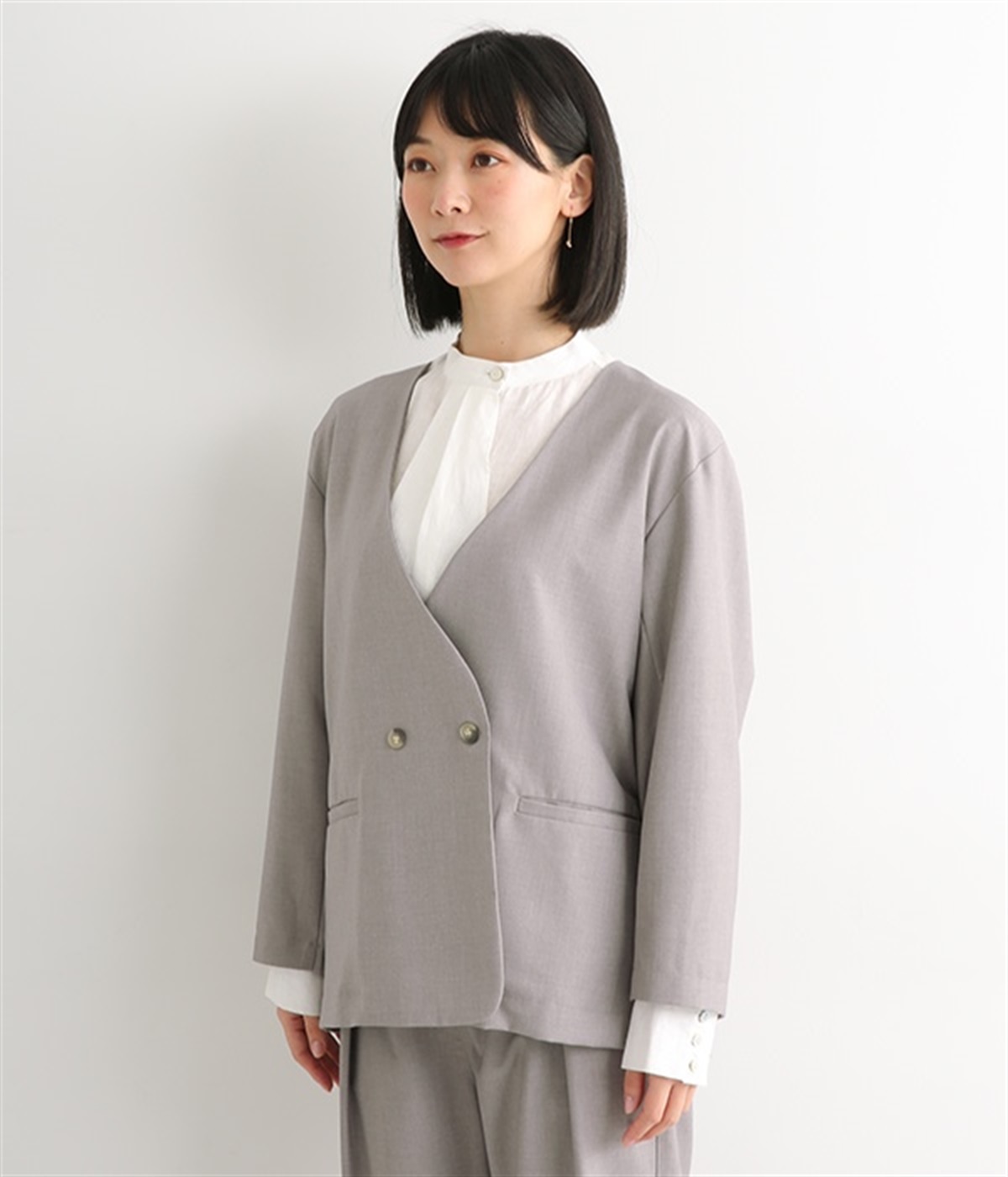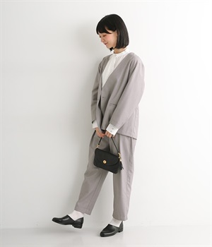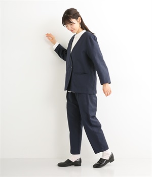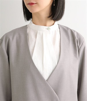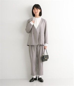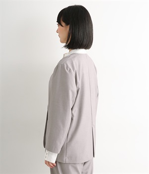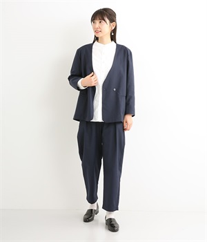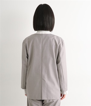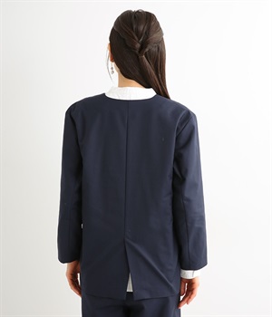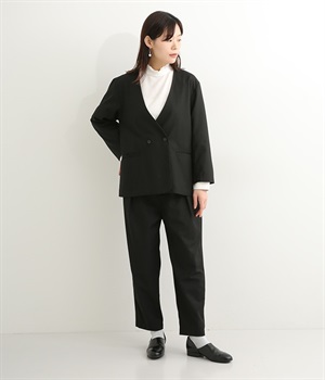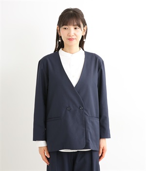 ほどよい光沢のあるサージ生地を使用したジャケットです。ダブル前立てのきちんとしたデザインで、フォーマルシーンやビジネスにも対応してくれます。裏地なしでも透けにくく安心して着用できます。広めに開いたノーカラーはインナーを選ばず、首や胸もとにデザインのあるブラウスとも相性抜群。同素材のパンツとセットアップ風に着こなすのもおすすめです。