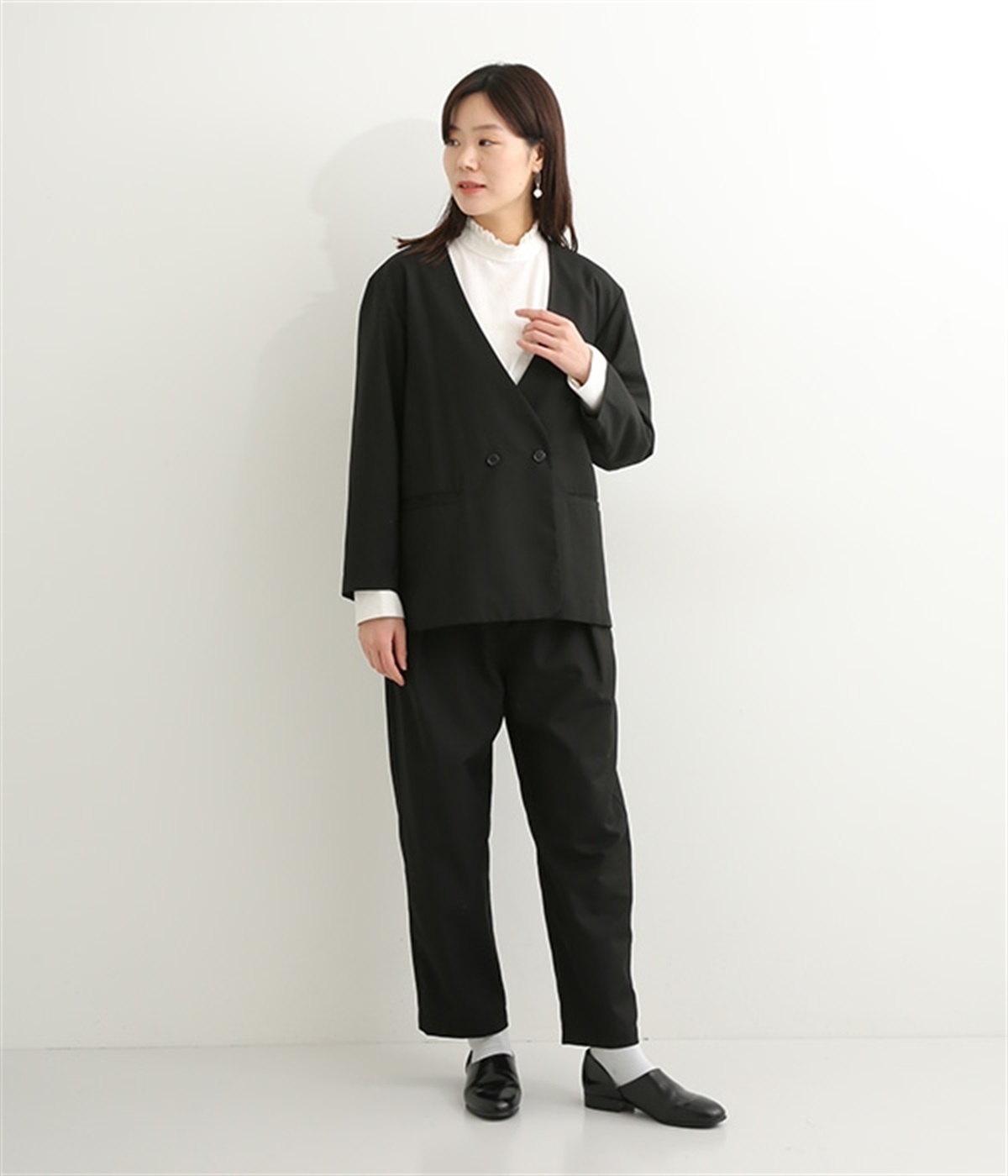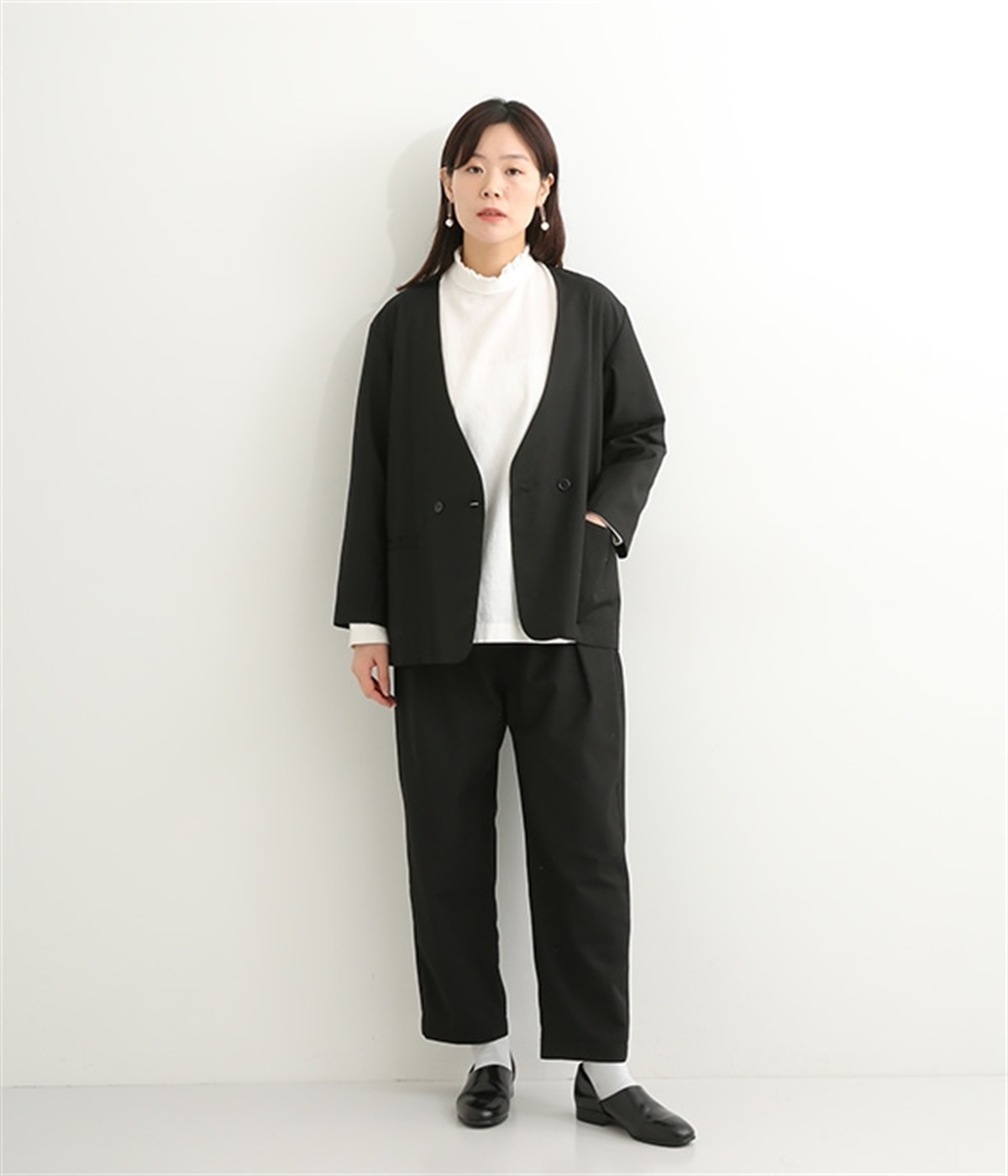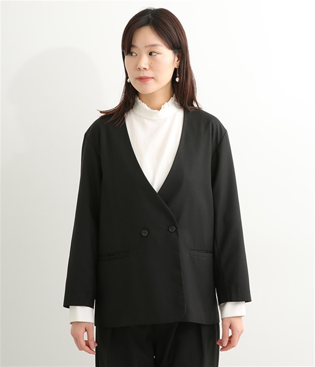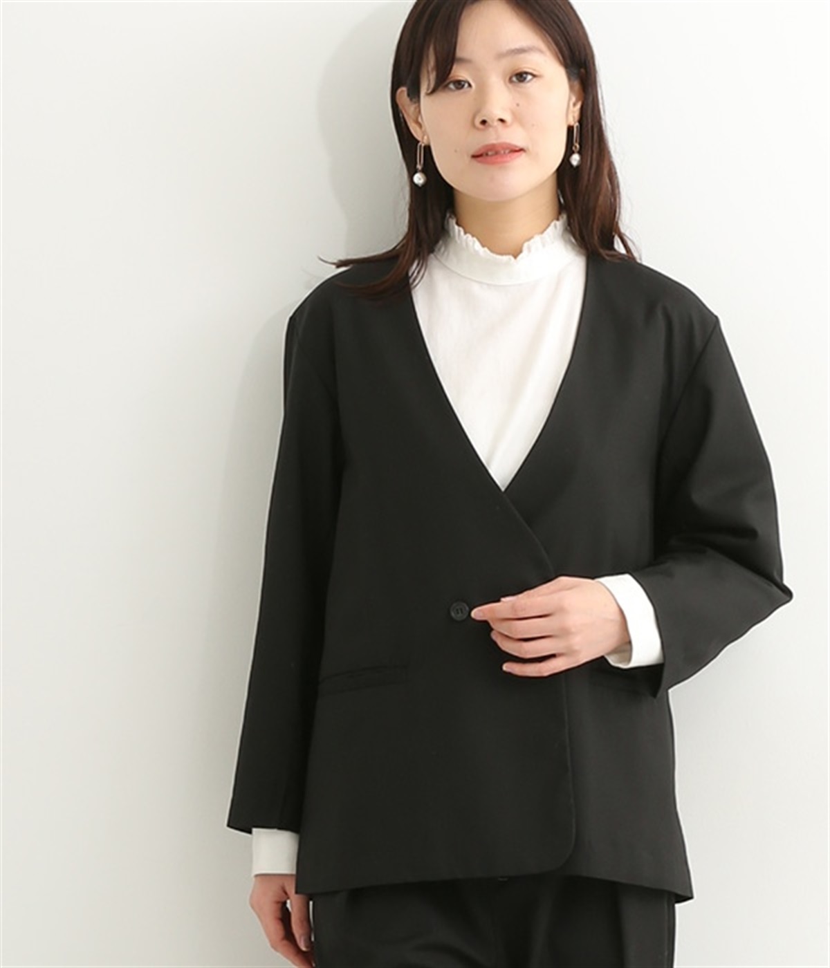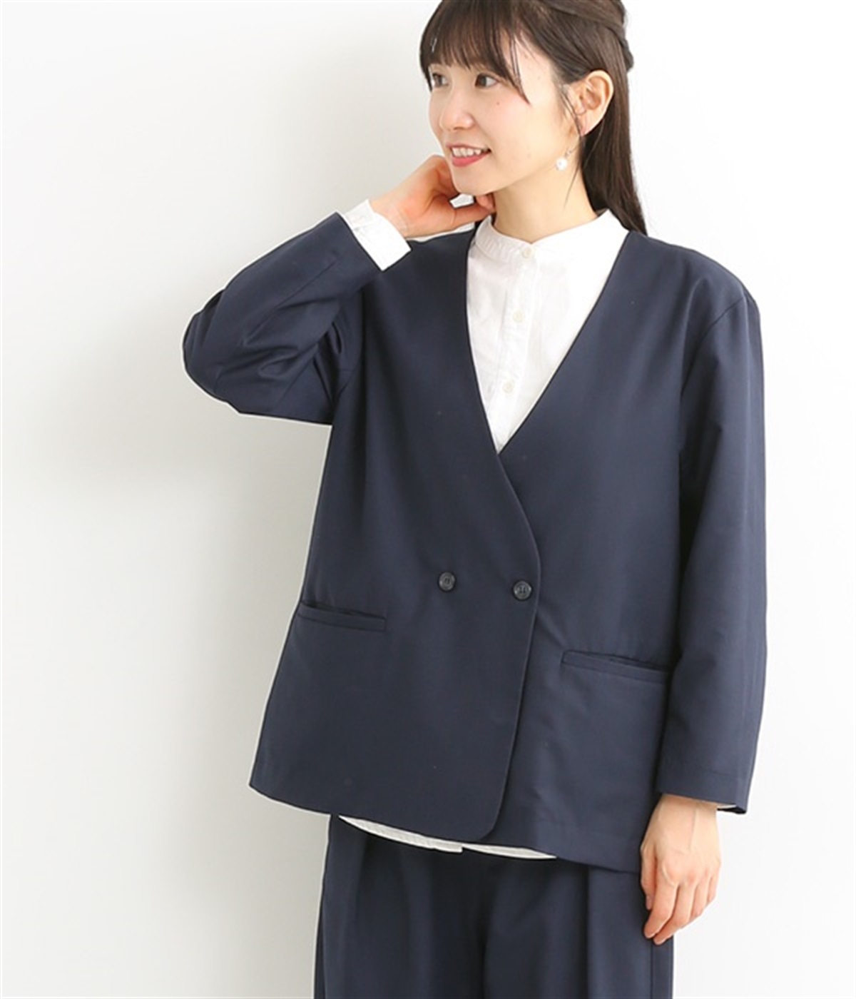 ほどよい光沢のあるサージ生地を使用したジャケットです。ダブル前立てのきちんとしたデザインで、フォーマルシーンやビジネスにも対応してくれます。裏地なしでも透けにくく安心して着用できます。広めに開いたノーカラーはインナーを選ばず、首や胸もとにデザインのあるブラウスとも相性抜群。同素材のパンツとセットアップ風に着こなすのもおすすめです。