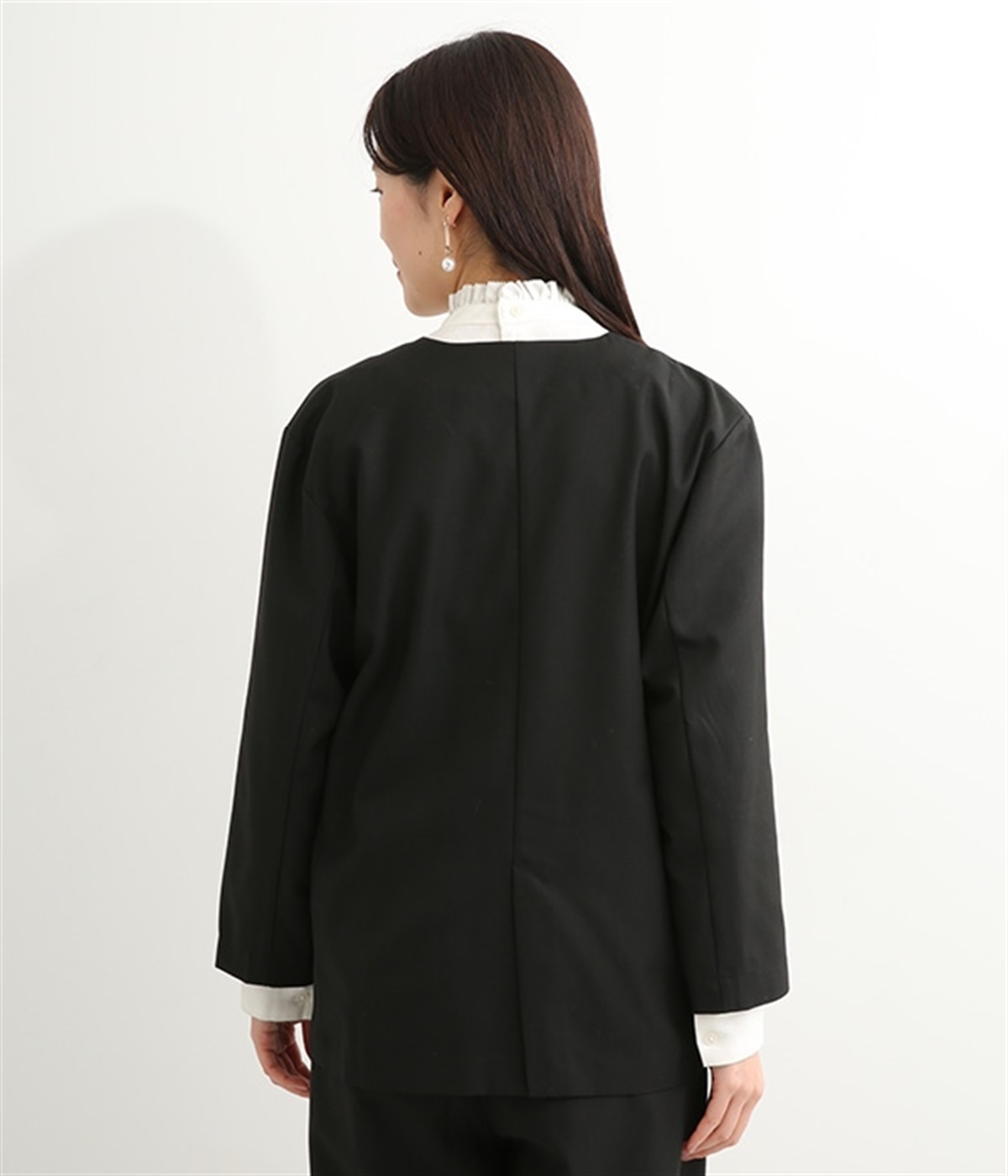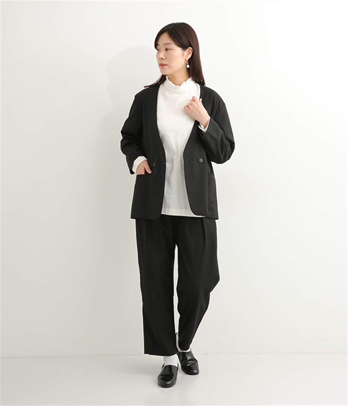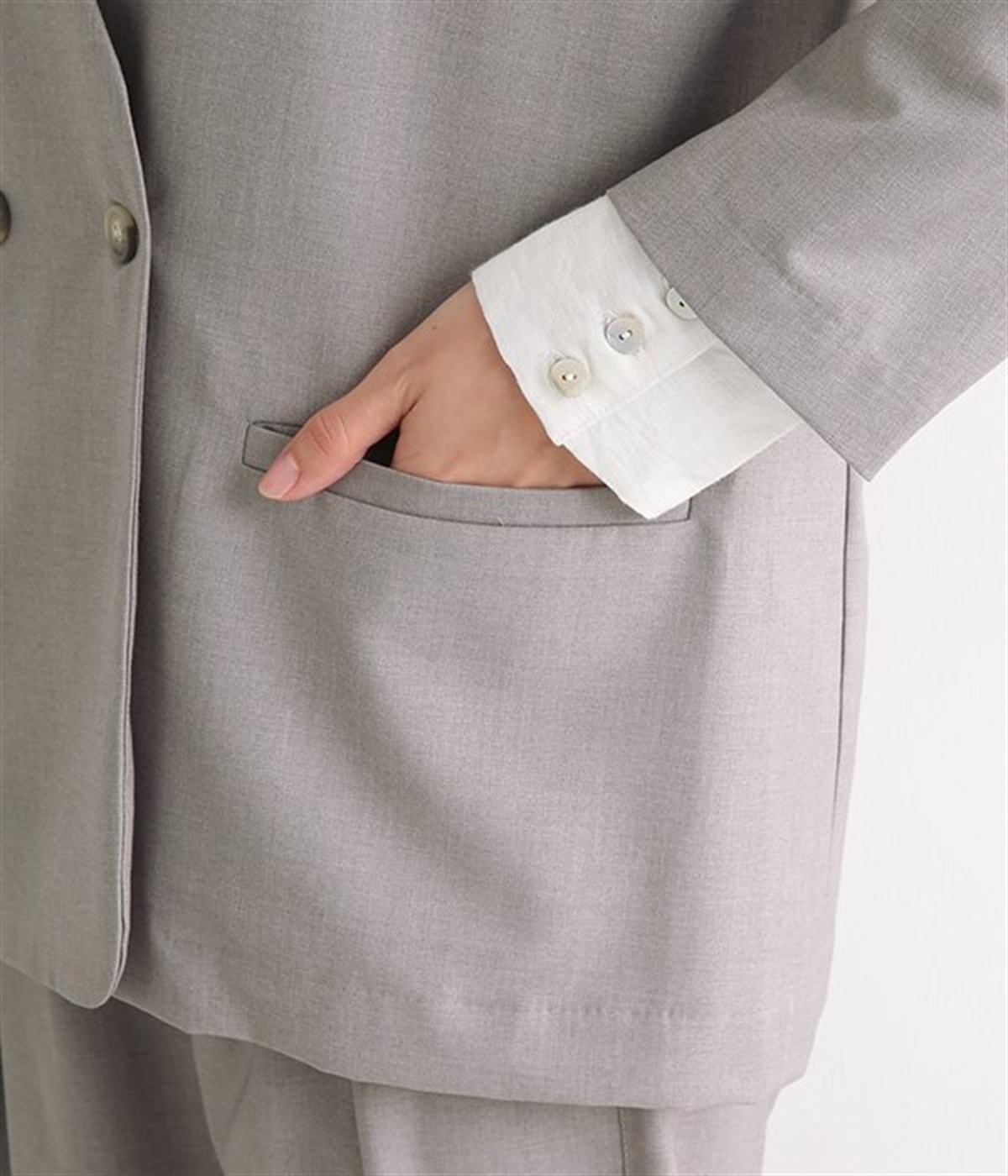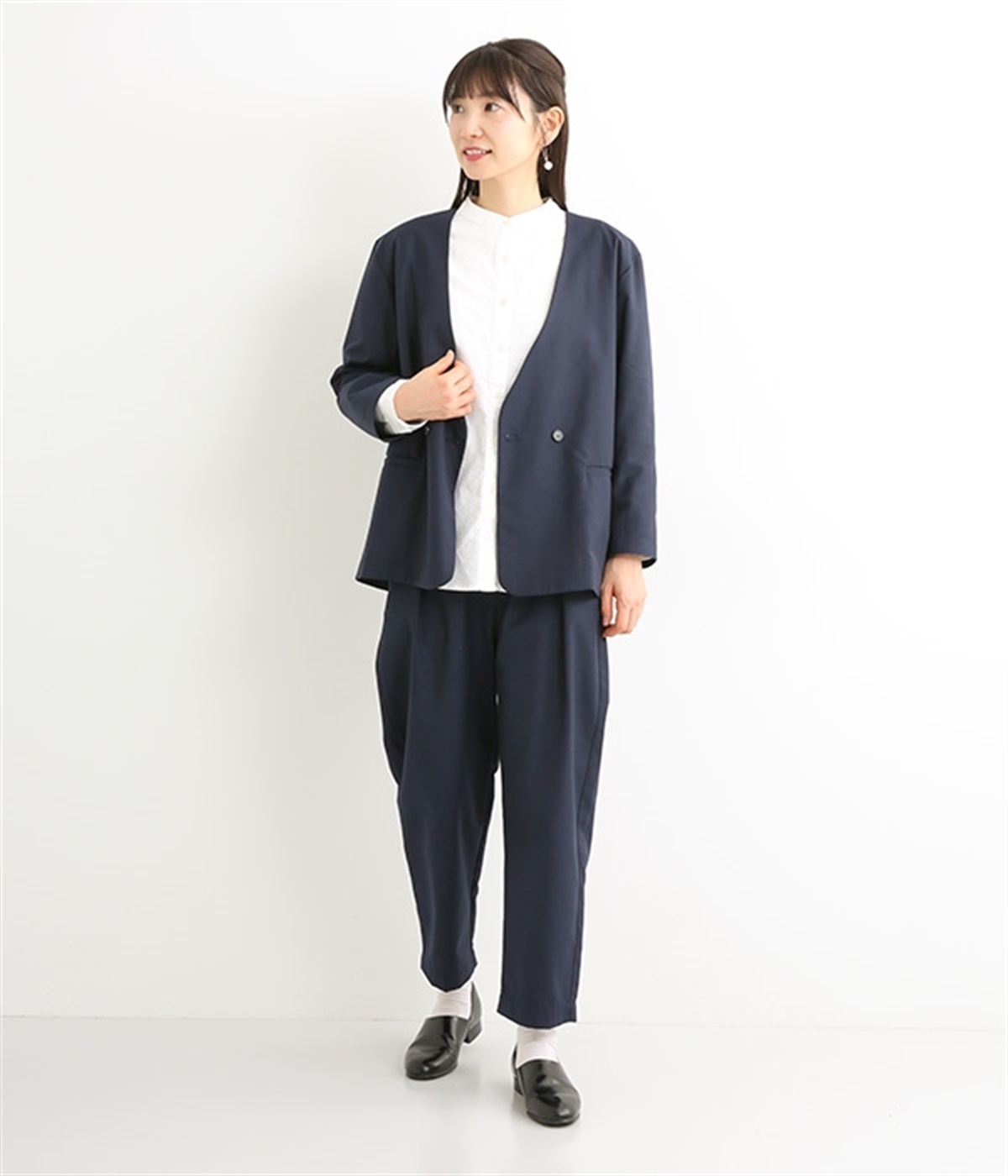 ほどよい光沢のあるサージ生地を使用したジャケットです。ダブル前立てのきちんとしたデザインで、フォーマルシーンやビジネスにも対応してくれます。裏地なしでも透けにくく安心して着用できます。広めに開いたノーカラーはインナーを選ばず、首や胸もとにデザインのあるブラウスとも相性抜群。同素材のパンツとセットアップ風に着こなすのもおすすめです。