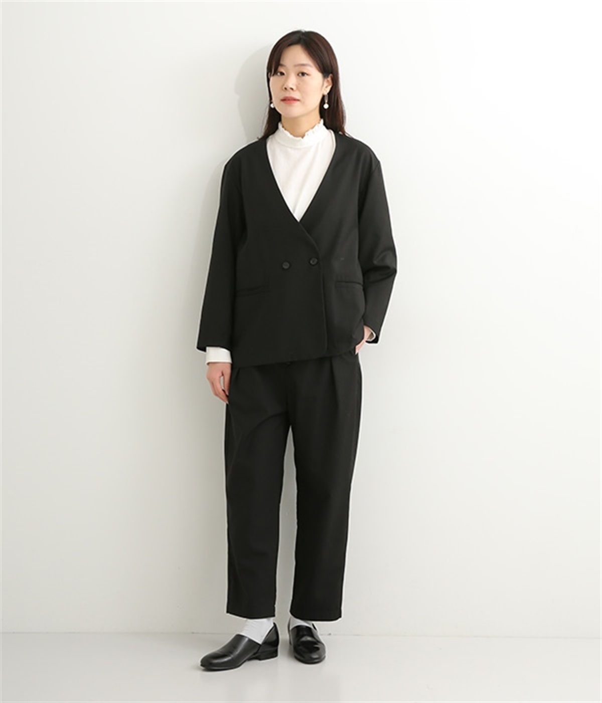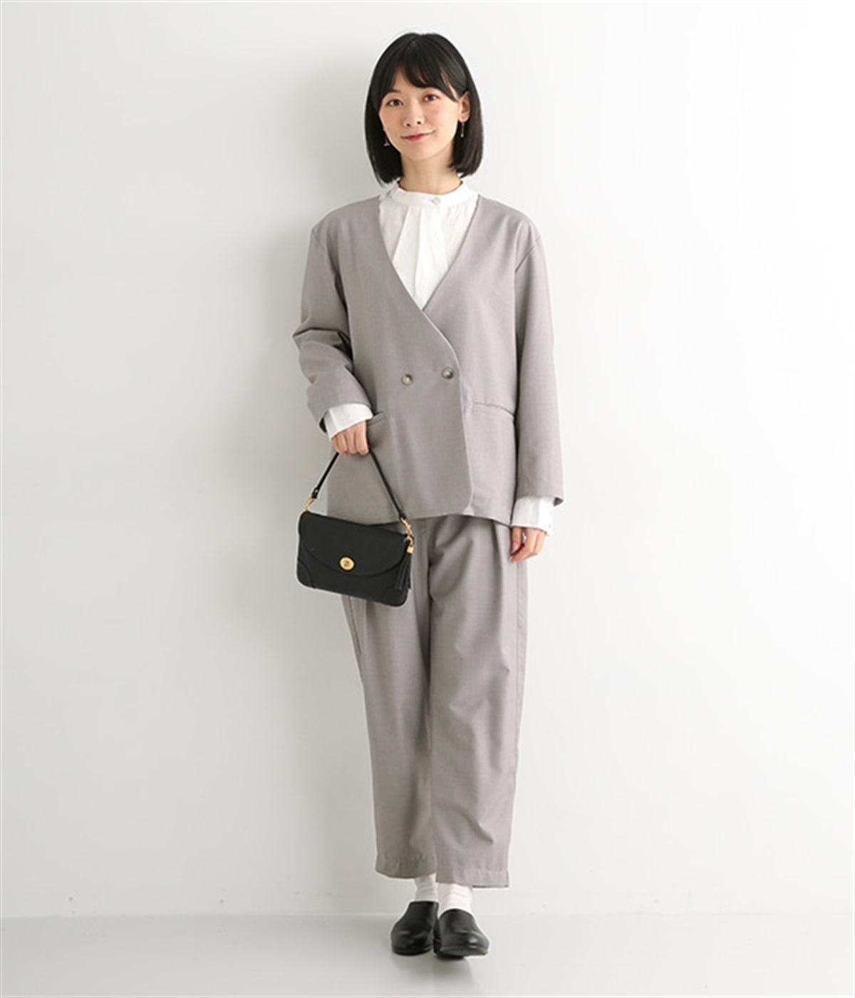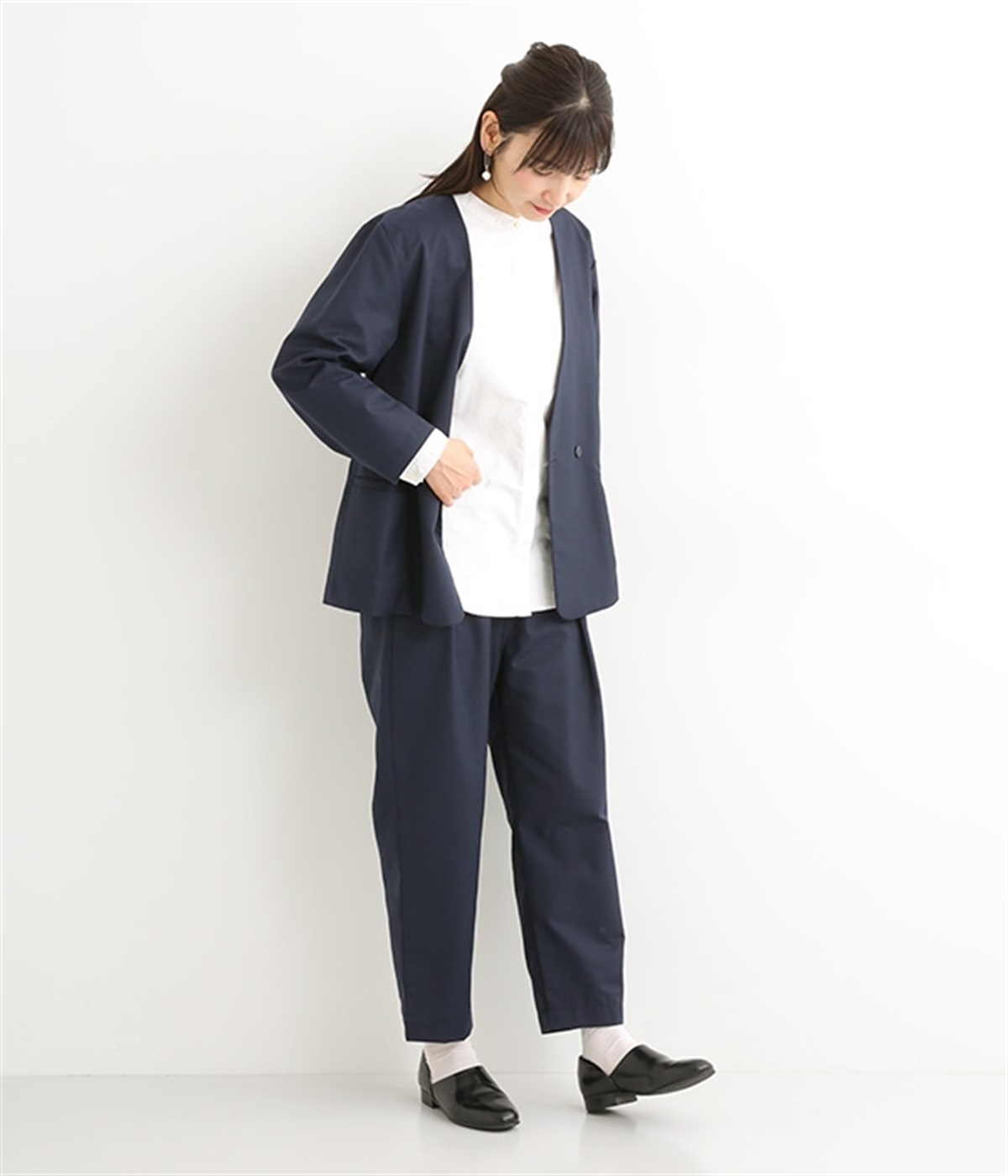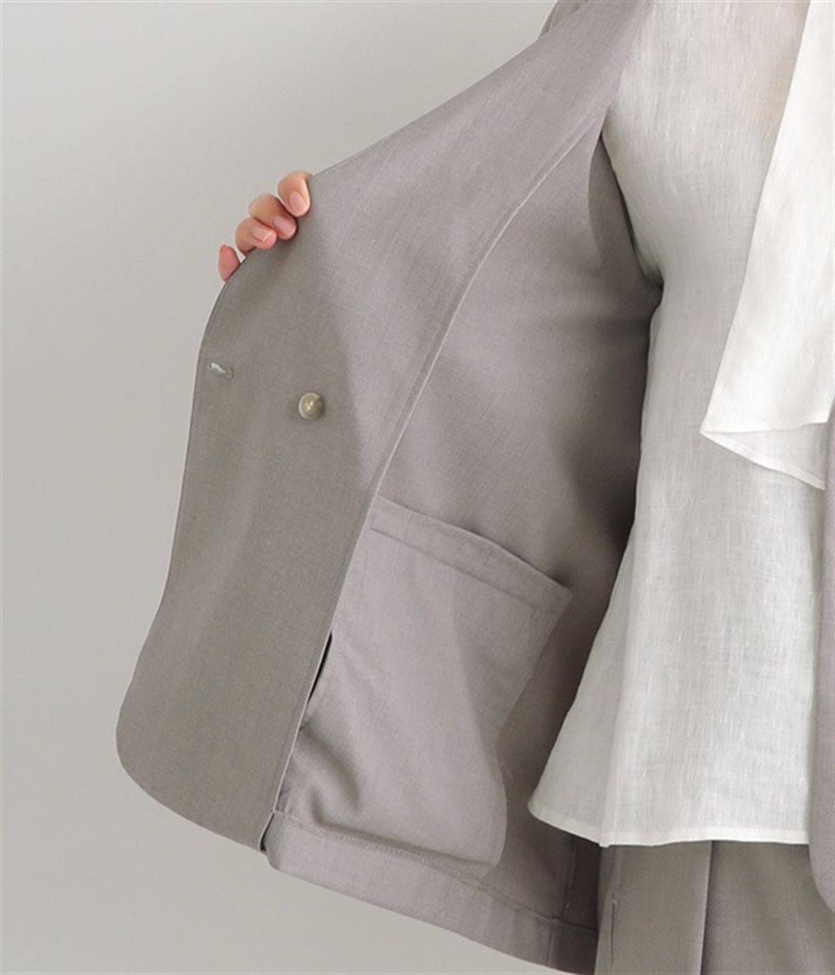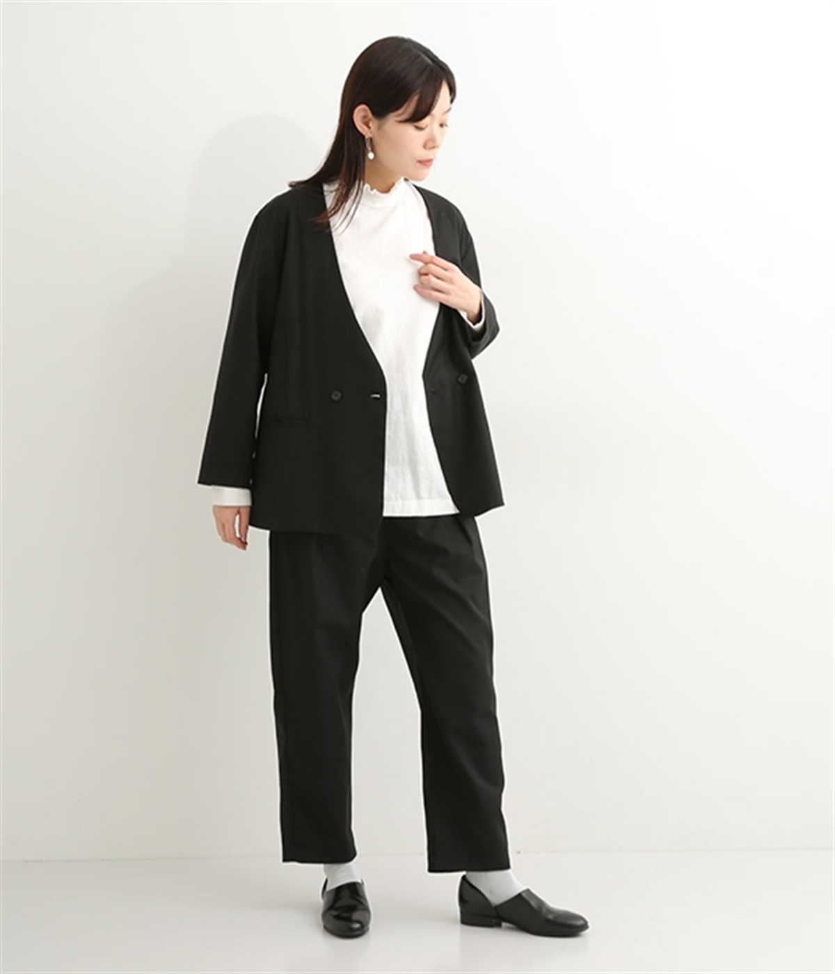 ほどよい光沢のあるサージ生地を使用したジャケットです。ダブル前立てのきちんとしたデザインで、フォーマルシーンやビジネスにも対応してくれます。裏地なしでも透けにくく安心して着用できます。広めに開いたノーカラーはインナーを選ばず、首や胸もとにデザインのあるブラウスとも相性抜群。同素材のパンツとセットアップ風に着こなすのもおすすめです。