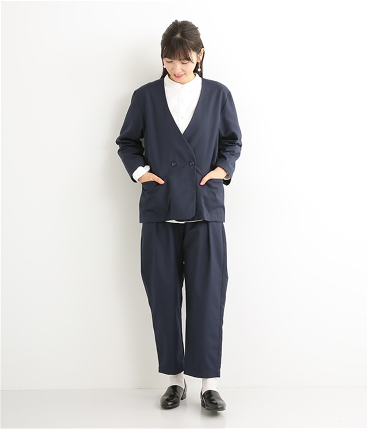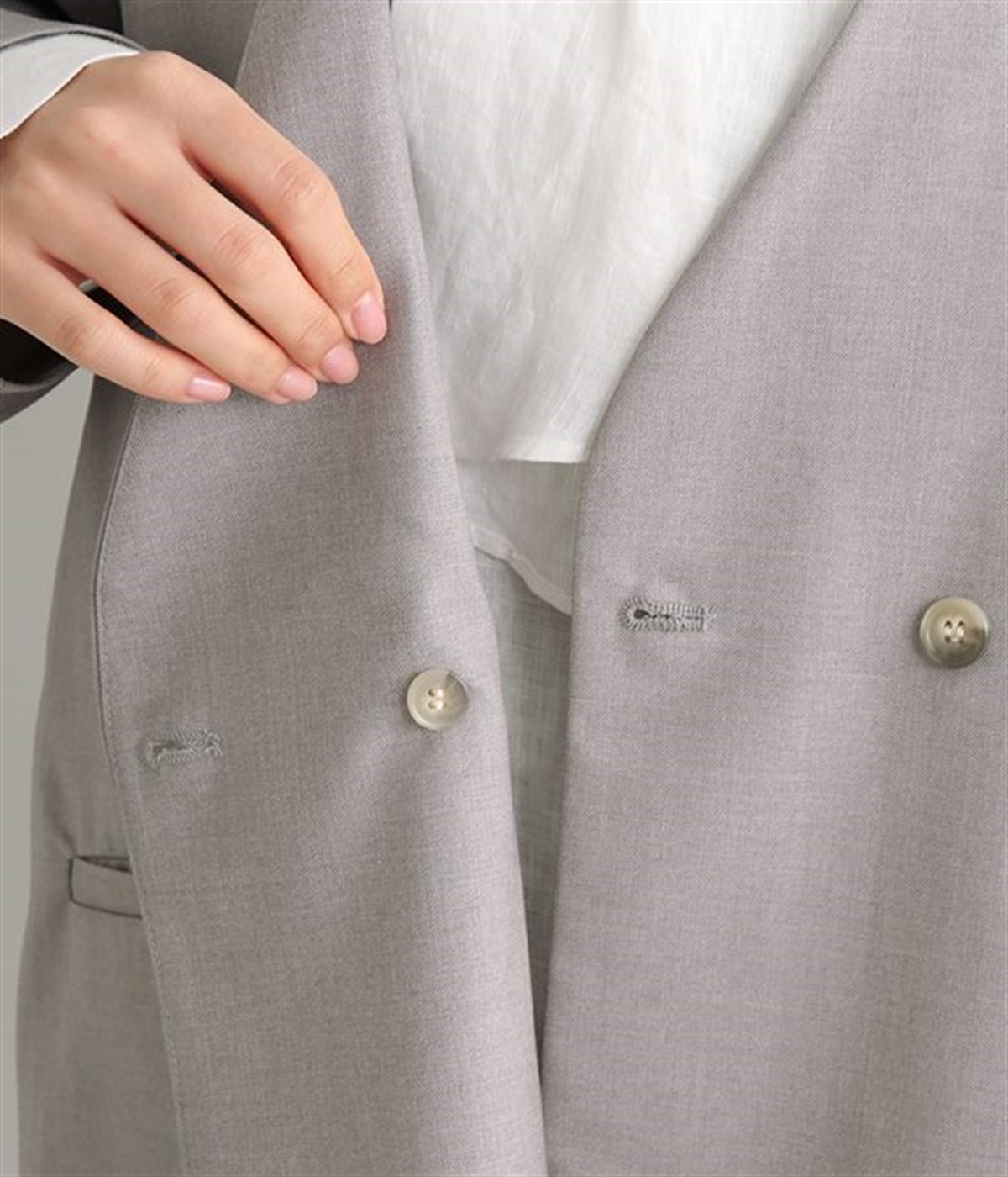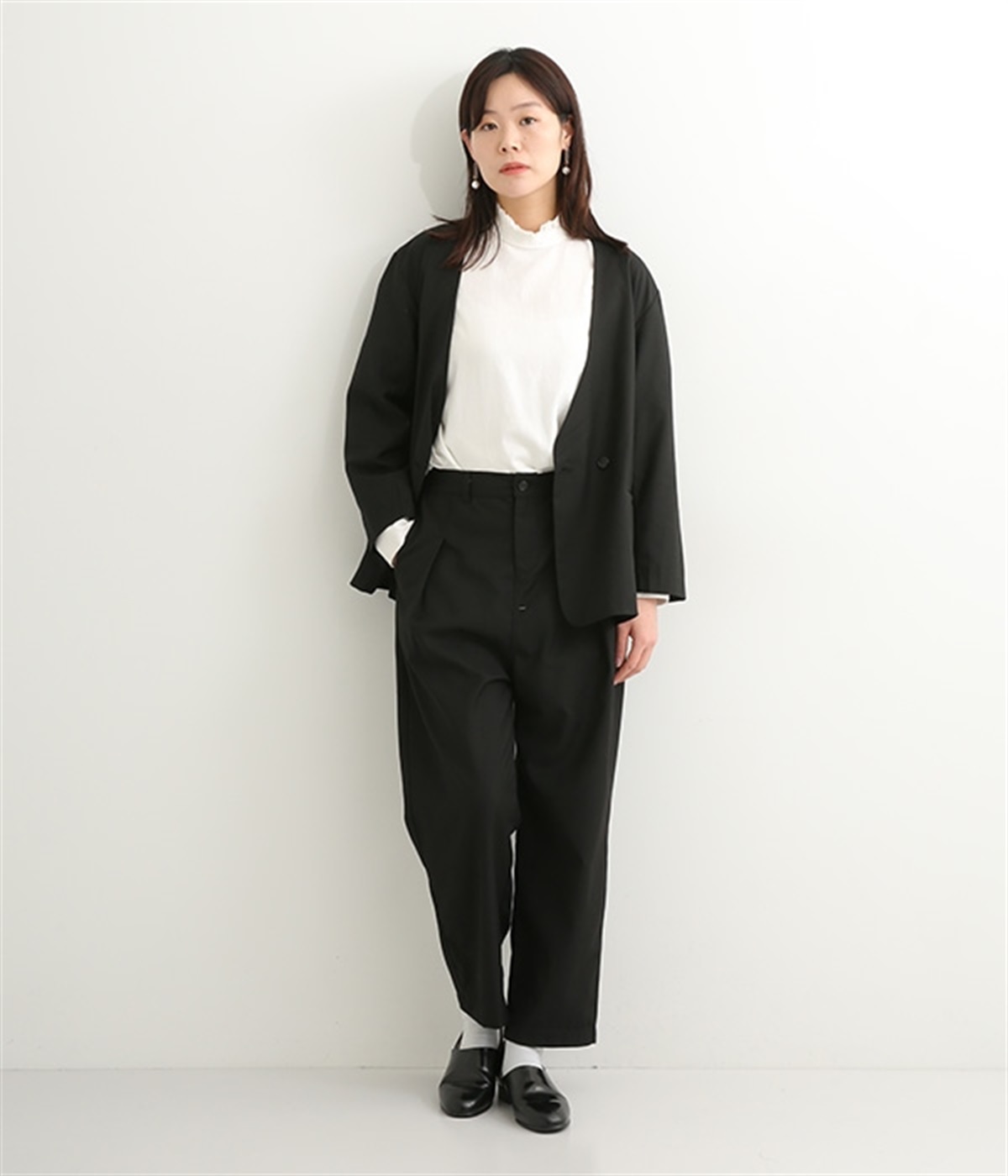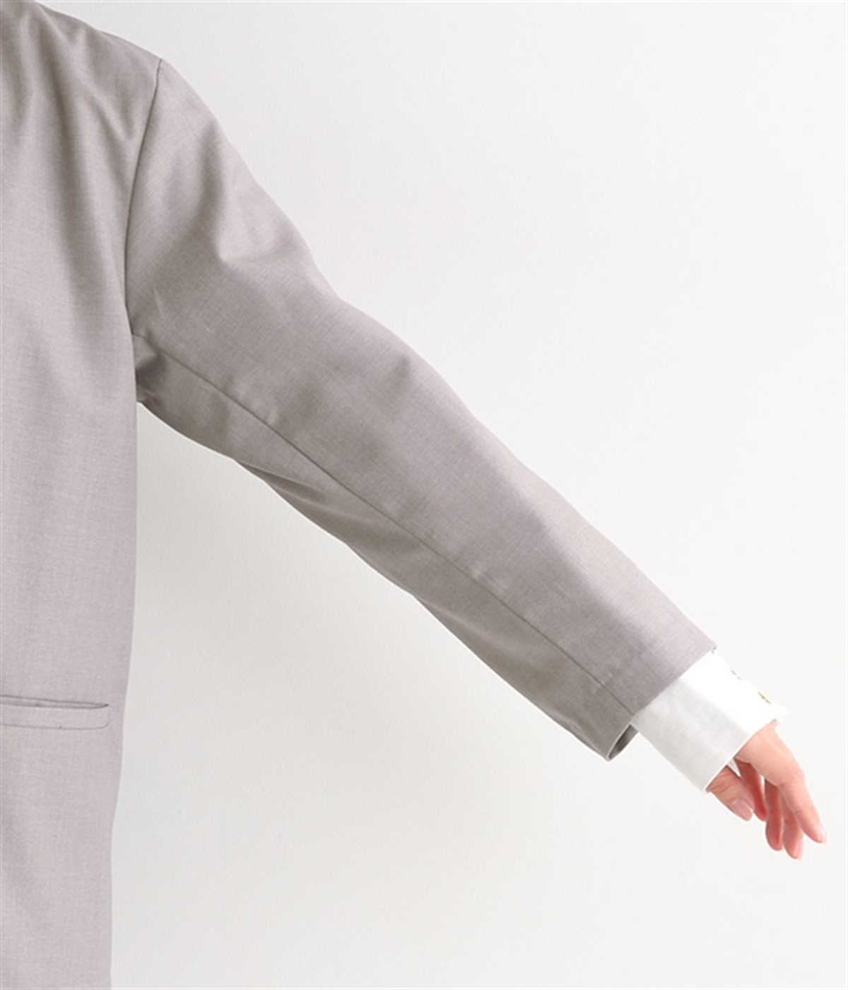 ほどよい光沢のあるサージ生地を使用したジャケットです。ダブル前立てのきちんとしたデザインで、フォーマルシーンやビジネスにも対応してくれます。裏地なしでも透けにくく安心して着用できます。広めに開いたノーカラーはインナーを選ばず、首や胸もとにデザインのあるブラウスとも相性抜群。同素材のパンツとセットアップ風に着こなすのもおすすめです。