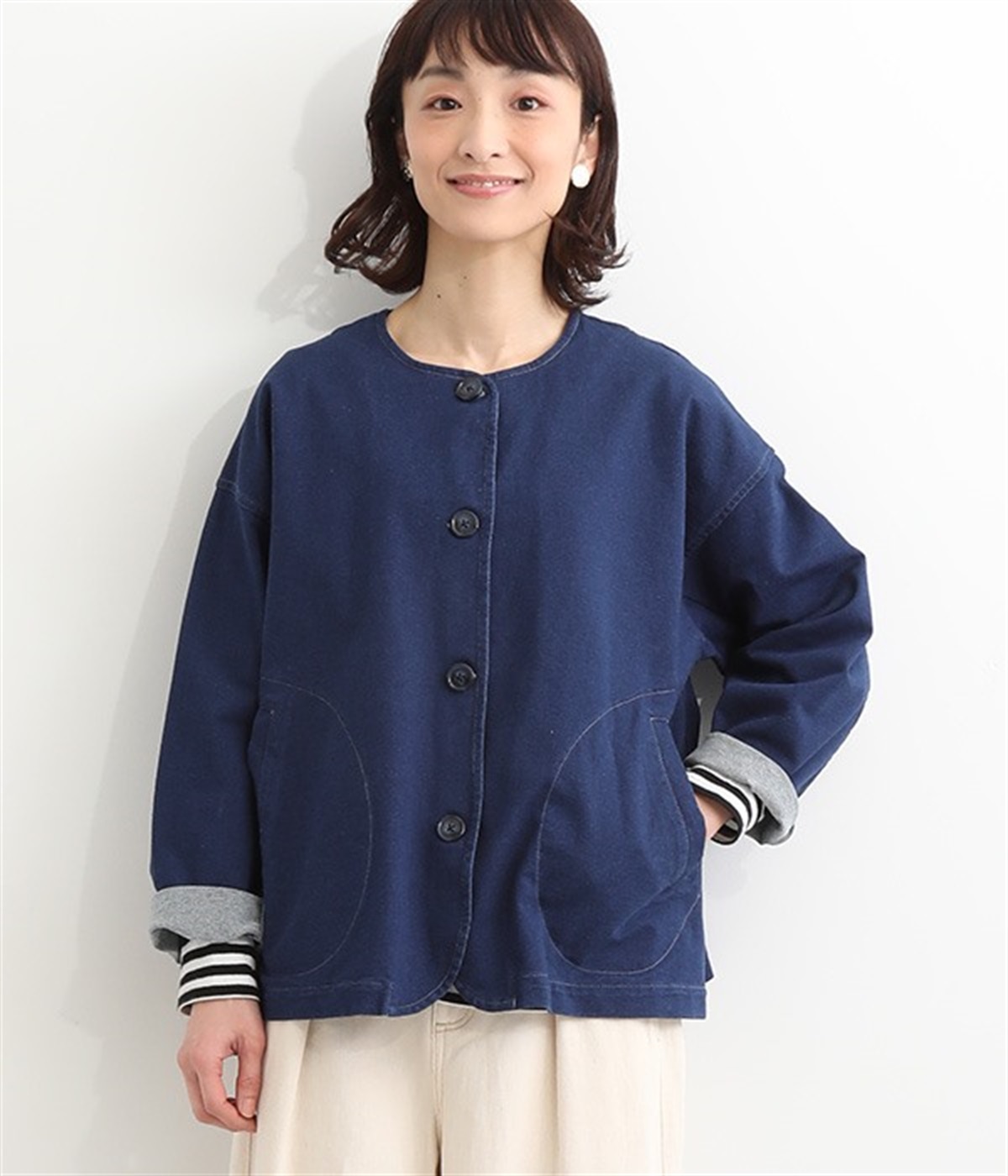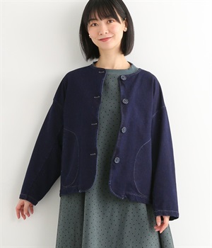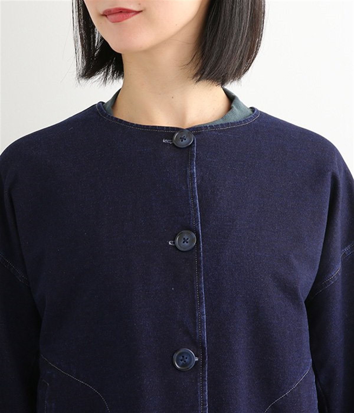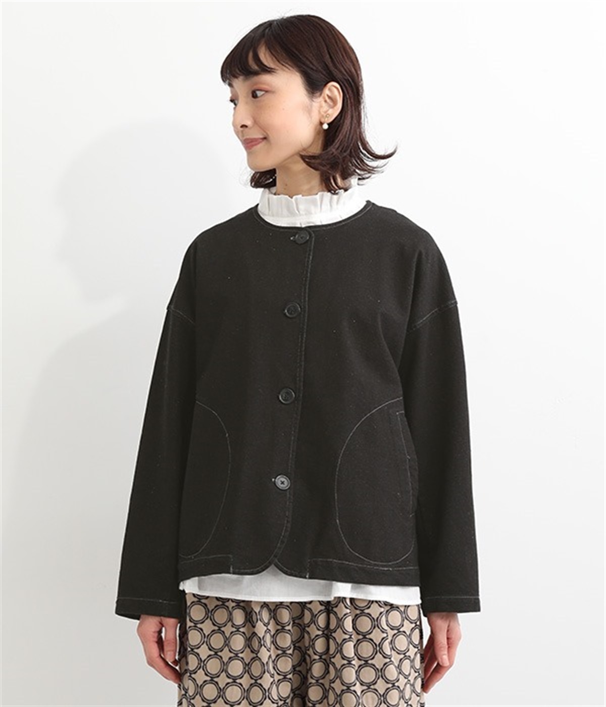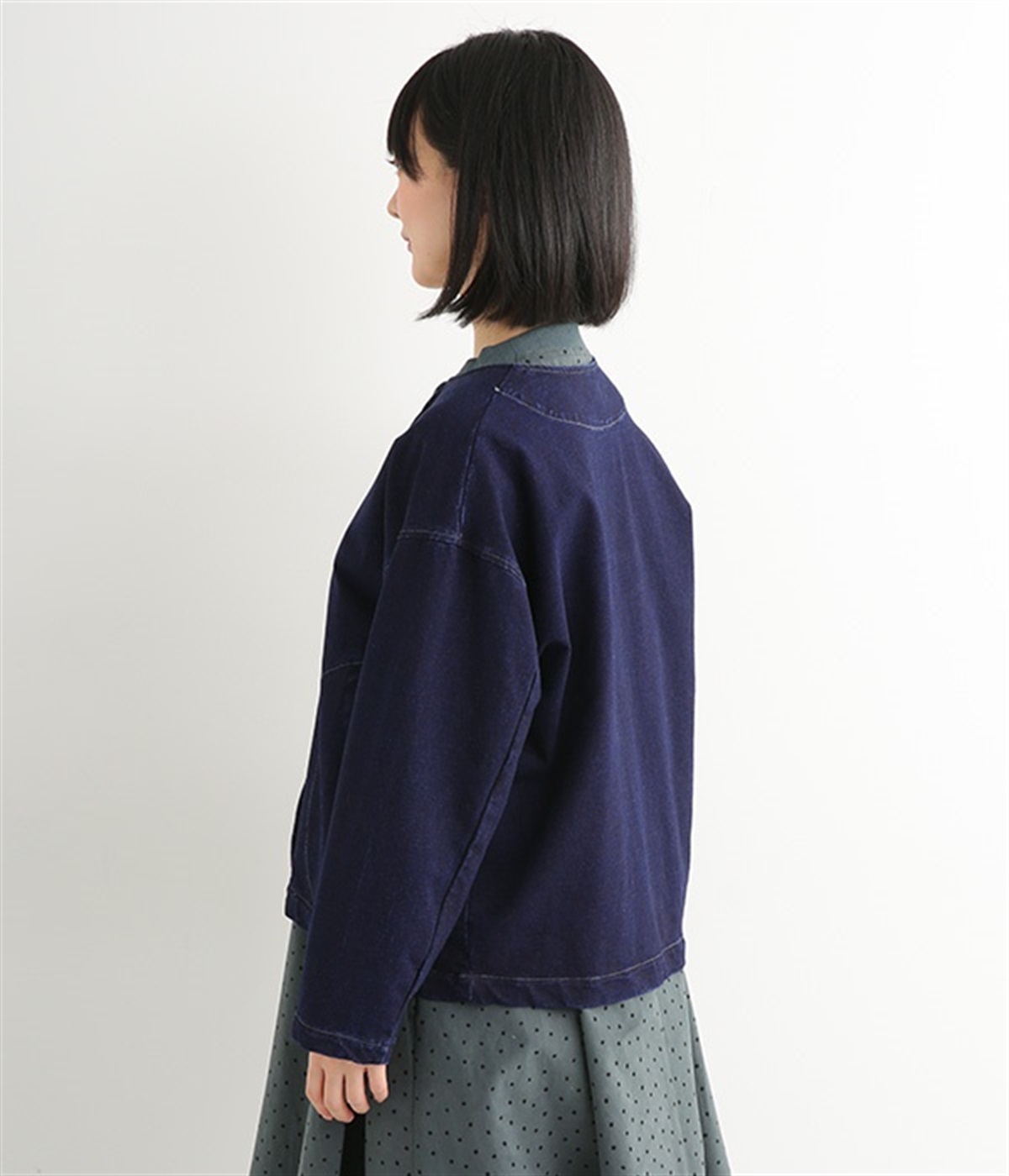 裏毛生地を使用したデニムジャケットです。ストレッチがきいているので動きやすく、ストレスフリーの着心地が楽しめます。顔まわりをすっきりと見せるノーカラーと、ポケットのステッチがポイント。タートルニットやフリルカラーのブラウスとの相性も抜群です。季節の変わり目にはもちろん、ストールやマフラーを合わせれば肌寒い日にも活躍します。