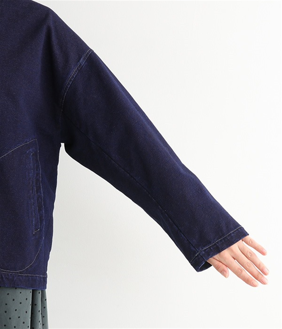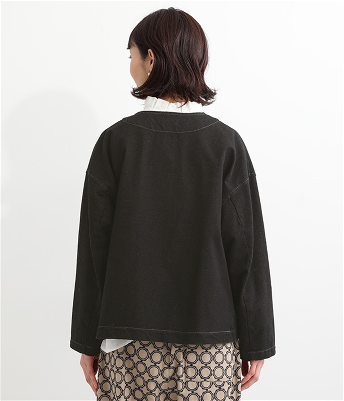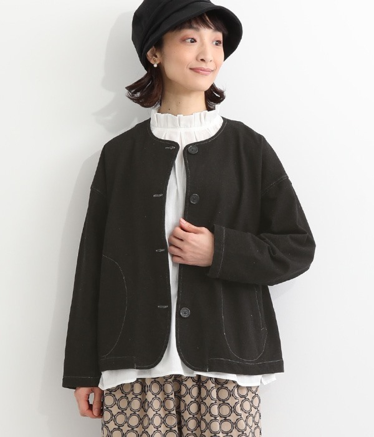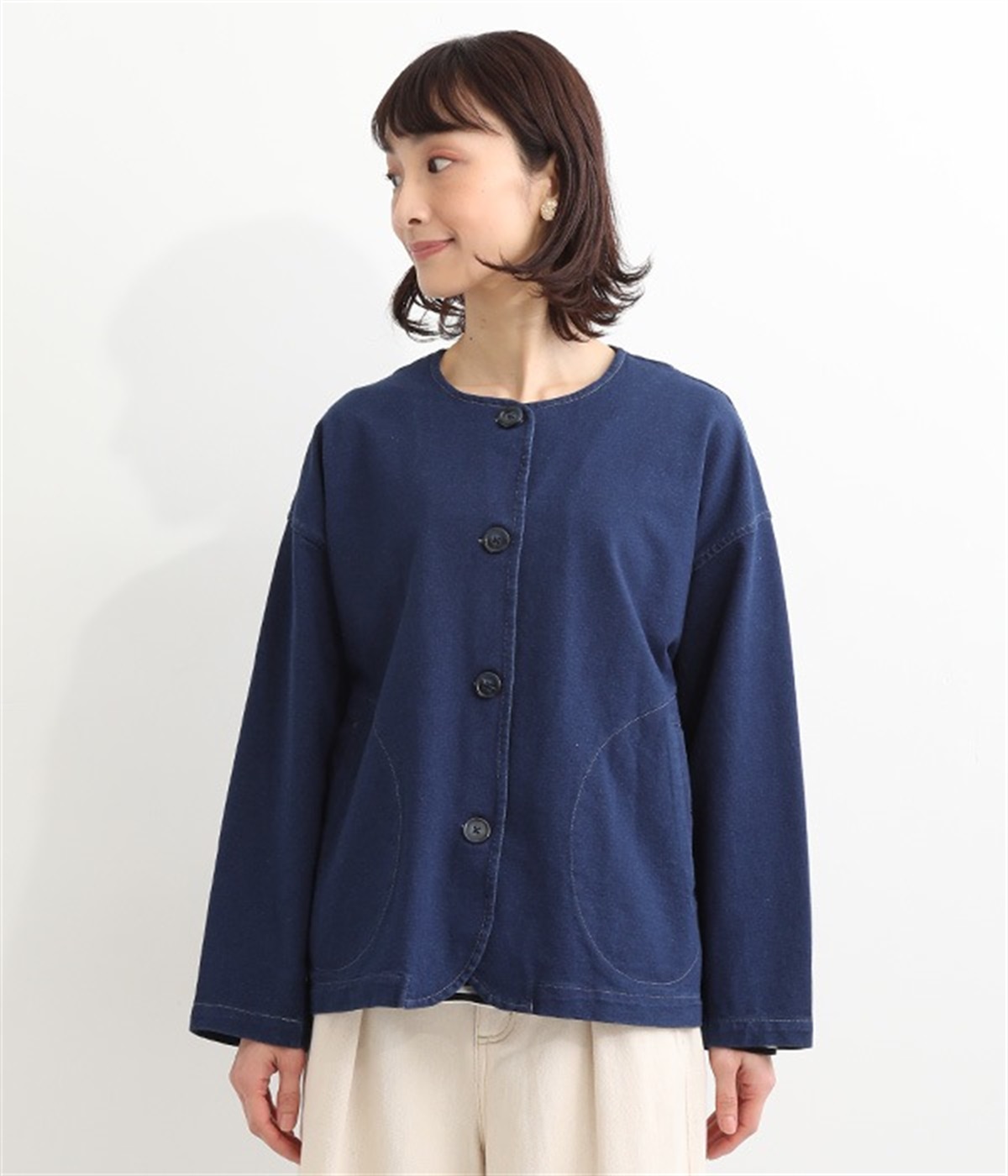 裏毛生地を使用したデニムジャケットです。ストレッチがきいているので動きやすく、ストレスフリーの着心地が楽しめます。顔まわりをすっきりと見せるノーカラーと、ポケットのステッチがポイント。タートルニットやフリルカラーのブラウスとの相性も抜群です。季節の変わり目にはもちろん、ストールやマフラーを合わせれば肌寒い日にも活躍します。