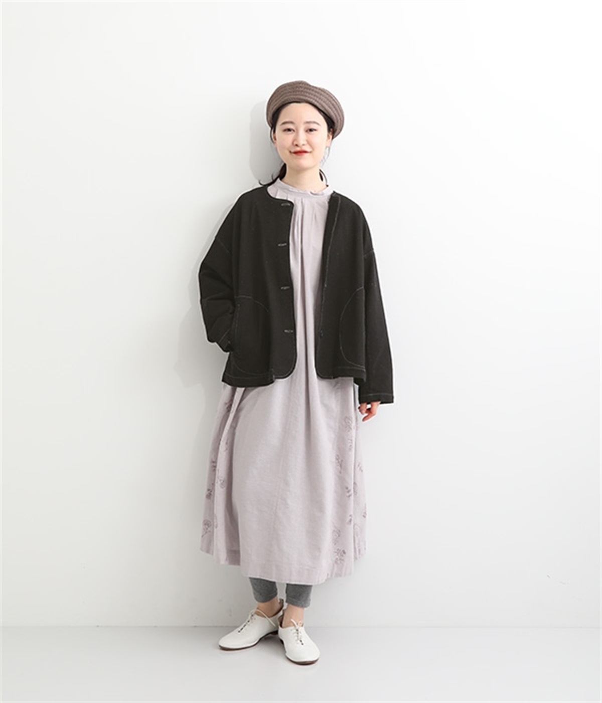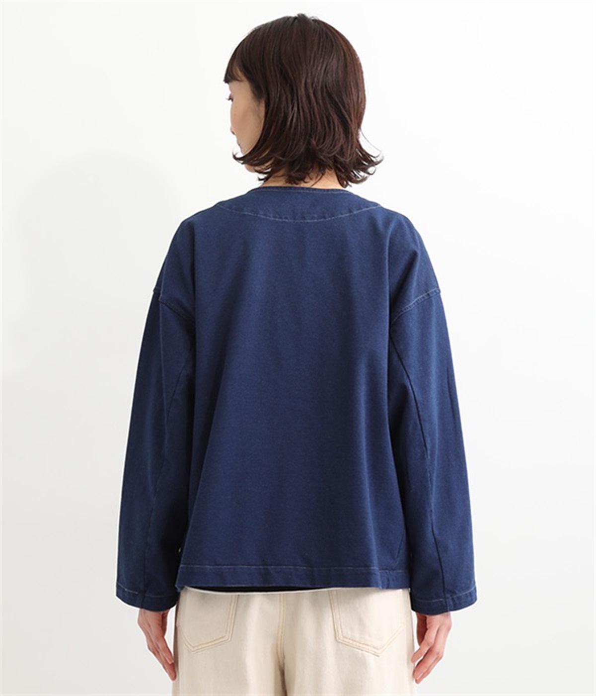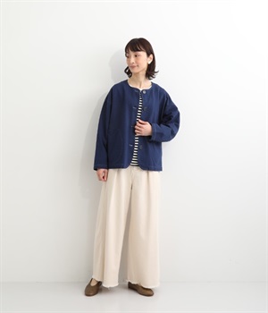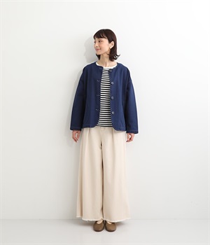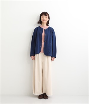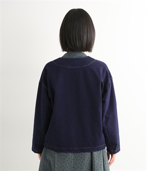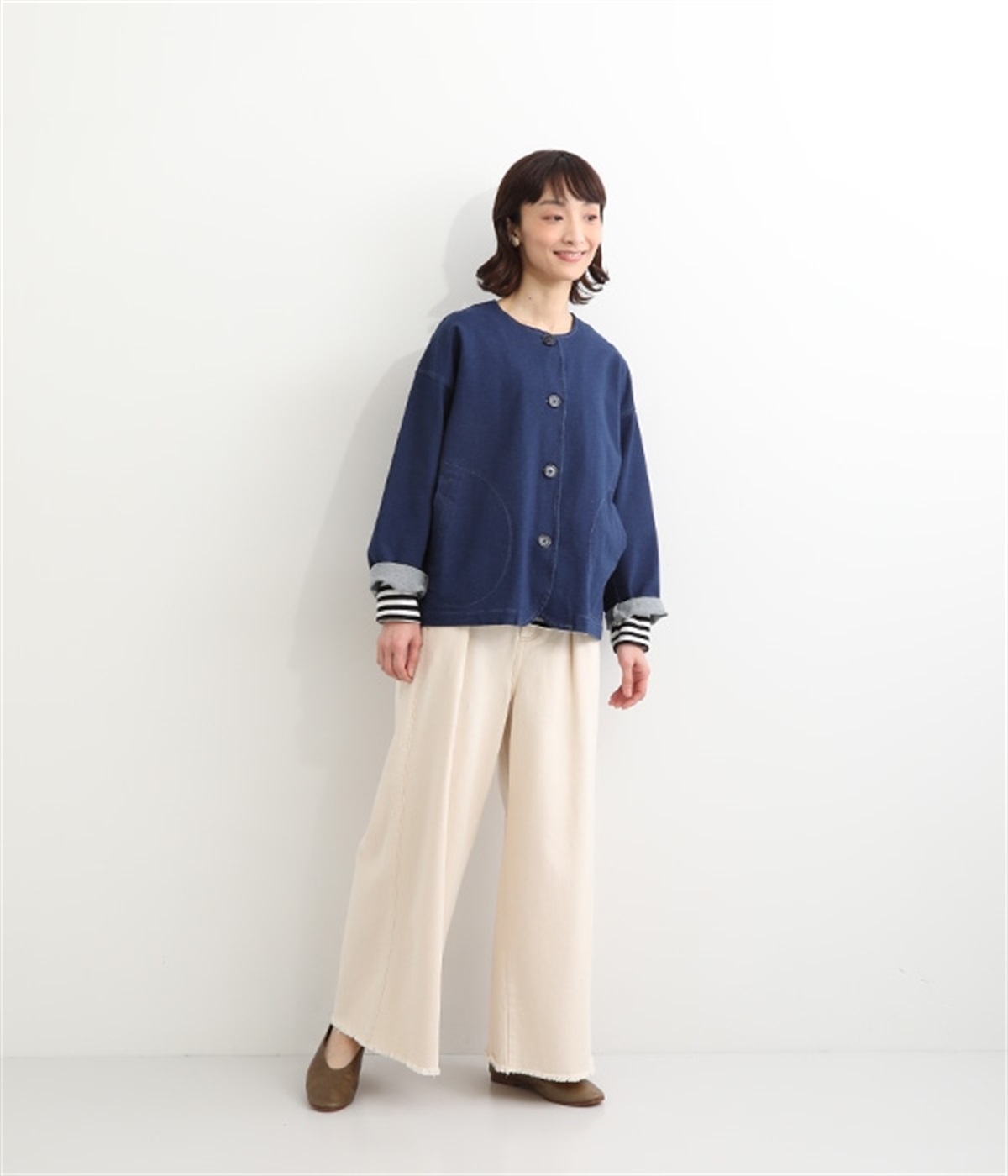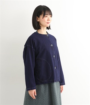 裏毛生地を使用したデニムジャケットです。ストレッチがきいているので動きやすく、ストレスフリーの着心地が楽しめます。顔まわりをすっきりと見せるノーカラーと、ポケットのステッチがポイント。タートルニットやフリルカラーのブラウスとの相性も抜群です。季節の変わり目にはもちろん、ストールやマフラーを合わせれば肌寒い日にも活躍します。