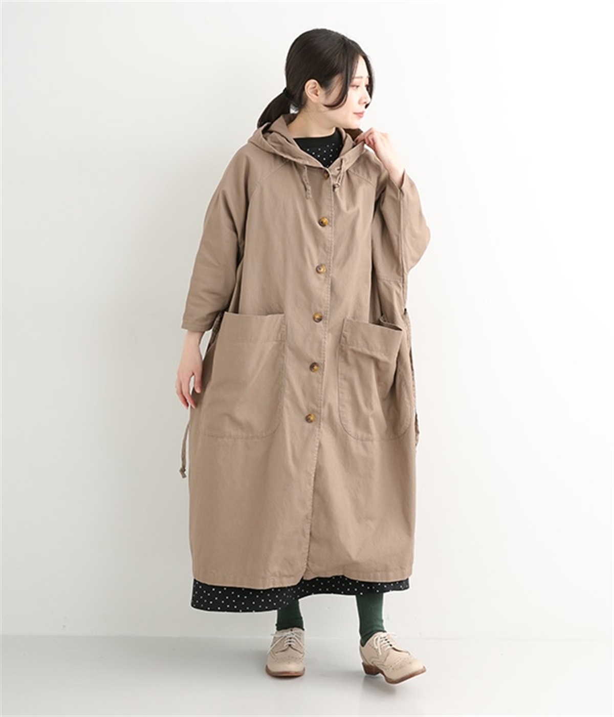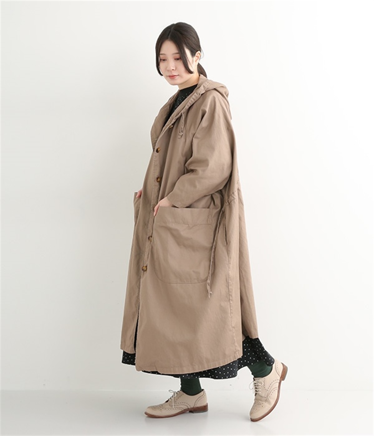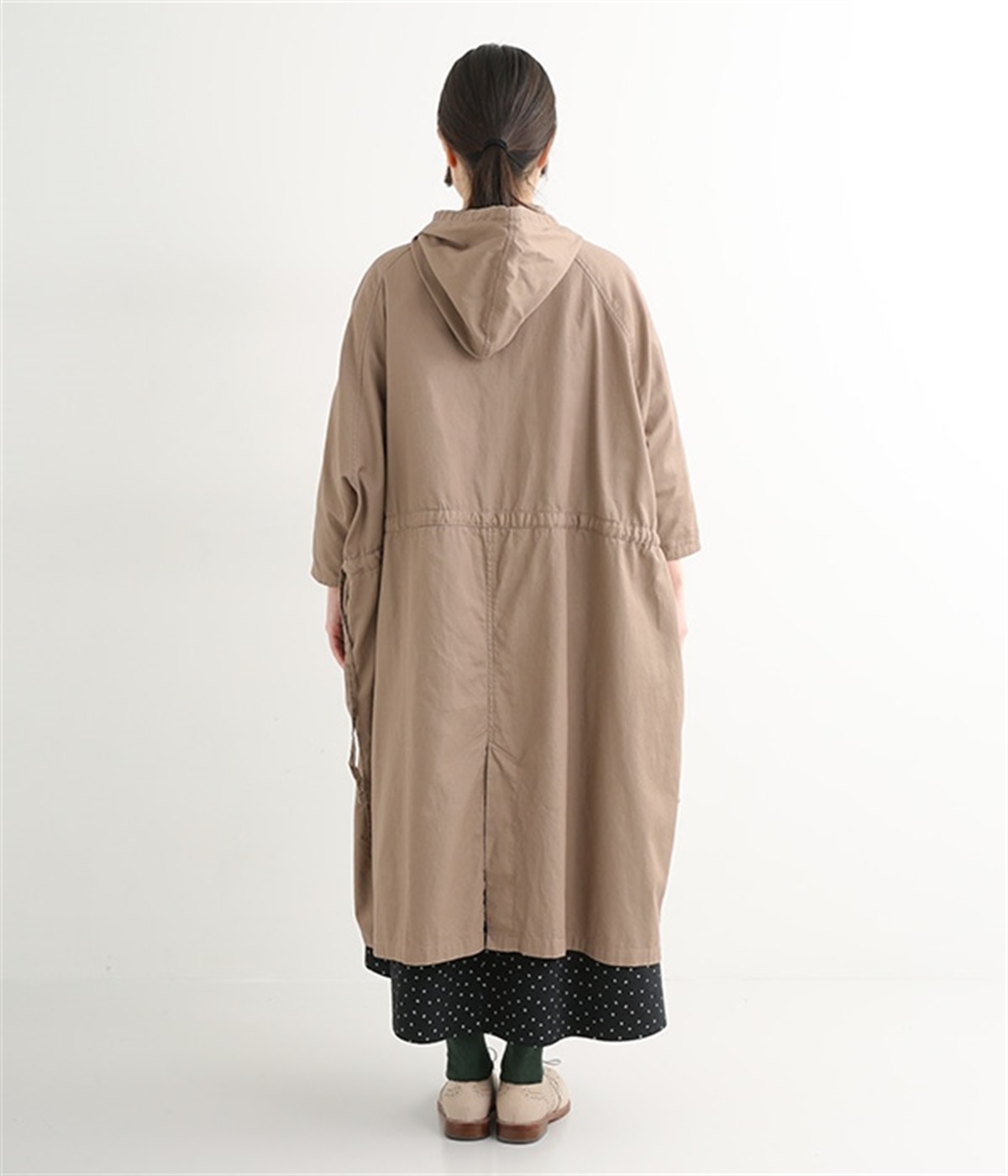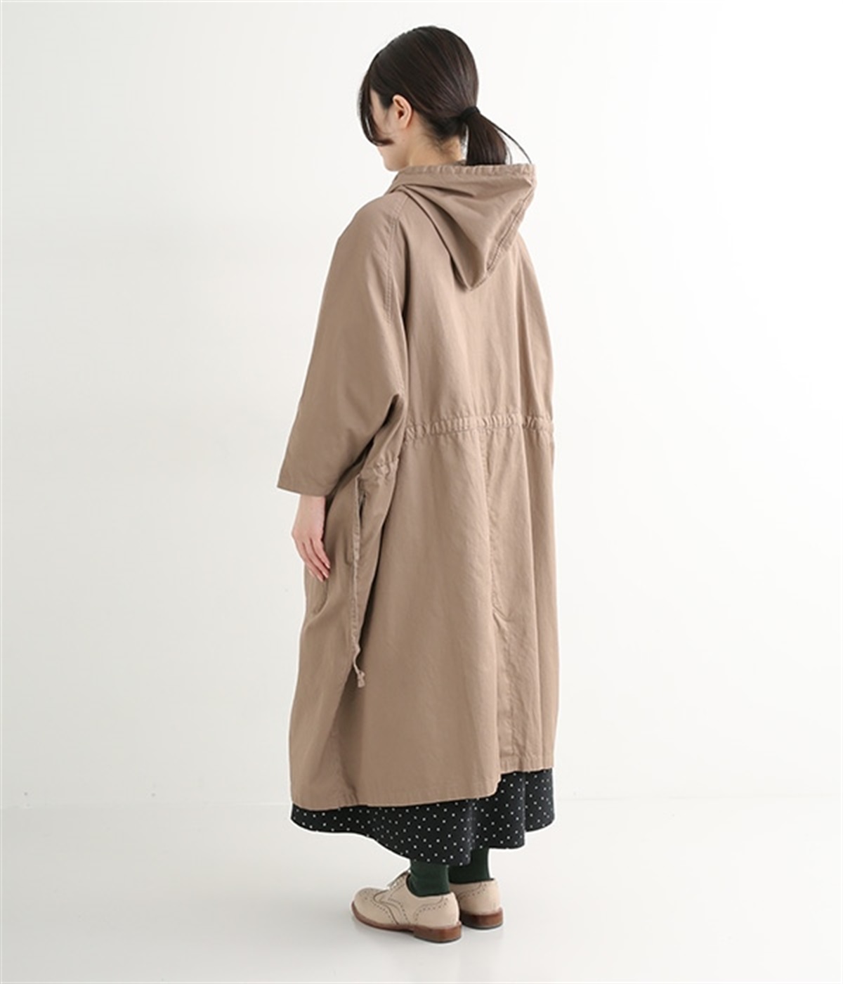 さらりとした風合いのコットンで仕立てたコートです。カジュアルなフード付きのデザインはデイリー使いに最適。ドルマンスリーブなので、さまざまなアイテムとゆったり重ね着できます。後ろのウエストに通したドローコードが、後ろ姿にもメリハリをプラス。季節の変わり目の装いに重宝するアイテムです。