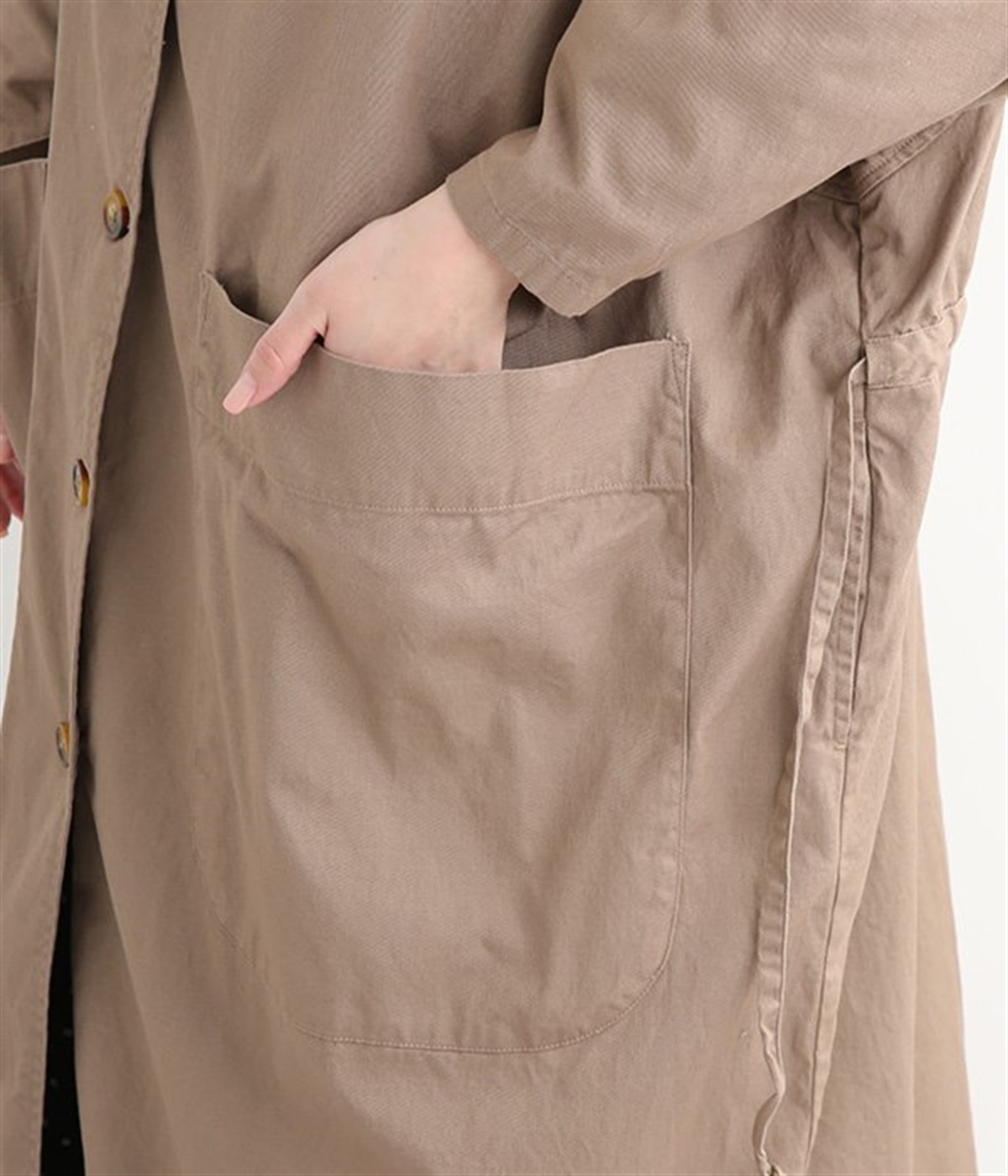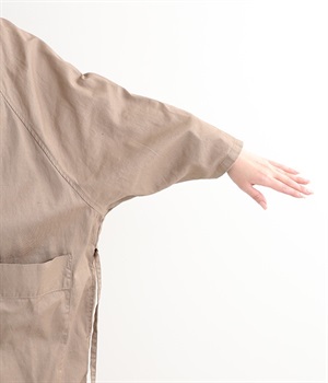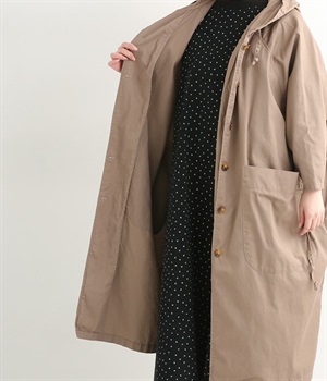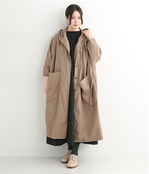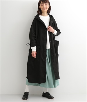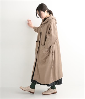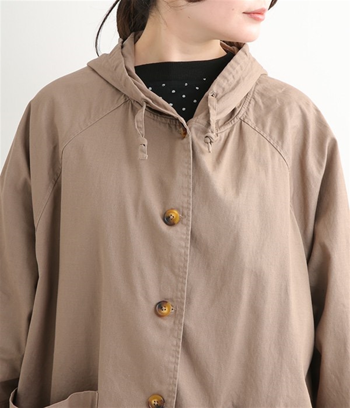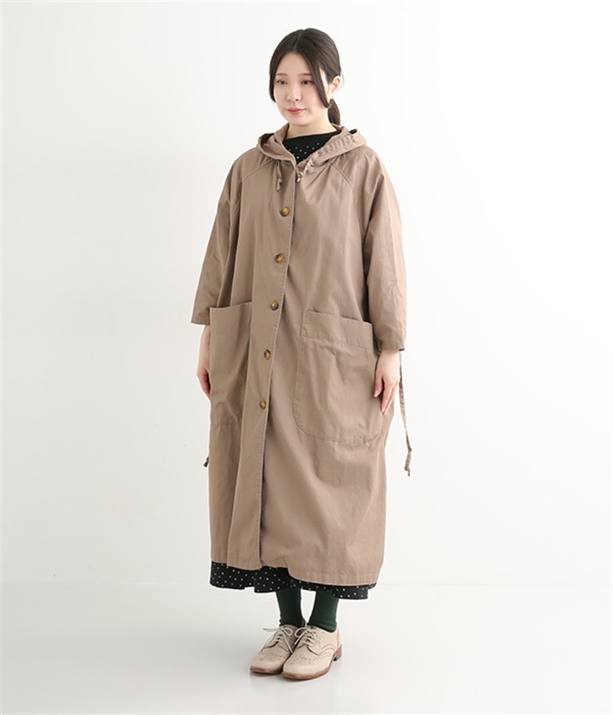 さらりとした風合いのコットンで仕立てたコートです。カジュアルなフード付きのデザインはデイリー使いに最適。ドルマンスリーブなので、さまざまなアイテムとゆったり重ね着できます。後ろのウエストに通したドローコードが、後ろ姿にもメリハリをプラス。季節の変わり目の装いに重宝するアイテムです。