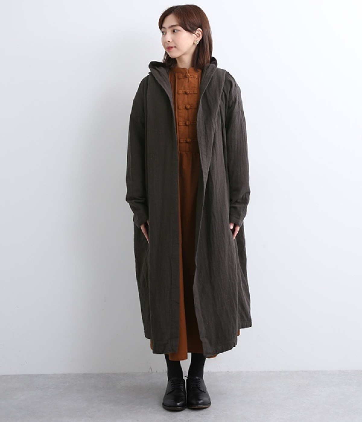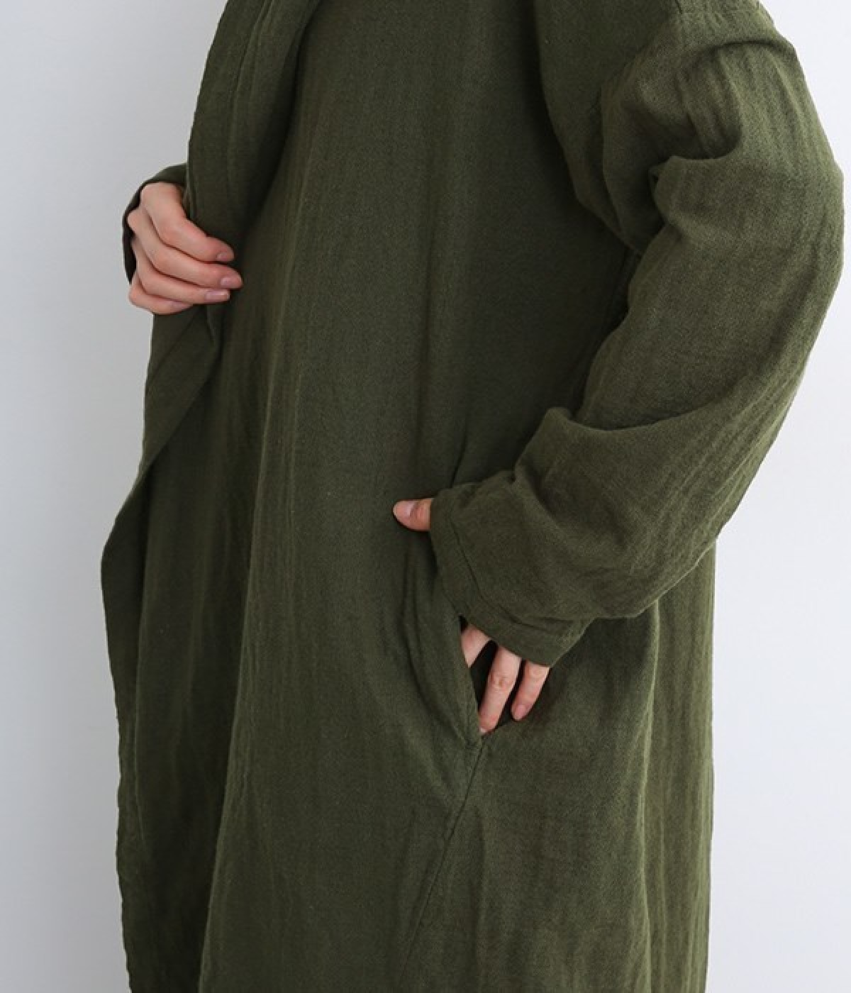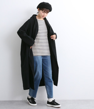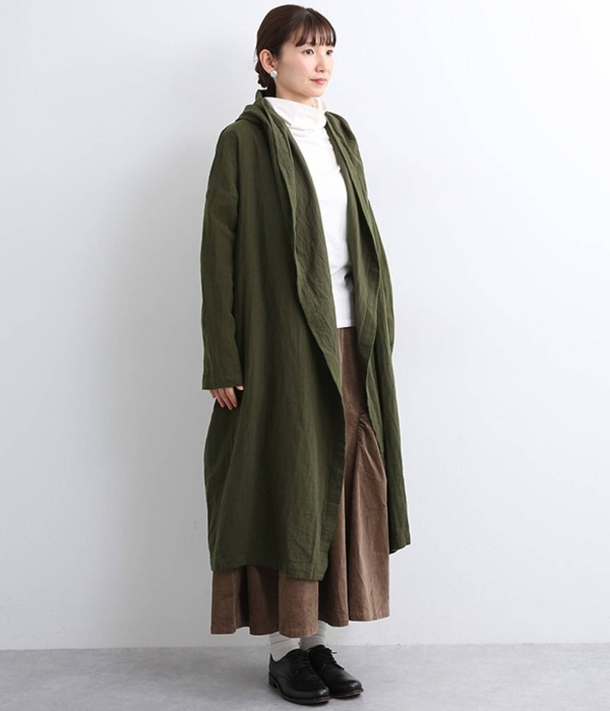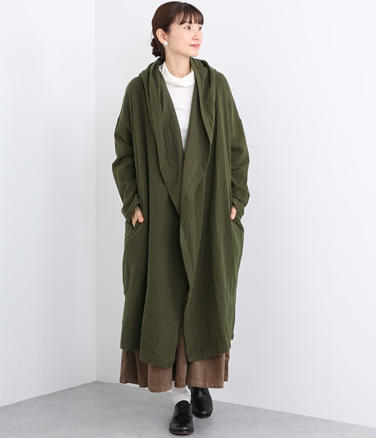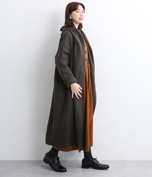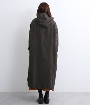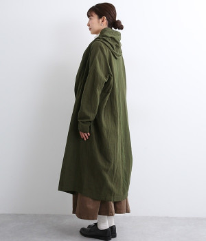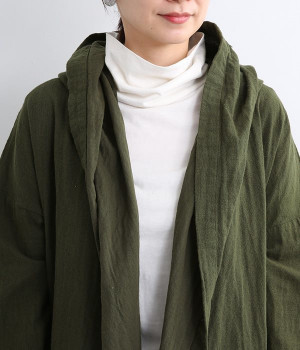 こなれ感がただようリラックスシルエットのフードつきコートです。保温性や通気性に優れた、ややハリのあるコットンリネン素材を使用。縦のラインを強調するロング丈が全体をすっきりと見せてくれます。ショールを掛けたような襟のドレープ感は、大人っぽいニュアンスがたっぷり。ボタンレスなのでカーディガン感覚で気軽に羽織れるライトアウターです。