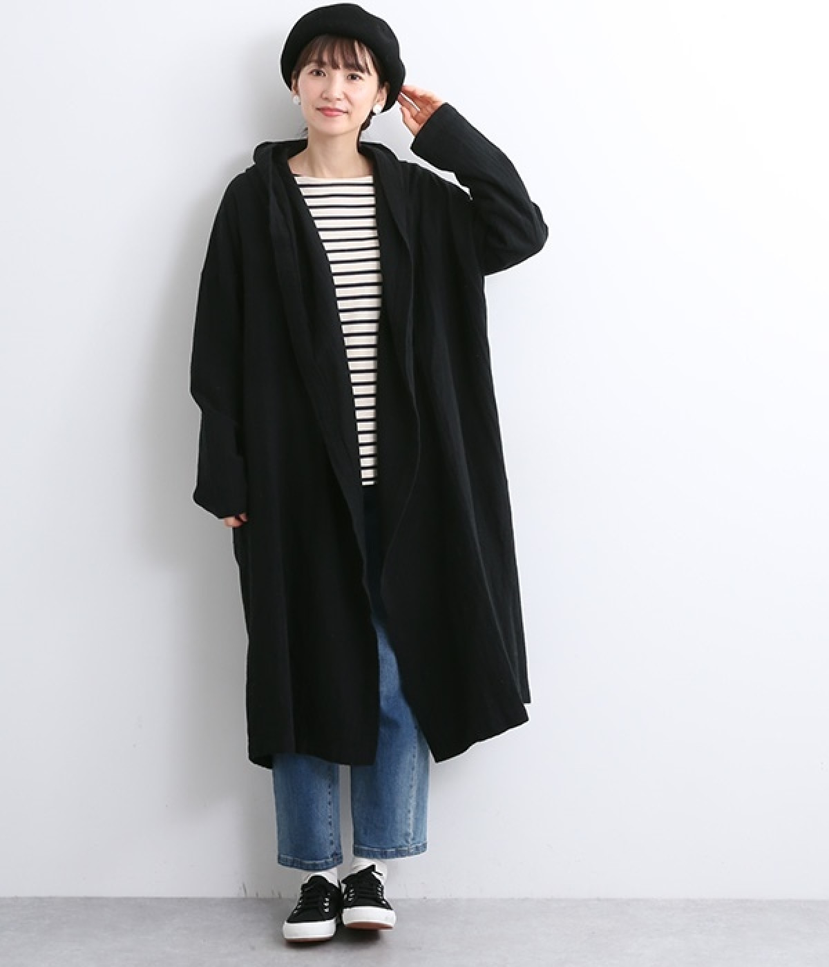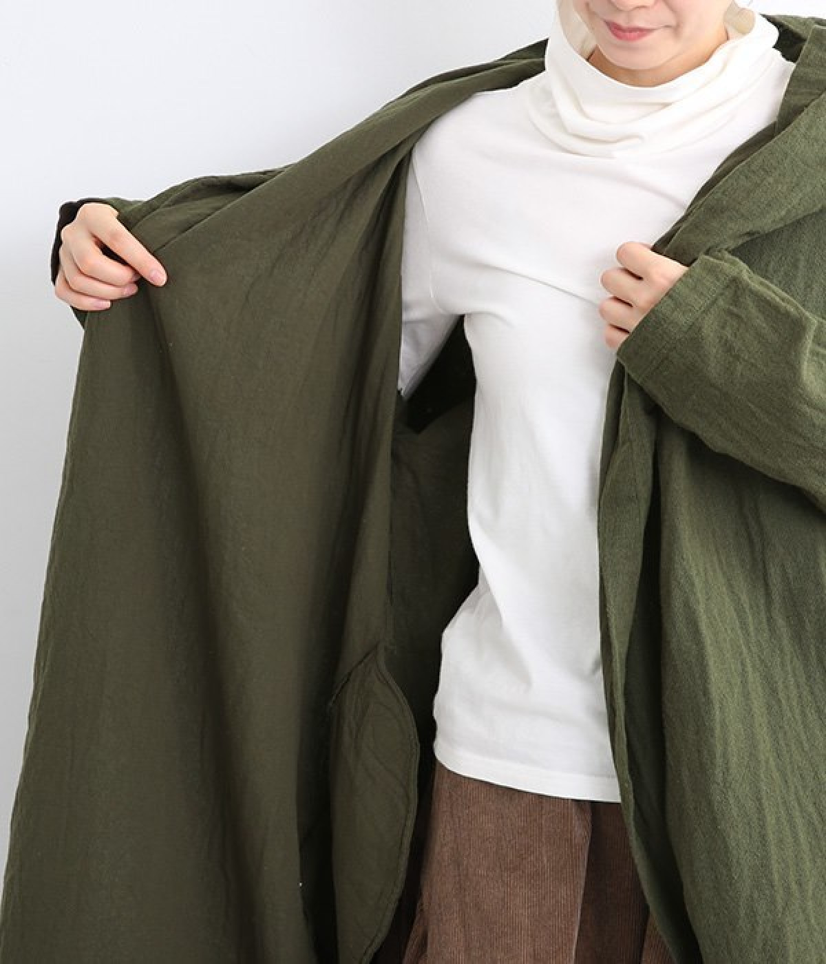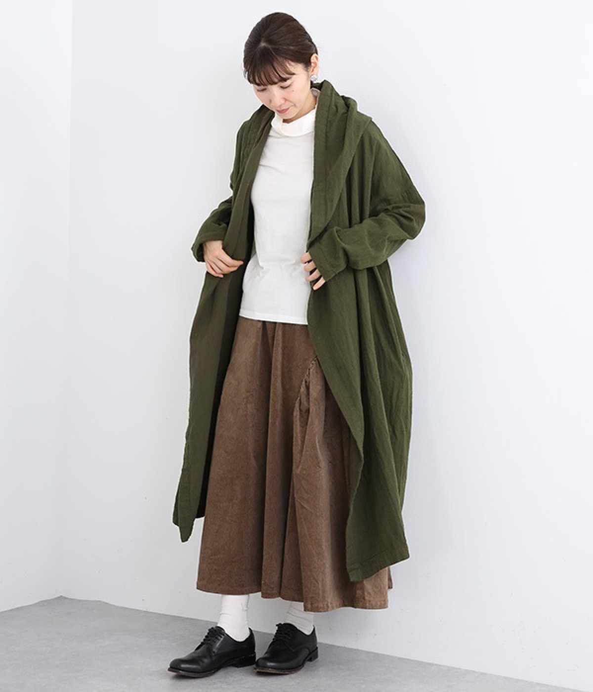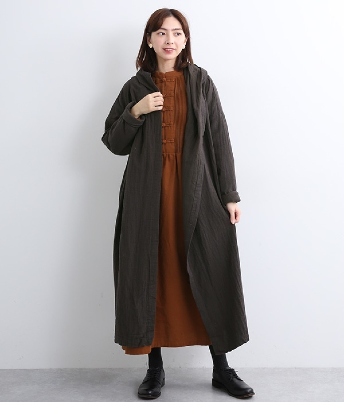 こなれ感がただようリラックスシルエットのフードつきコートです。保温性や通気性に優れた、ややハリのあるコットンリネン素材を使用。縦のラインを強調するロング丈が全体をすっきりと見せてくれます。ショールを掛けたような襟のドレープ感は、大人っぽいニュアンスがたっぷり。ボタンレスなのでカーディガン感覚で気軽に羽織れるライトアウターです。