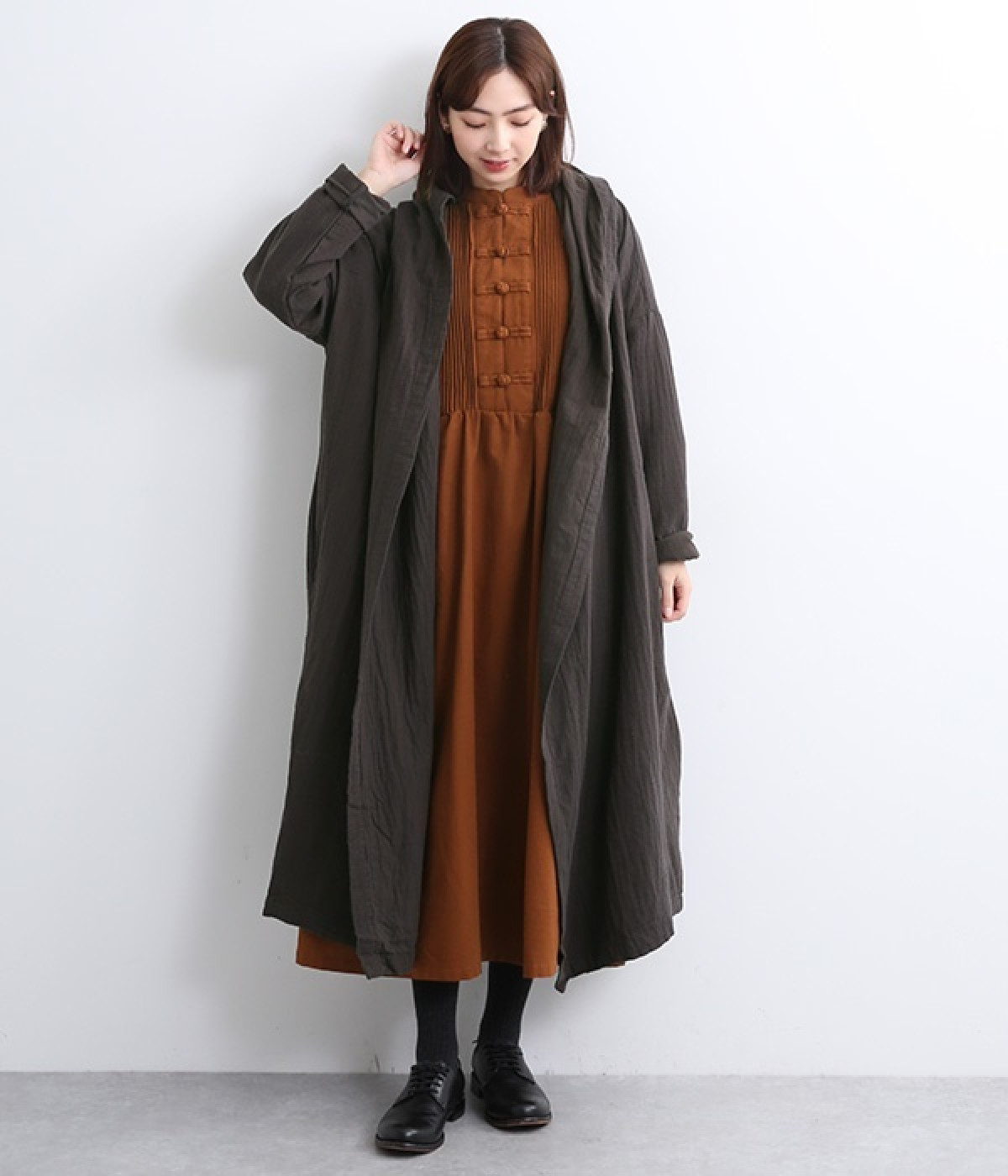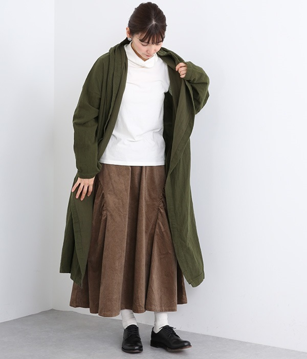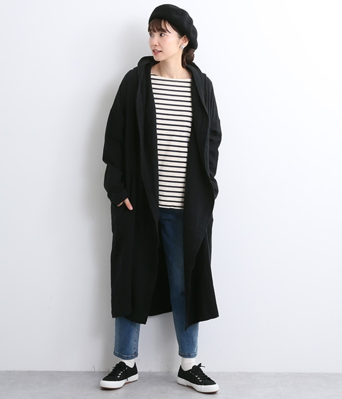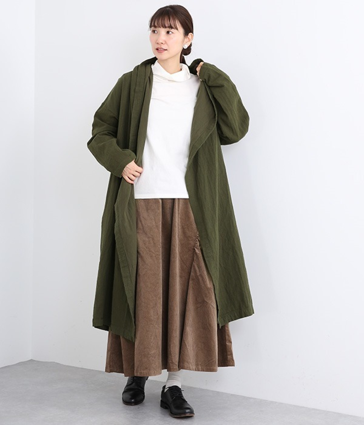 こなれ感がただようリラックスシルエットのフードつきコートです。保温性や通気性に優れた、ややハリのあるコットンリネン素材を使用。縦のラインを強調するロング丈が全体をすっきりと見せてくれます。ショールを掛けたような襟のドレープ感は、大人っぽいニュアンスがたっぷり。ボタンレスなのでカーディガン感覚で気軽に羽織れるライトアウターです。