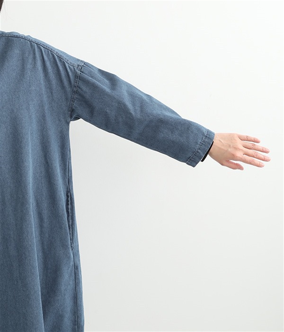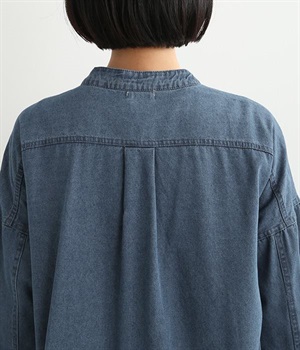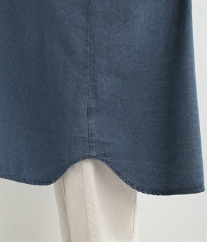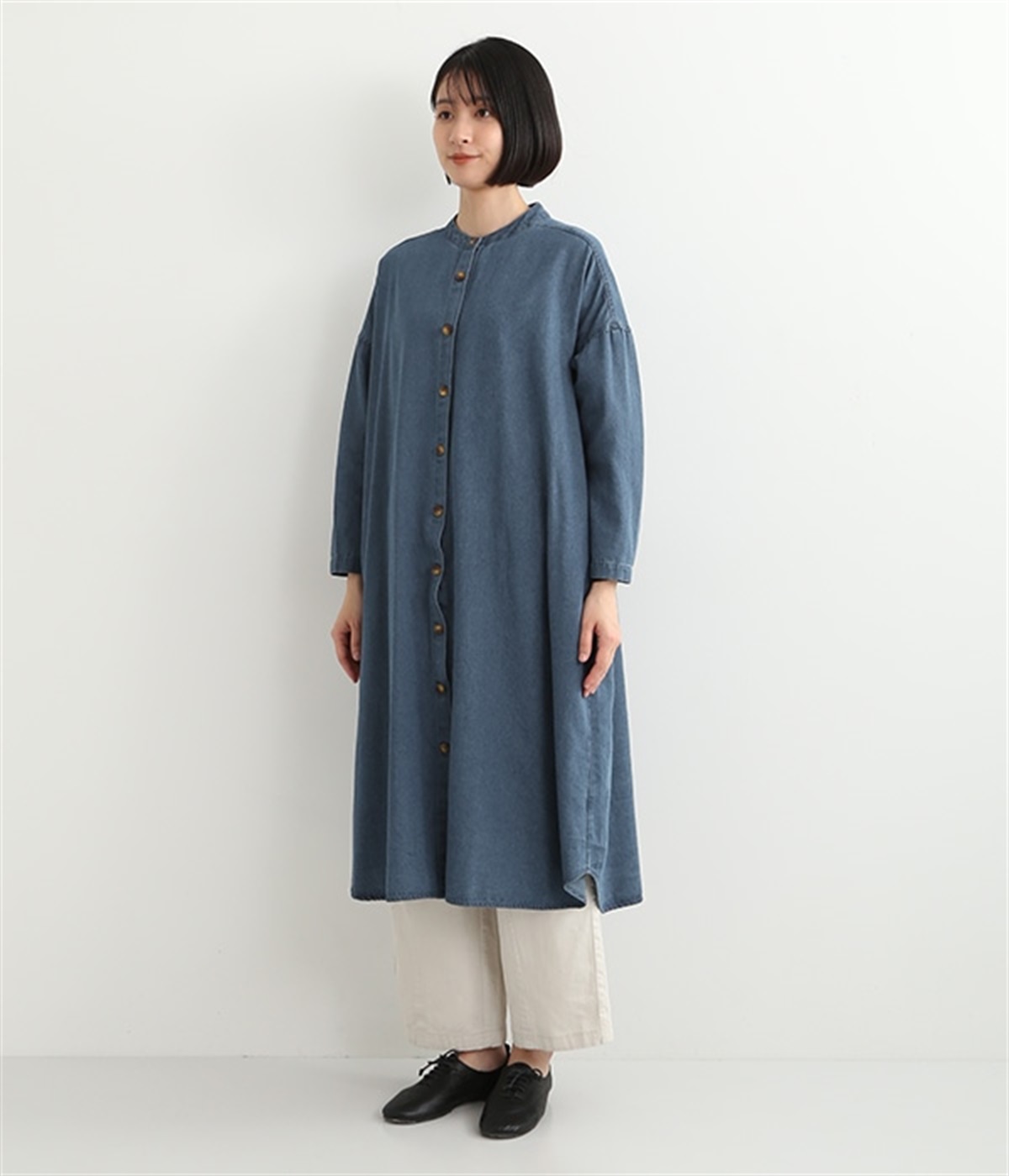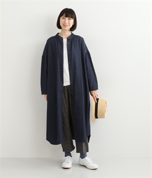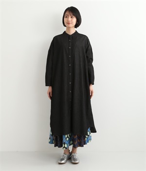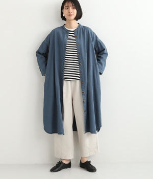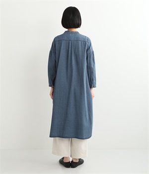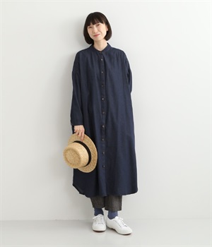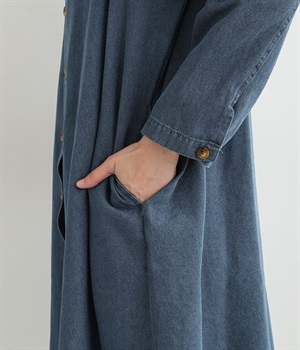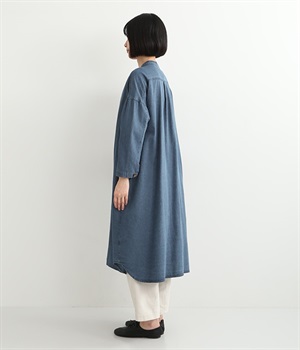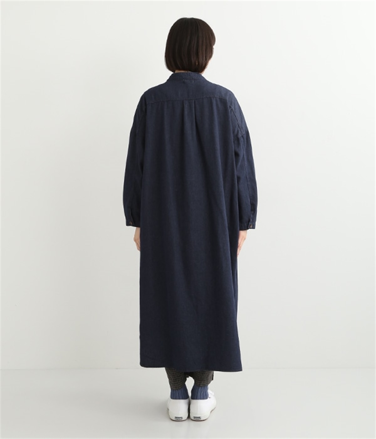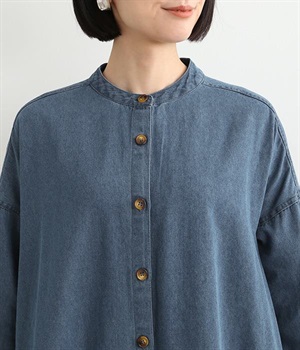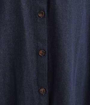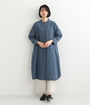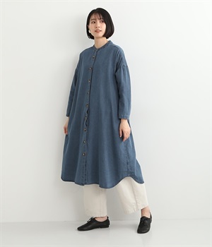 コットンのサラッとした風合いが特徴的なデニムワンピースです。首元はすっきりとしたバンドカラーに、べっ甲柄のボタンがアクセントになった前開きタイプ。身幅も広くゆったりと着ることができます。前開きで羽織として取り入れるのもおすすめで、様々な着こなしでロングシーズン活躍しそうです。