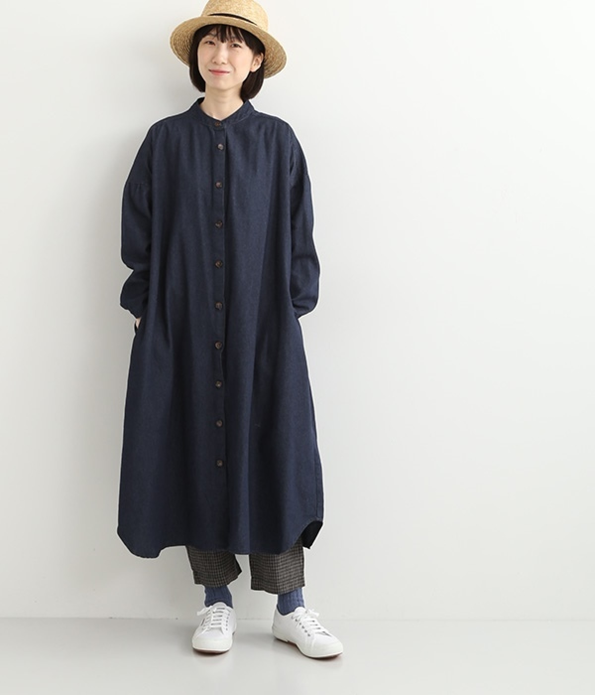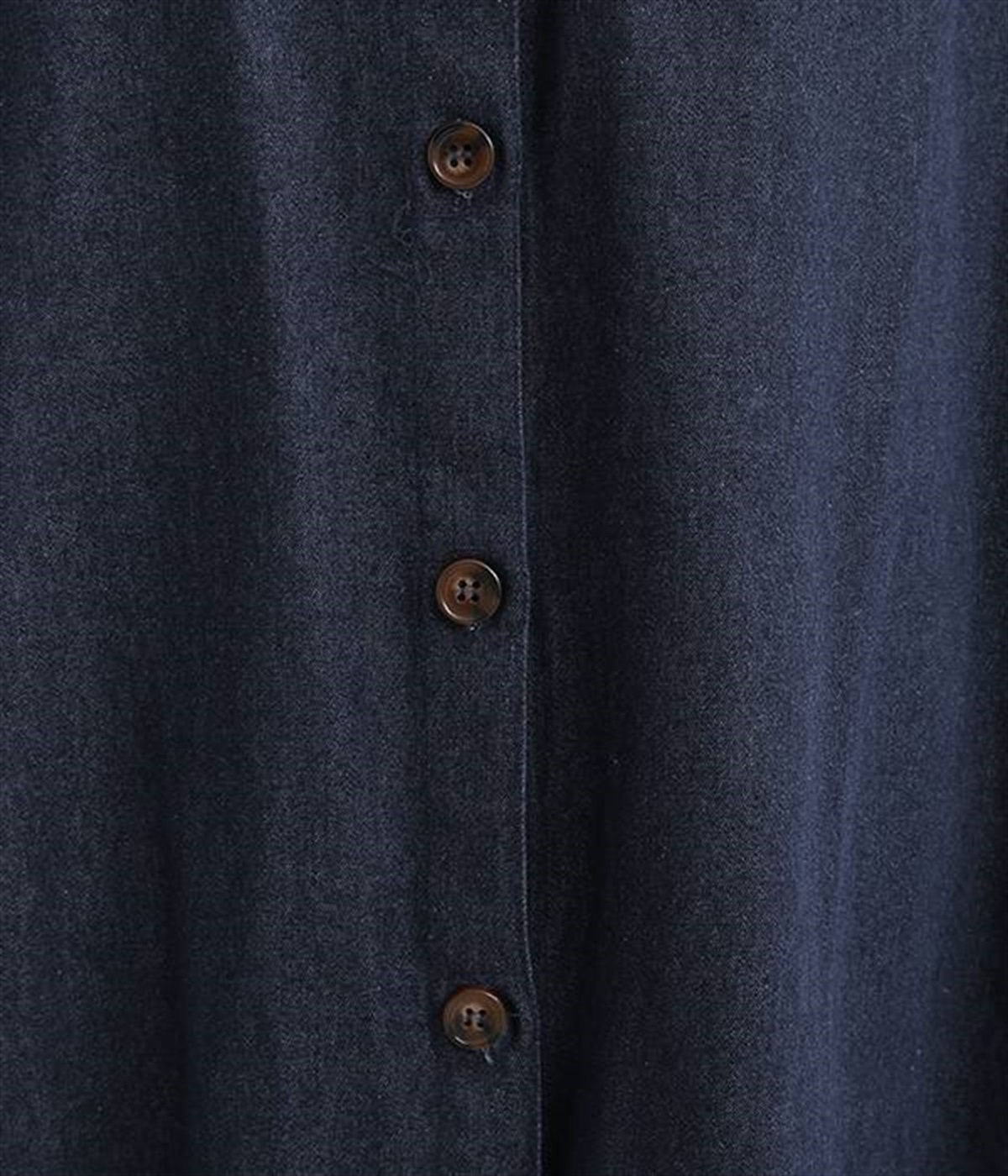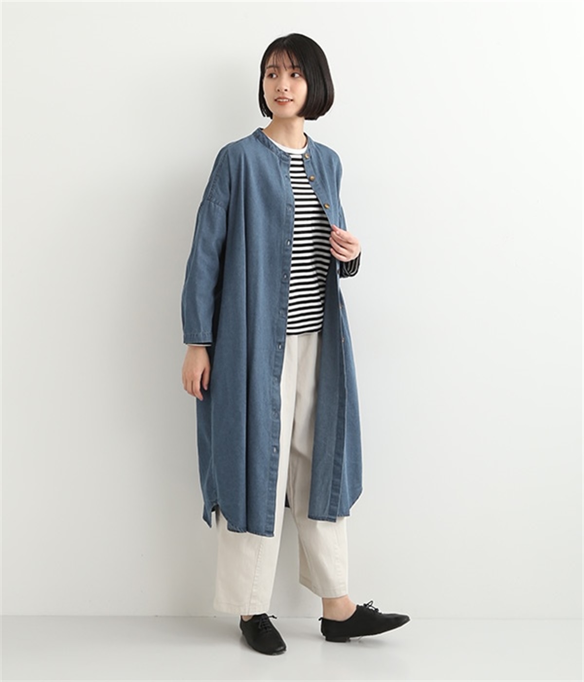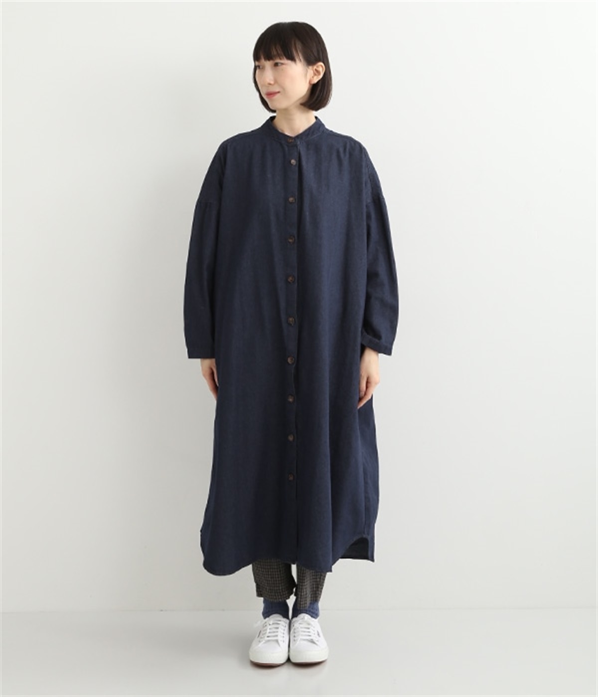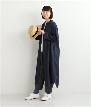 コットンのサラッとした風合いが特徴的なデニムワンピースです。首元はすっきりとしたバンドカラーに、べっ甲柄のボタンがアクセントになった前開きタイプ。身幅も広くゆったりと着ることができます。前開きで羽織として取り入れるのもおすすめで、様々な着こなしでロングシーズン活躍しそうです。