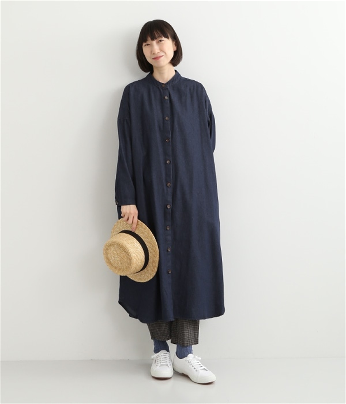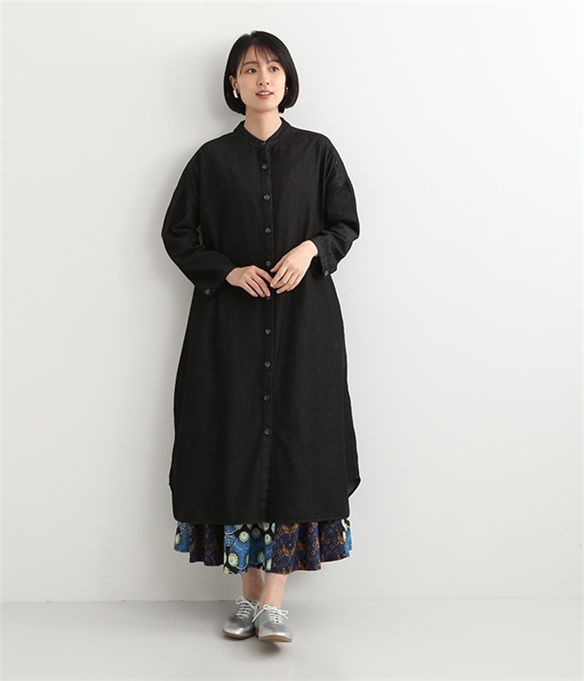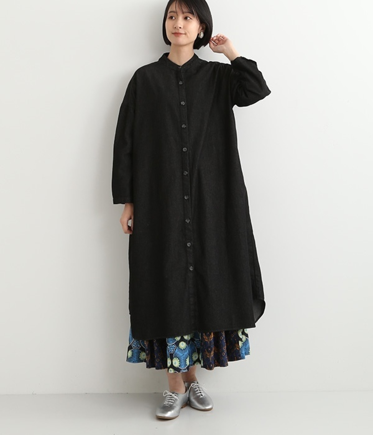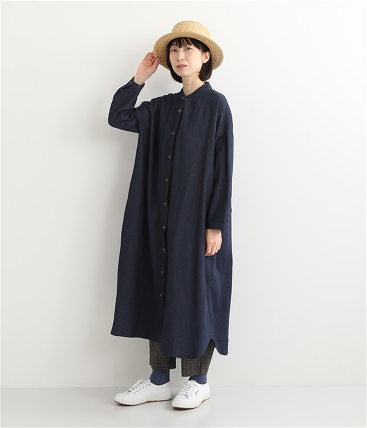 コットンのサラッとした風合いが特徴的なデニムワンピースです。首元はすっきりとしたバンドカラーに、べっ甲柄のボタンがアクセントになった前開きタイプ。身幅も広くゆったりと着ることができます。前開きで羽織として取り入れるのもおすすめで、様々な着こなしでロングシーズン活躍しそうです。
