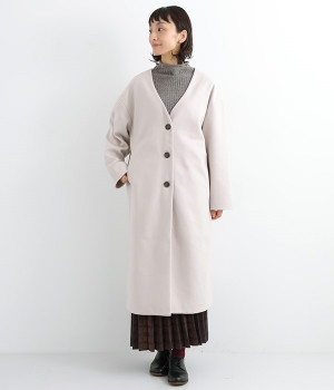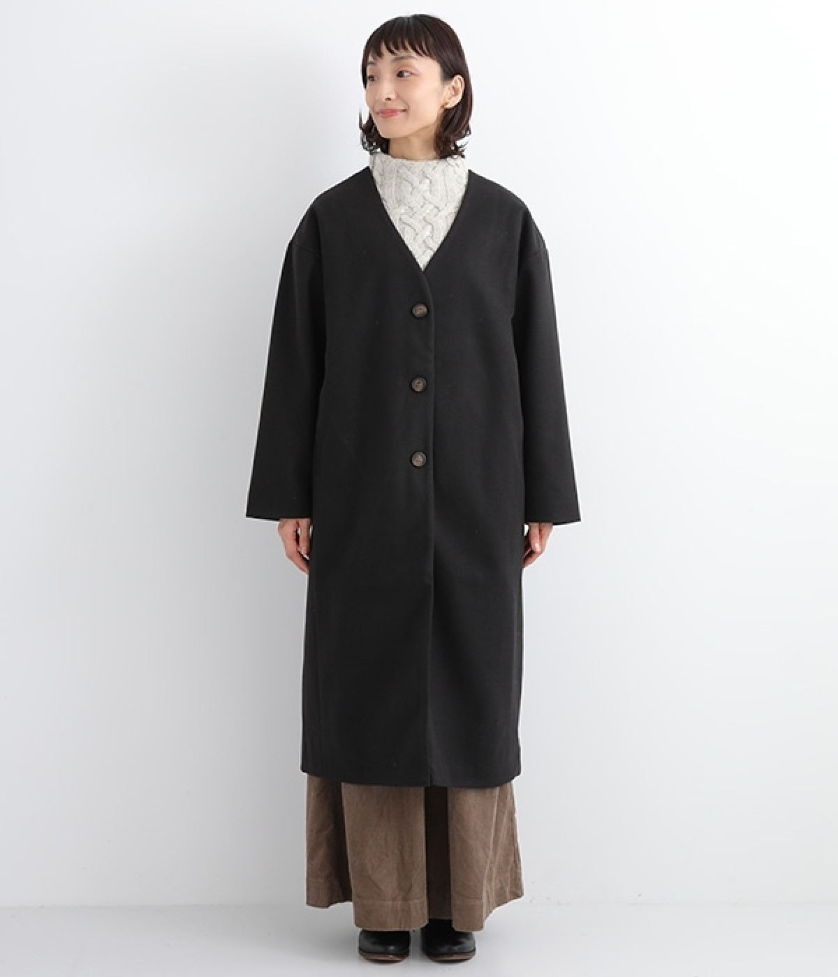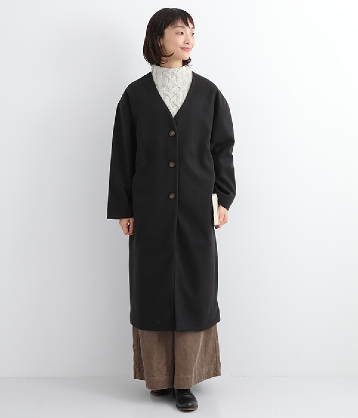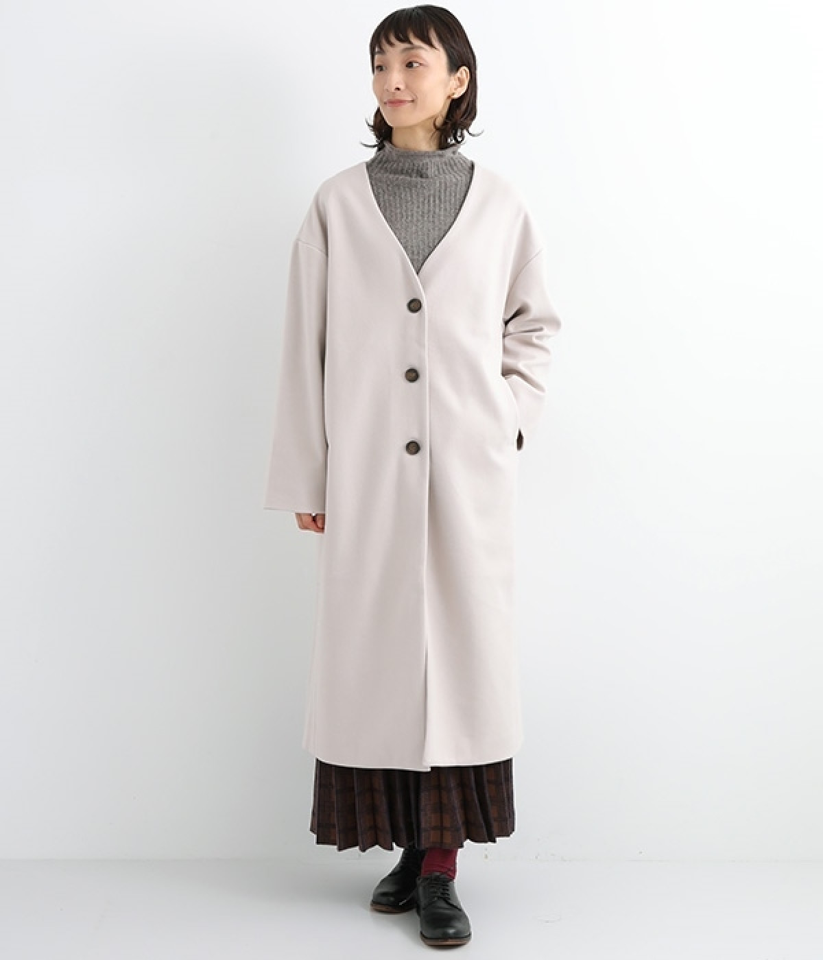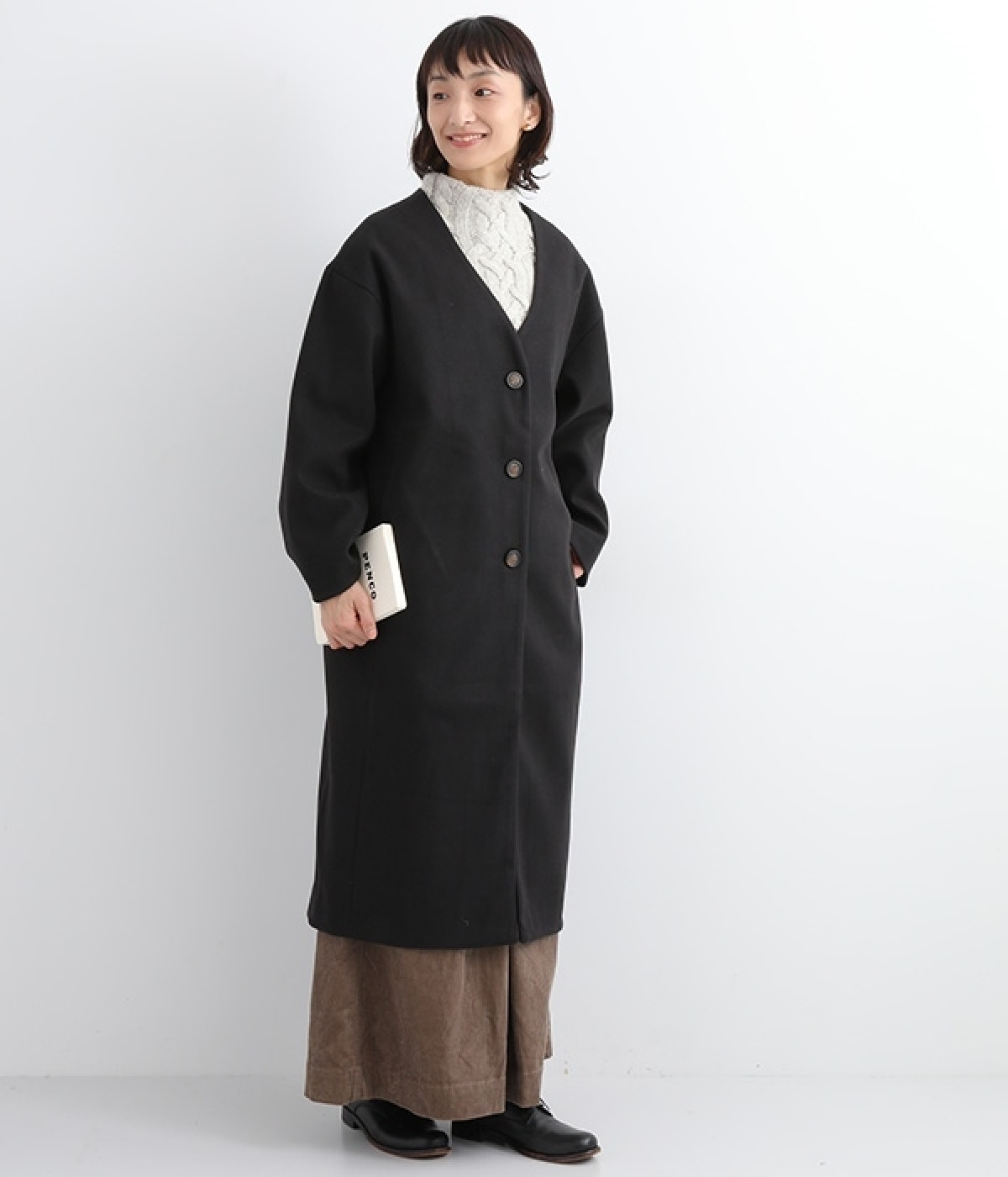 あたたかみのあるウールの風合いに寄せたロングコート。タテのラインを引き立てるストレートシルエットは、カジュアルだけでなくきれいめの装いにもぴったりです。深めのV開き、バックスリットなどロング丈でも開放的に見せる要素を盛り込みました。ボディにも袖にもインナー生地とのすべりを促す裏地をセット。ボリュームのあるマフラーやスヌードも合わせやすい、Vカラーデザインです。
