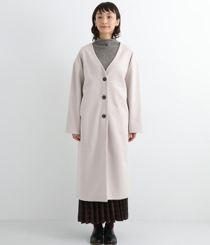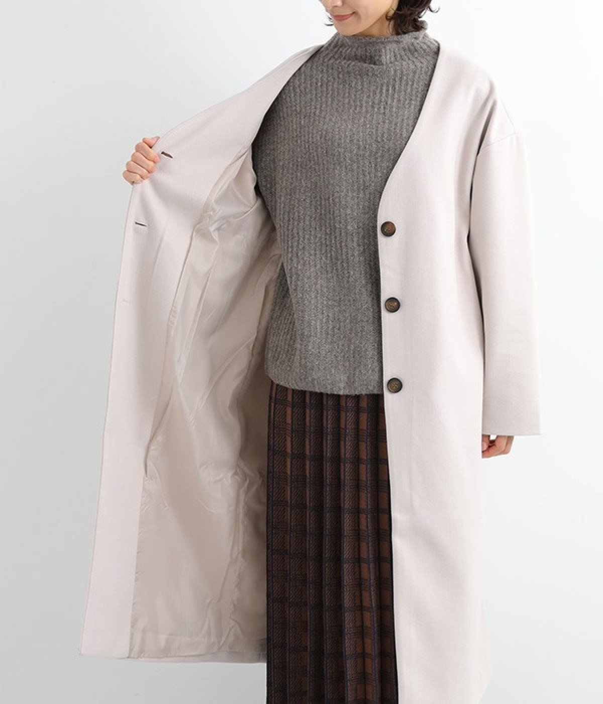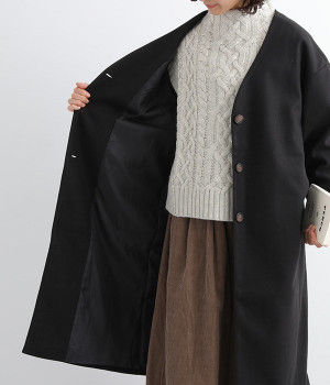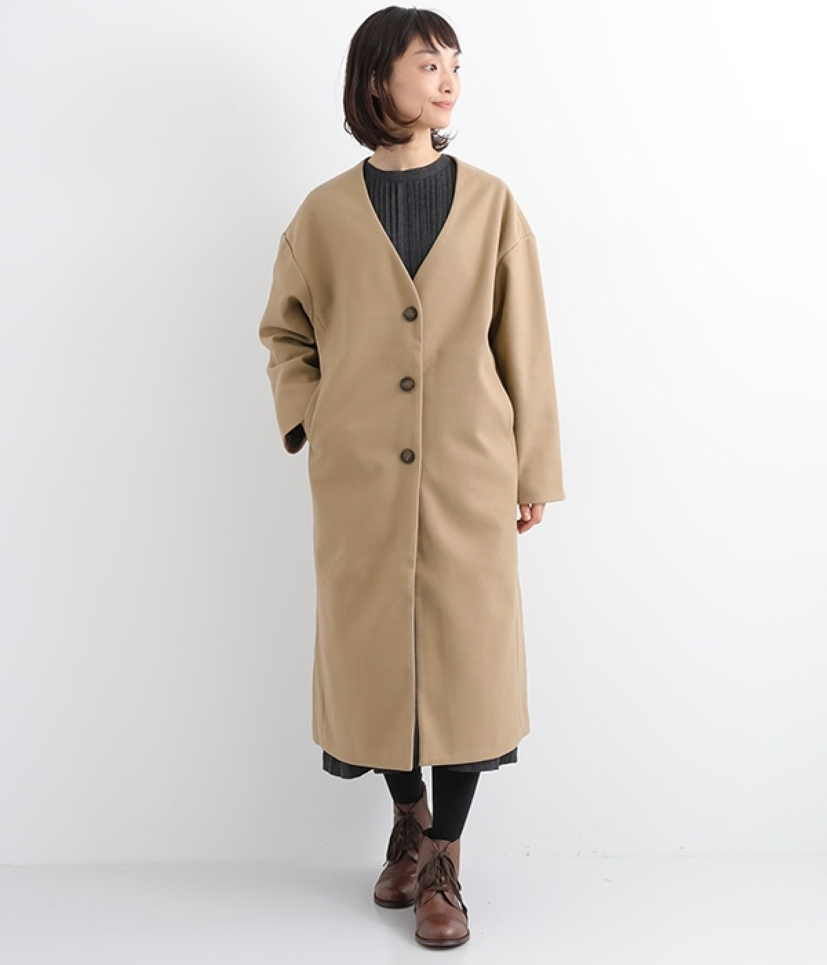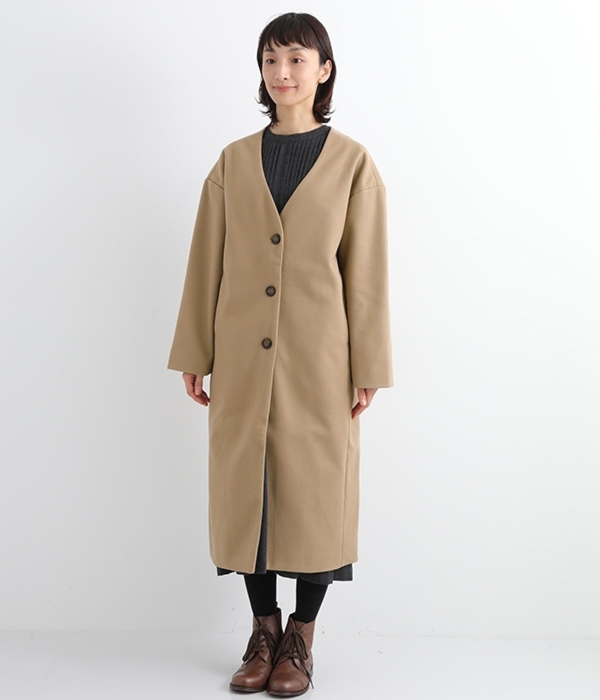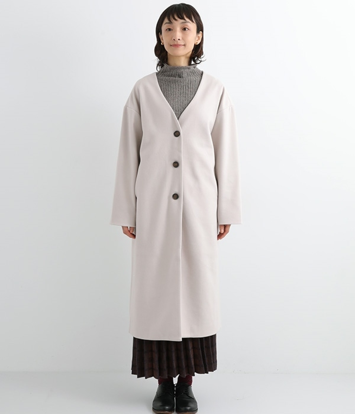 あたたかみのあるウールの風合いに寄せたロングコート。タテのラインを引き立てるストレートシルエットは、カジュアルだけでなくきれいめの装いにもぴったりです。深めのV開き、バックスリットなどロング丈でも開放的に見せる要素を盛り込みました。ボディにも袖にもインナー生地とのすべりを促す裏地をセット。ボリュームのあるマフラーやスヌードも合わせやすい、Vカラーデザインです。