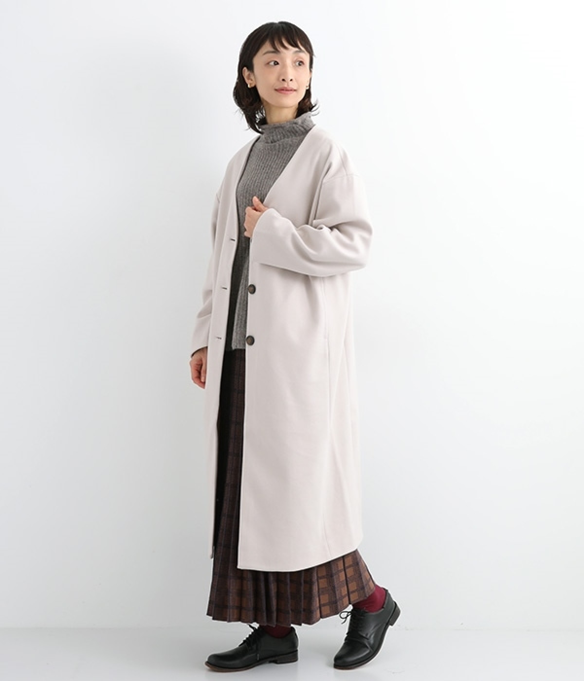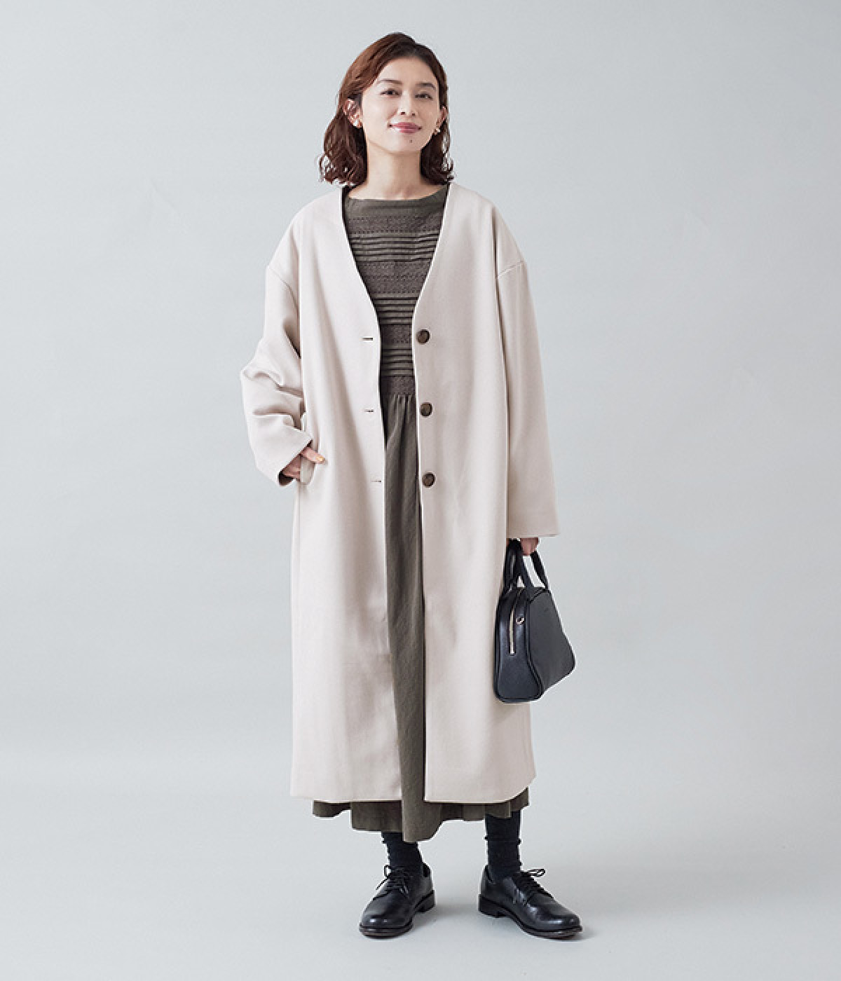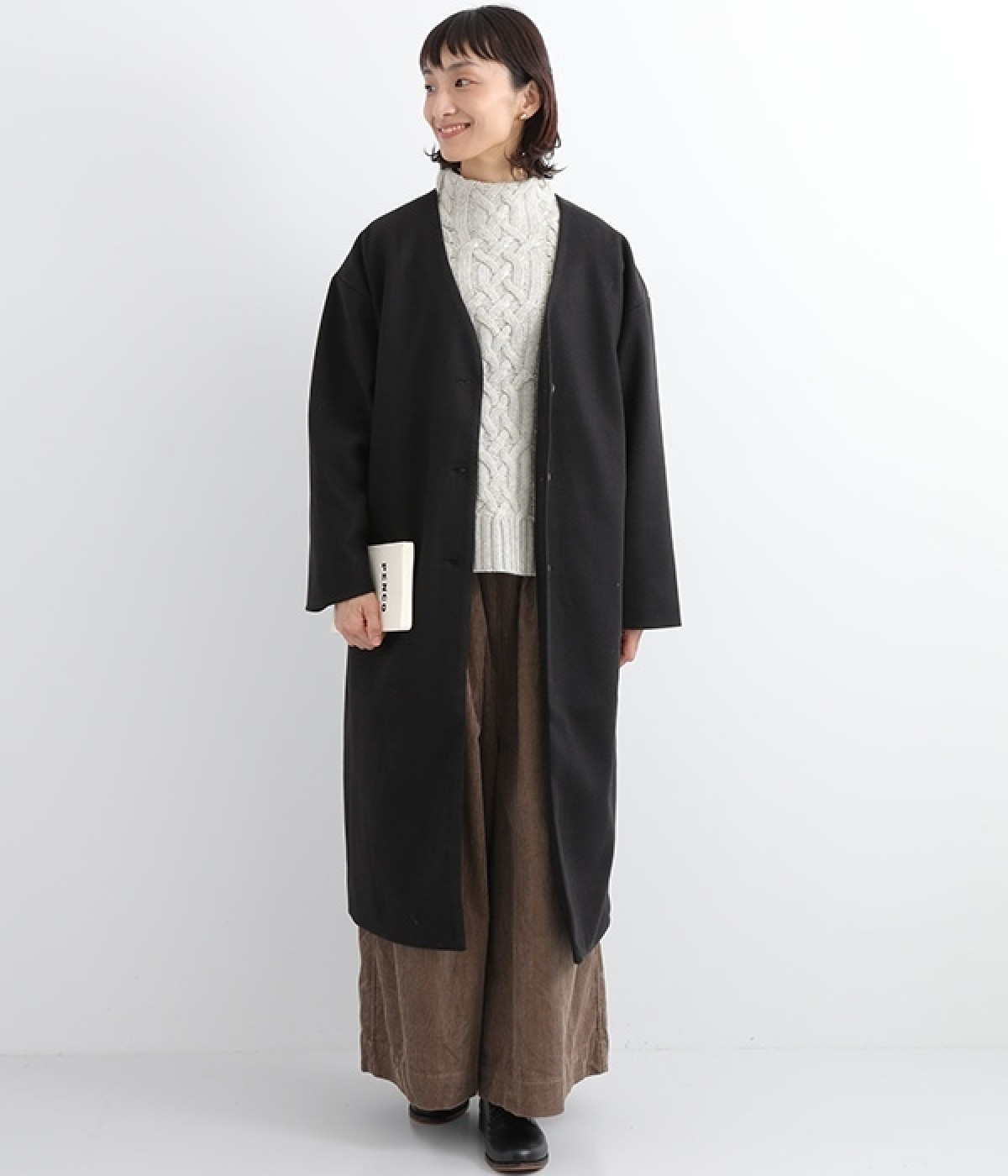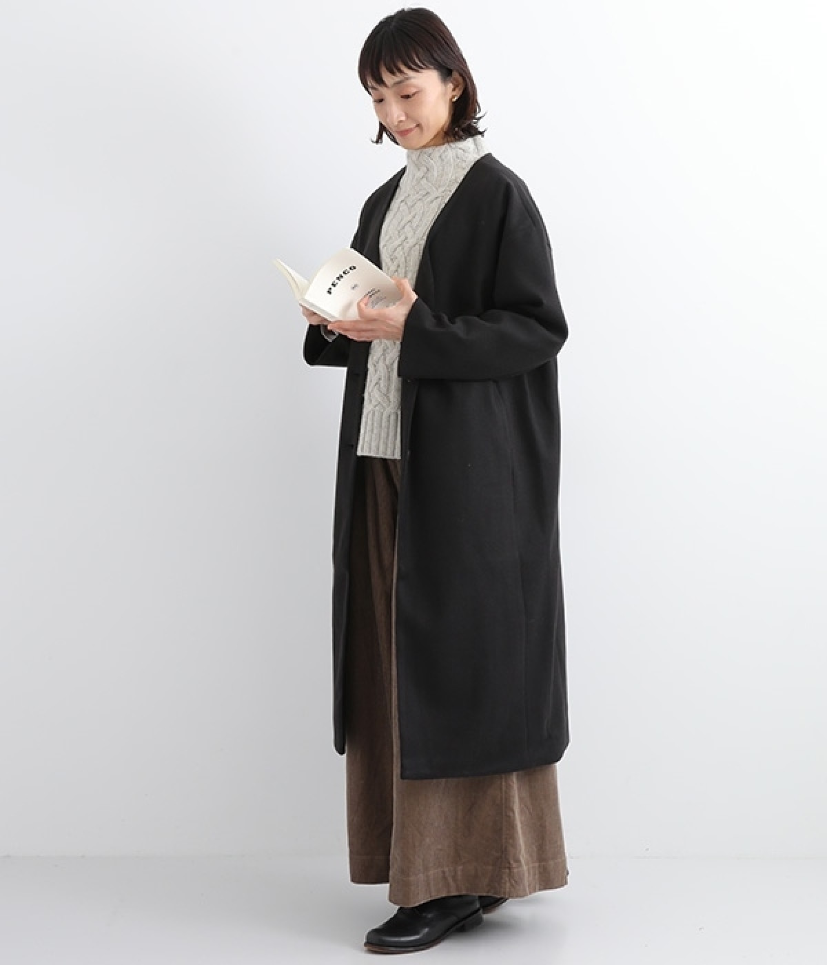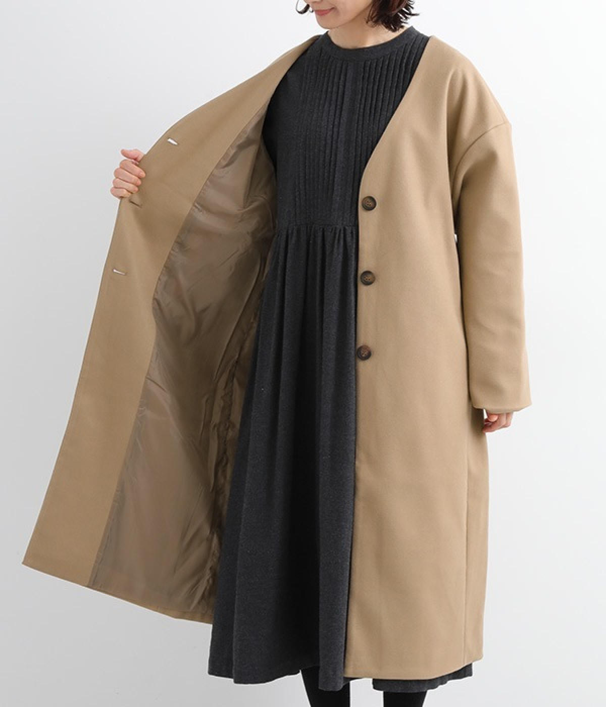 あたたかみのあるウールの風合いに寄せたロングコート。タテのラインを引き立てるストレートシルエットは、カジュアルだけでなくきれいめの装いにもぴったりです。深めのV開き、バックスリットなどロング丈でも開放的に見せる要素を盛り込みました。ボディにも袖にもインナー生地とのすべりを促す裏地をセット。ボリュームのあるマフラーやスヌードも合わせやすい、Vカラーデザインです。