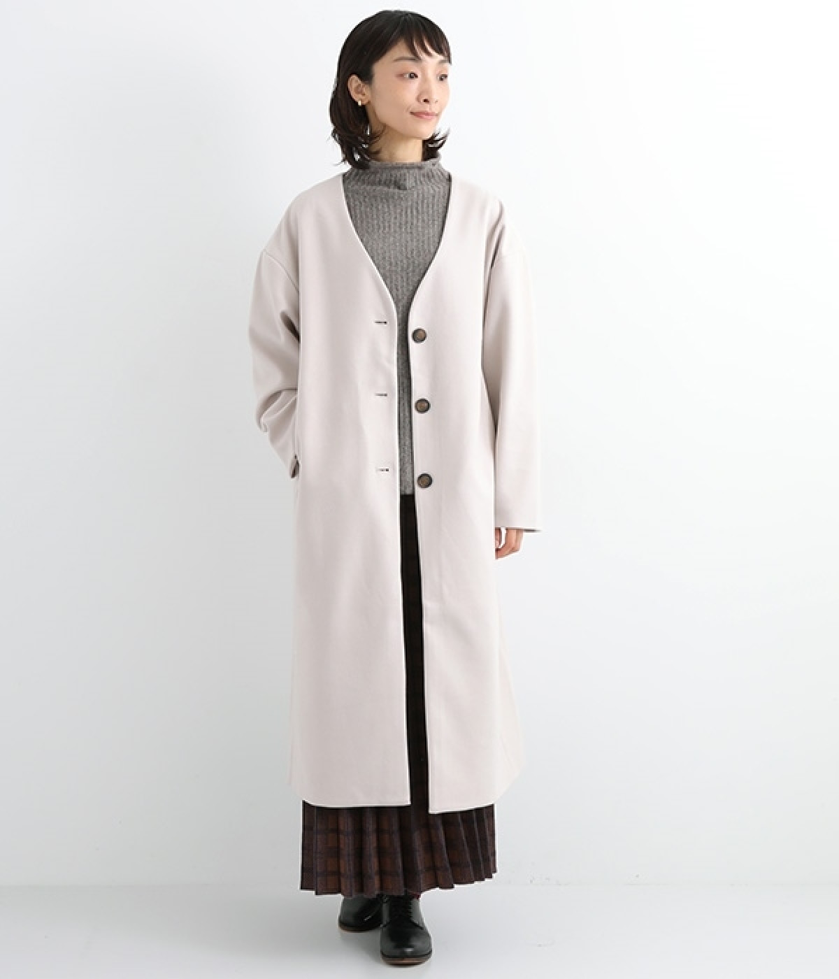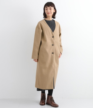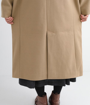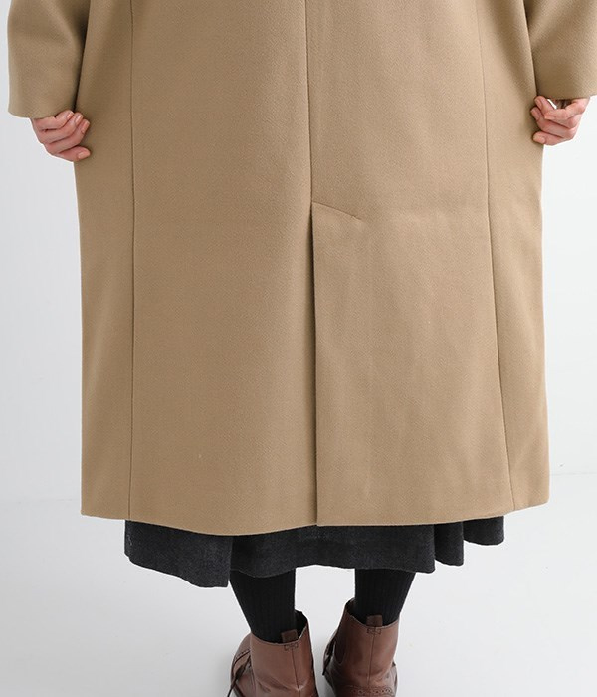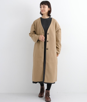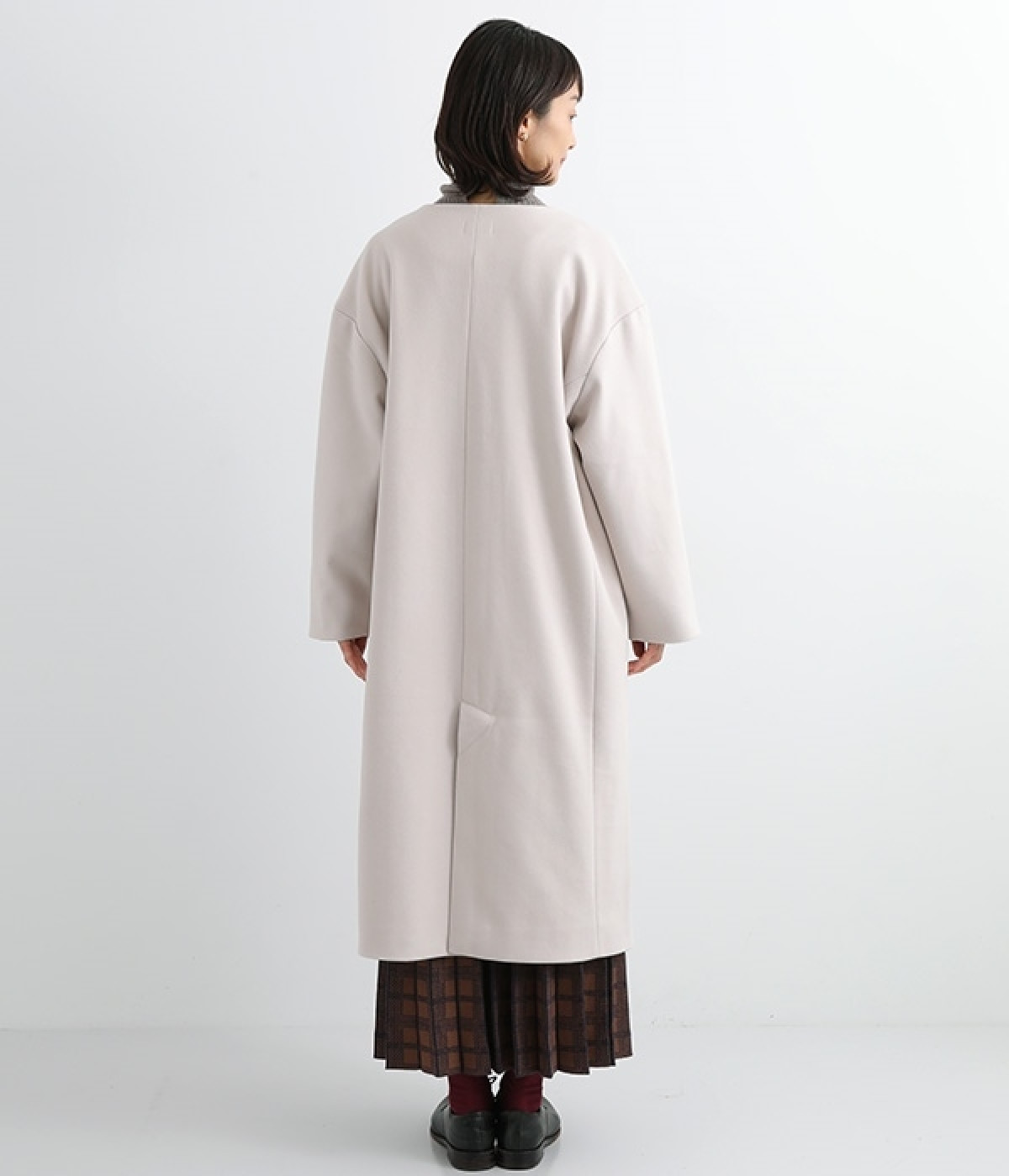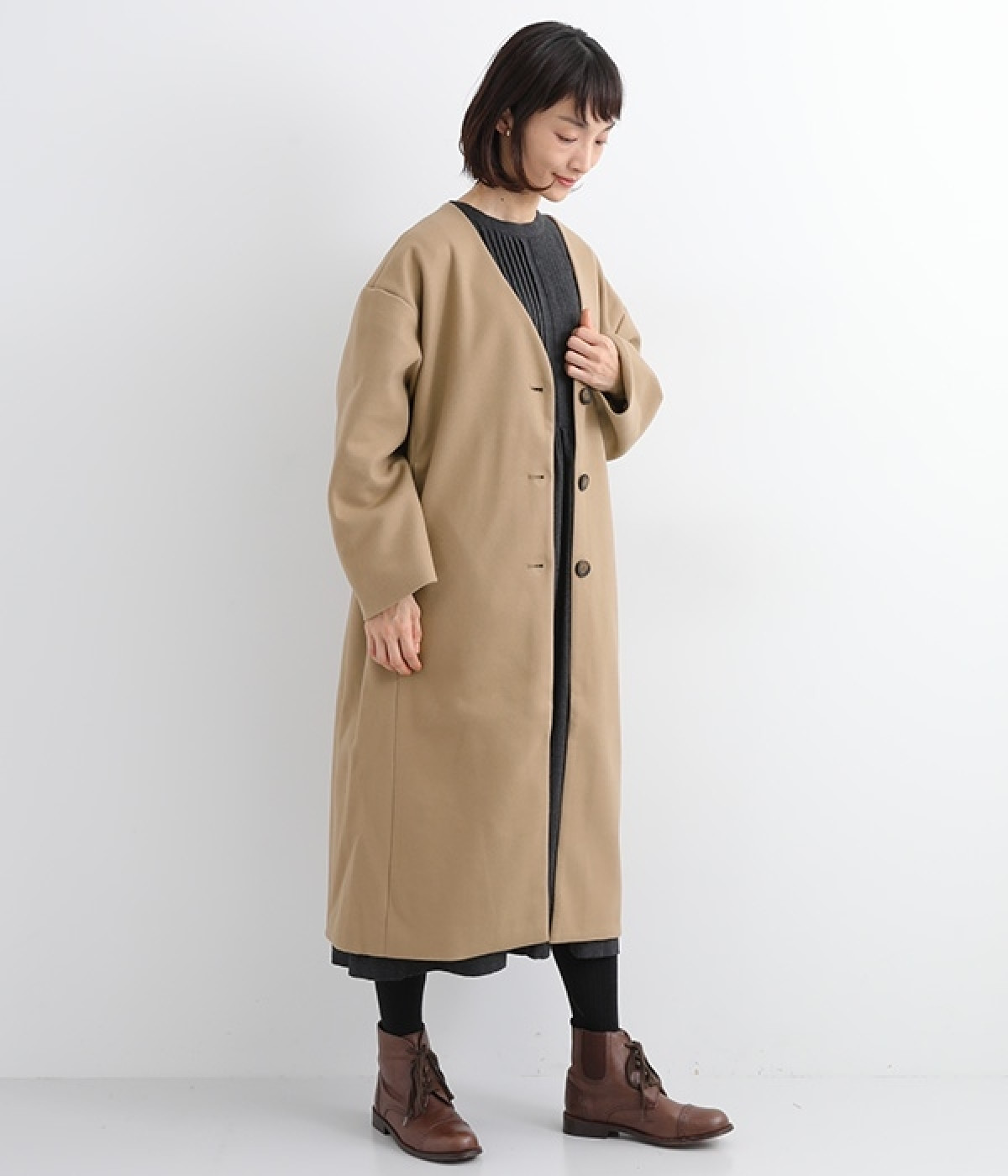 あたたかみのあるウールの風合いに寄せたロングコート。タテのラインを引き立てるストレートシルエットは、カジュアルだけでなくきれいめの装いにもぴったりです。深めのV開き、バックスリットなどロング丈でも開放的に見せる要素を盛り込みました。ボディにも袖にもインナー生地とのすべりを促す裏地をセット。ボリュームのあるマフラーやスヌードも合わせやすい、Vカラーデザインです。
