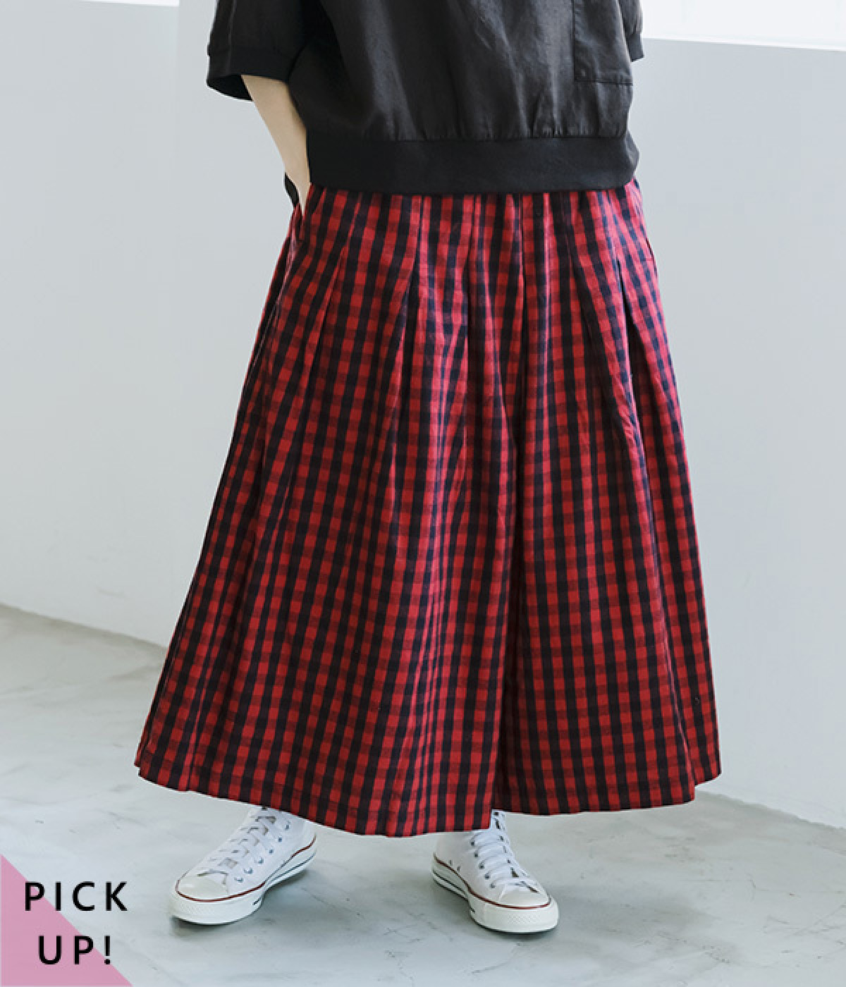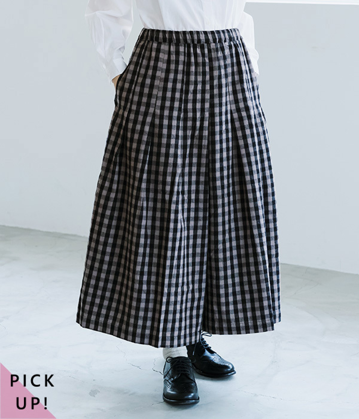 たっぷり生地を使ってフレアに仕上げた、スカート見えするチェック柄パンツです。ウエストまわりは広がりすぎないようタックを入れて、すっきり見えを可能に。あたたかみのある優しい肌触りの綿ビエラ生地を使用。ウエストにはやさしいフィット感のゴムを通し、脱ぎはきも楽に行えます。内ひもにより細かなサイズ調整も可能です。