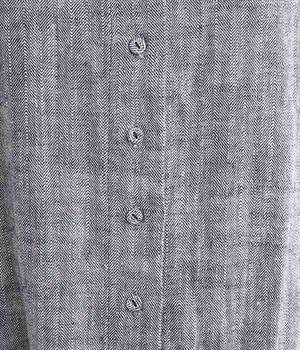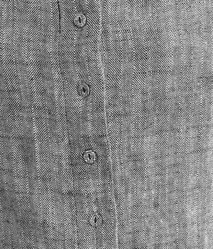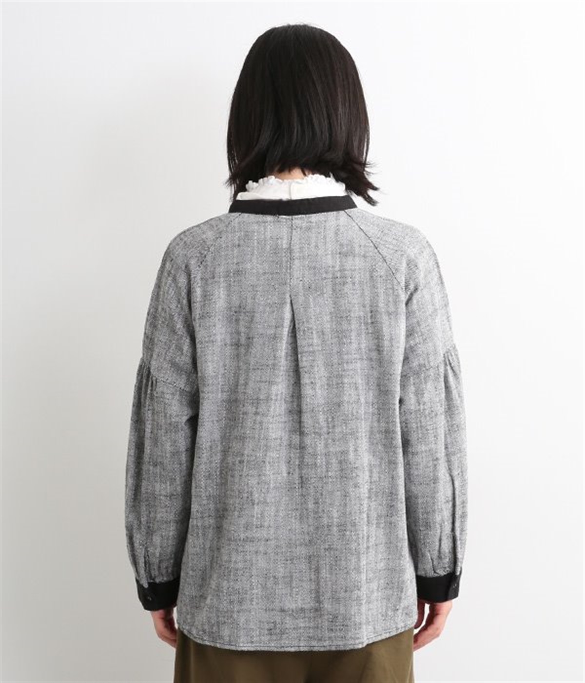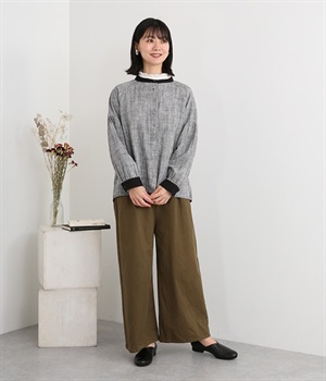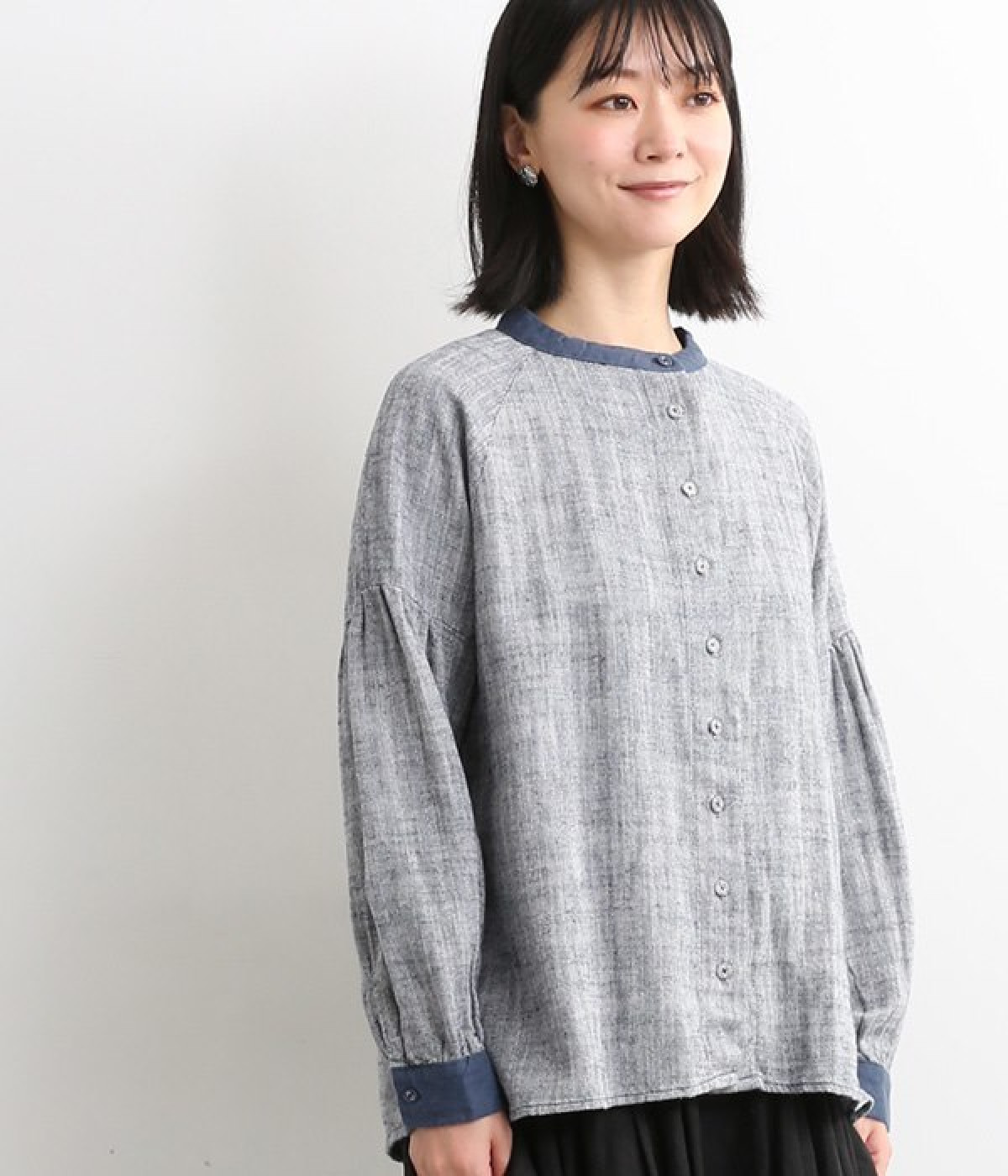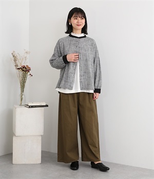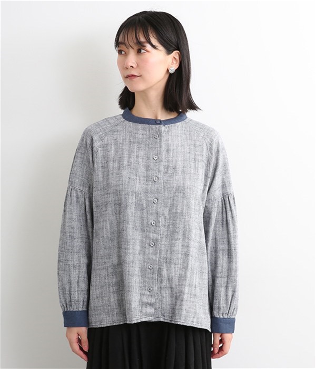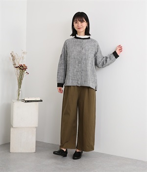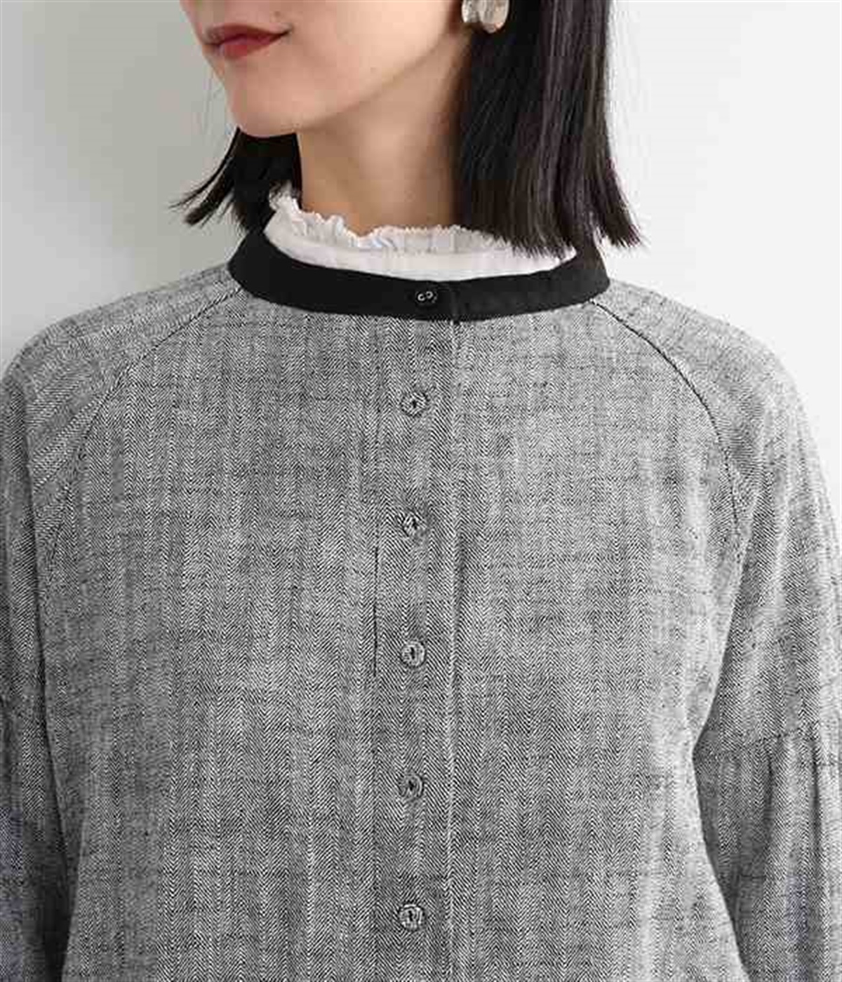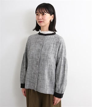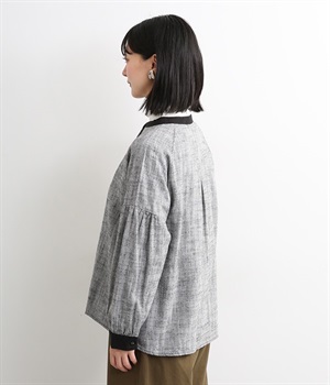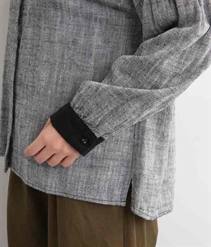 綿麻のへリンボーンの生地で仕立てたブラウスです。控えめなツヤと、2色の糸が織りなす杢目調の色合いが美しく、上品な雰囲気が醸し出されます。首元と袖口には別生地を使用し、配色でメリハリを加えました。ボディカラーに合わせて配した共布のクルミボタンは、さり気ないこだわりのディテールです。一枚着としてはもちろんのこと、前を開けて軽めのジャケット感覚でコーディネートに投入するのも素敵です。