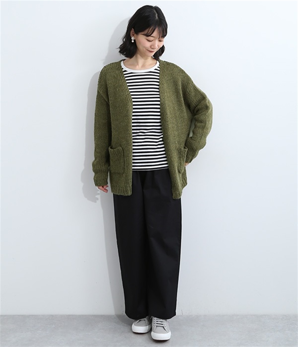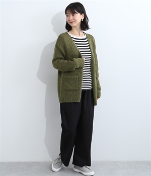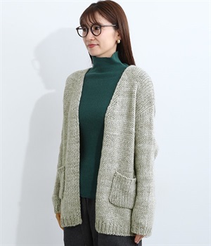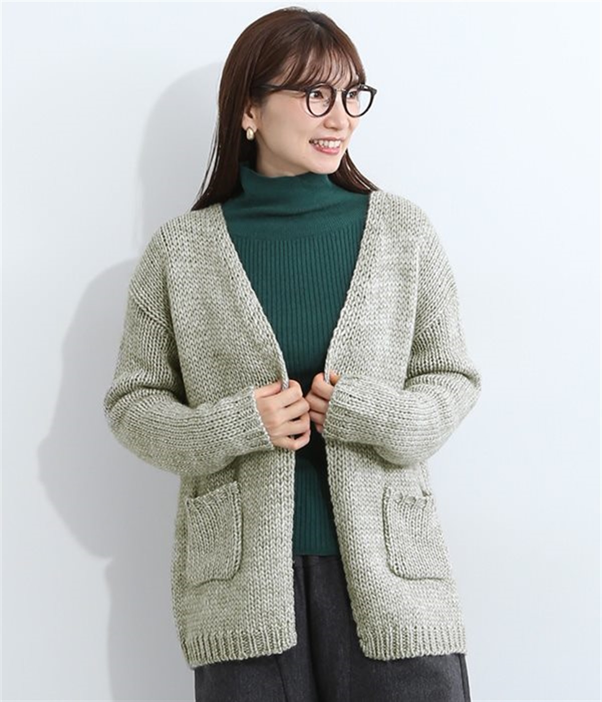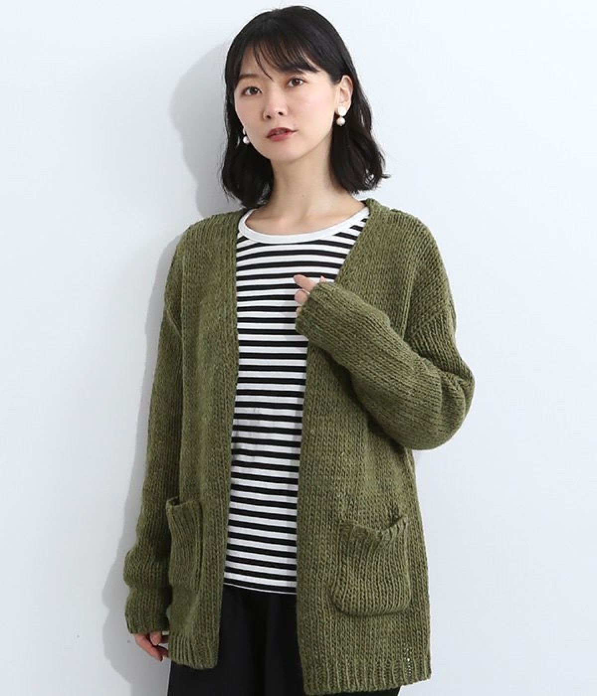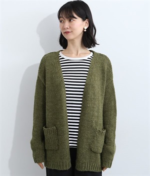 スラブヤーン特有の節を感じ、ナチュラルな風合いが楽しめるニットカーディガン。体をそっと包み込むような、やわらかくあたたかみのある着心地です。目が詰まっていないざっくり感が特徴で、ニットスタイルにカジュアルさを持たせたいときにおすすめ。フロントはボタンのない開放的なデザインでさっと羽織れ、おでかけだけでなくおうちでの防寒対策用にも◎。左右に添えたパッチポケットも細かな手まわり品を入れるのに便利です。