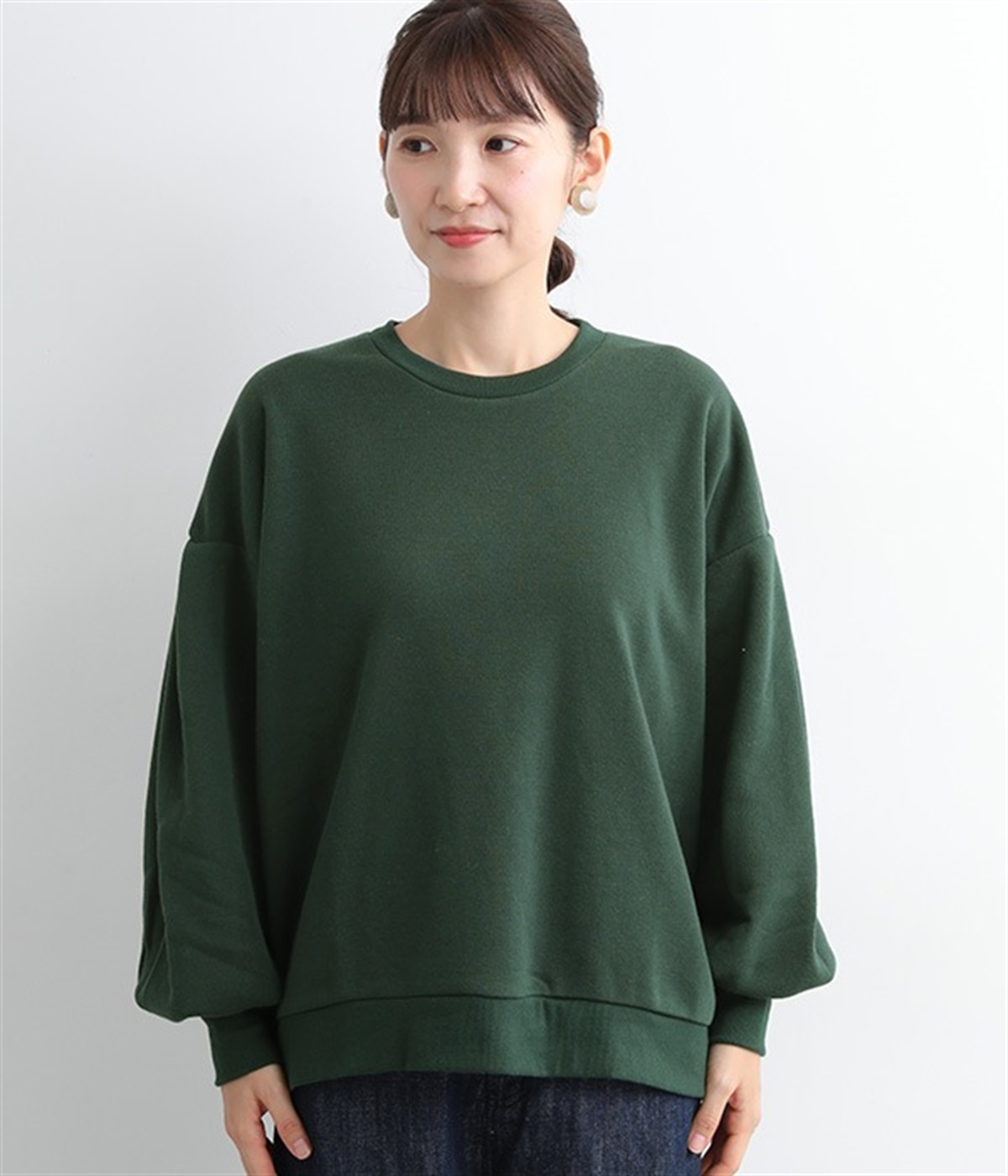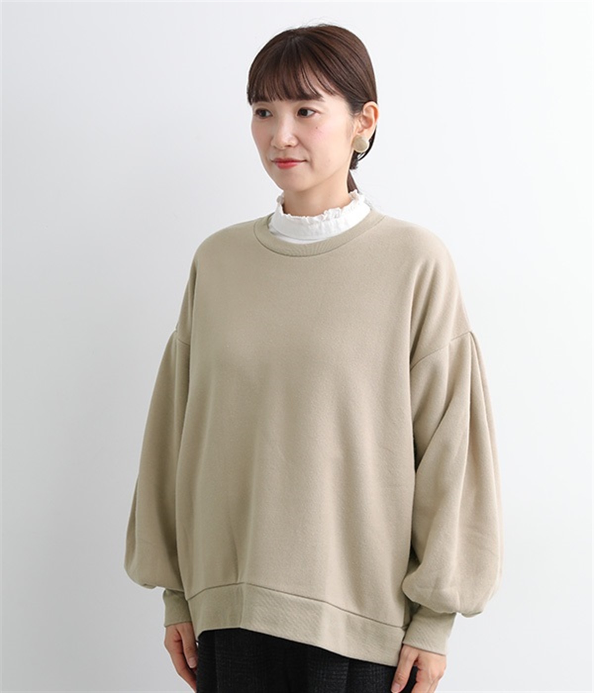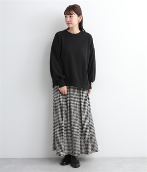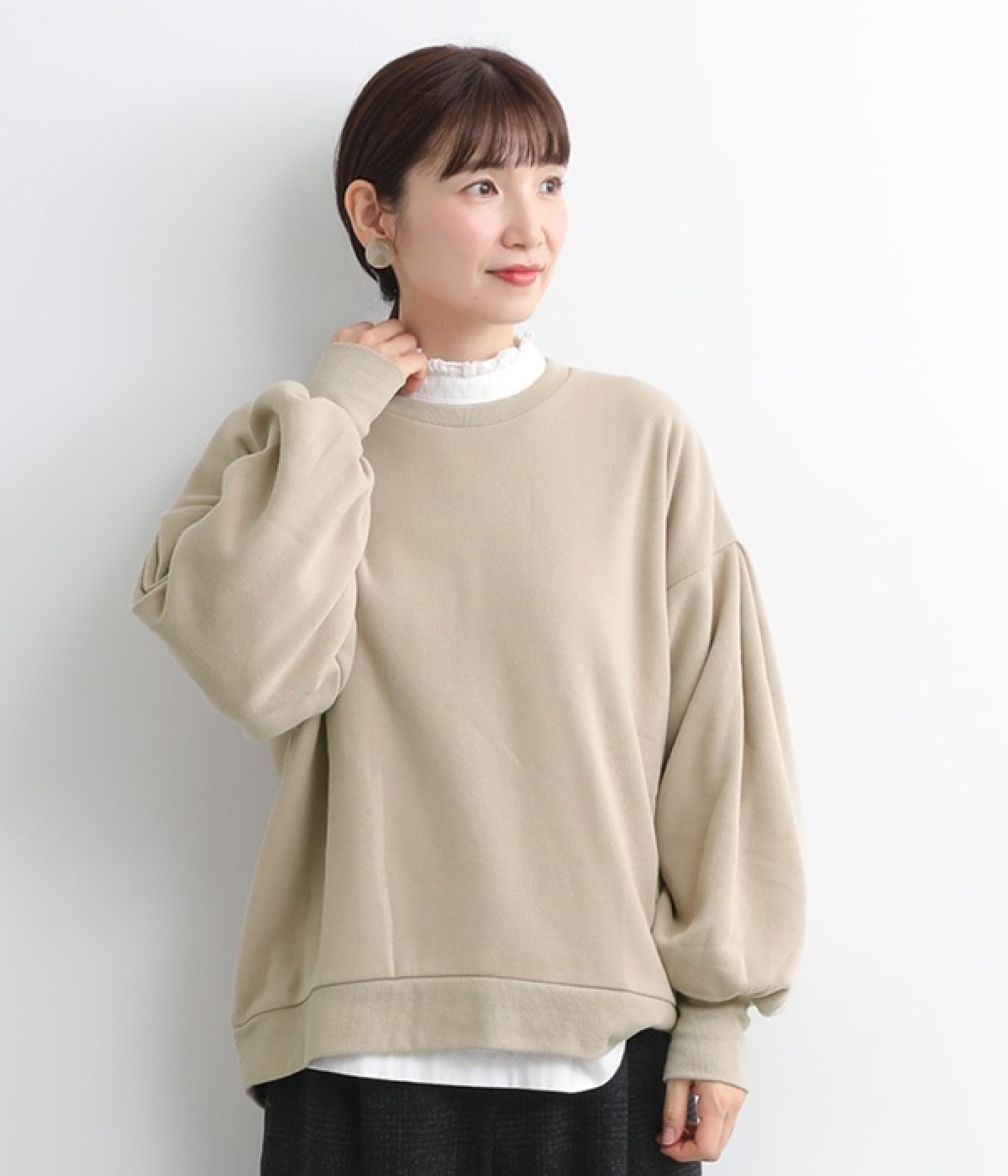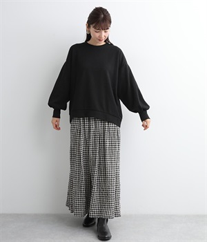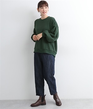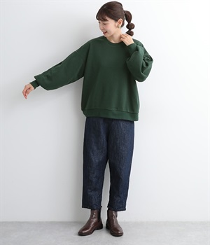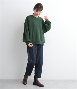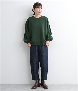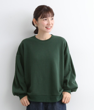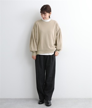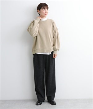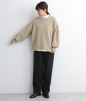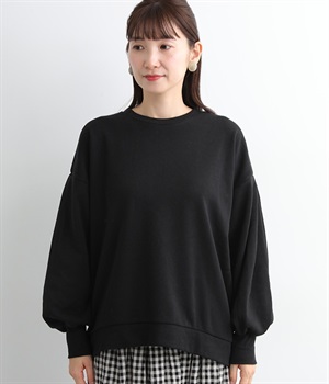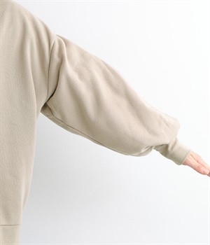 裏起毛加工を施した、あたたかくやさしい肌触りのプルオーバーです。バルーンスリーブがポイントで、カジュアルなスウェット生地にかわいらしさを添えています。ほどよい厚みとハリがあり、シルエットがすっきりと出るのもうれしいポイント。合わせるボトムを選ばない形でさまざまなコーディネートに活躍してくれます。