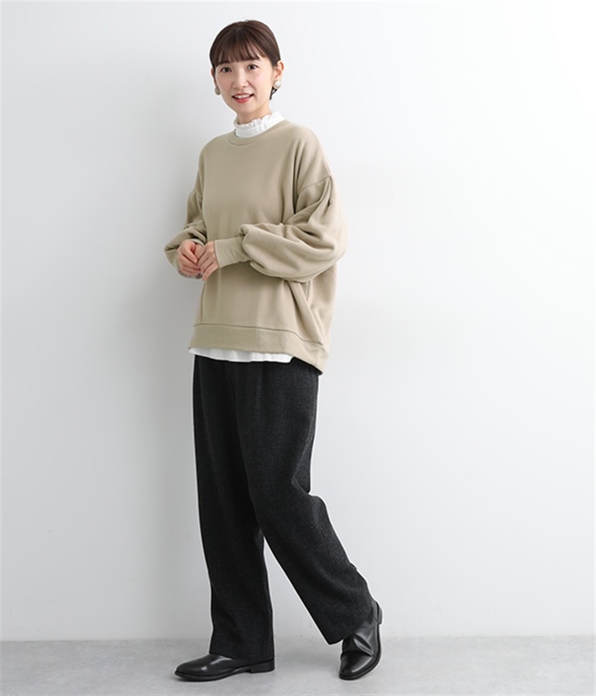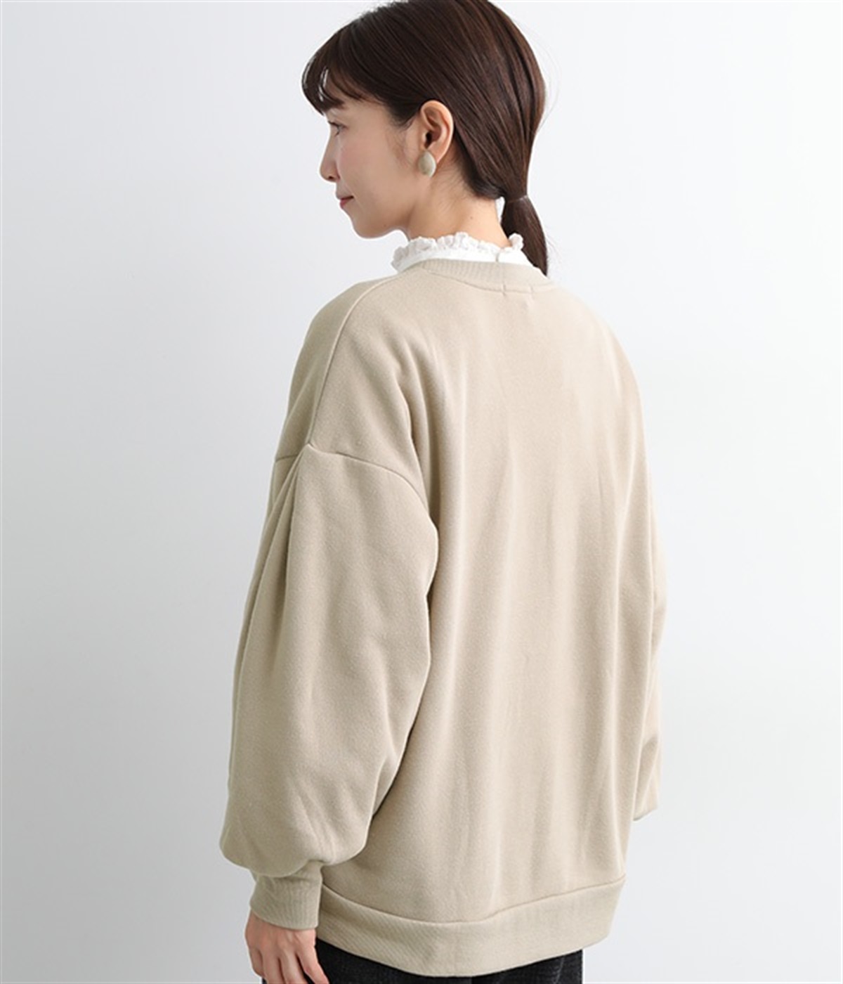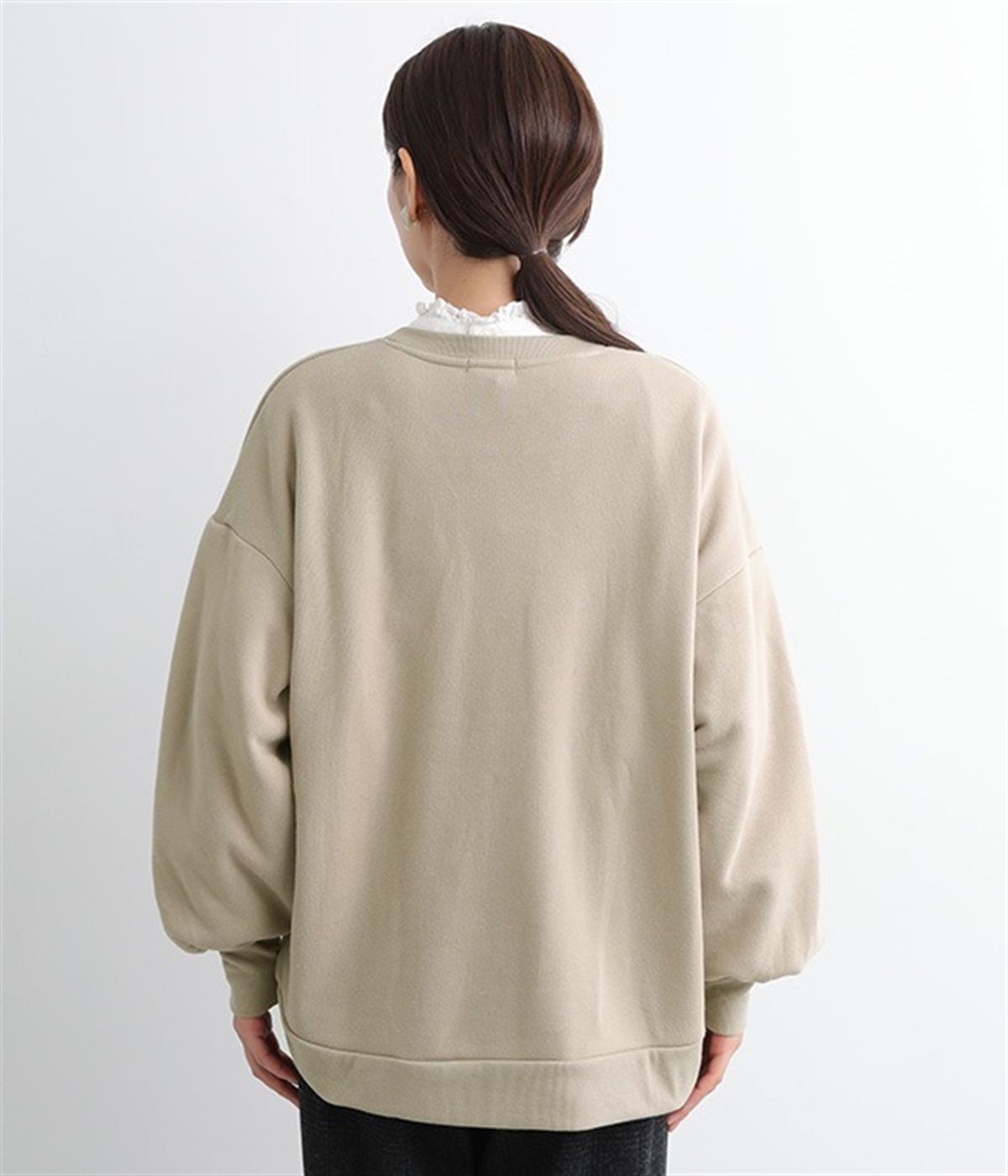 裏起毛加工を施した、あたたかくやさしい肌触りのプルオーバーです。バルーンスリーブがポイントで、カジュアルなスウェット生地にかわいらしさを添えています。ほどよい厚みとハリがあり、シルエットがすっきりと出るのもうれしいポイント。合わせるボトムを選ばない形でさまざまなコーディネートに活躍してくれます。