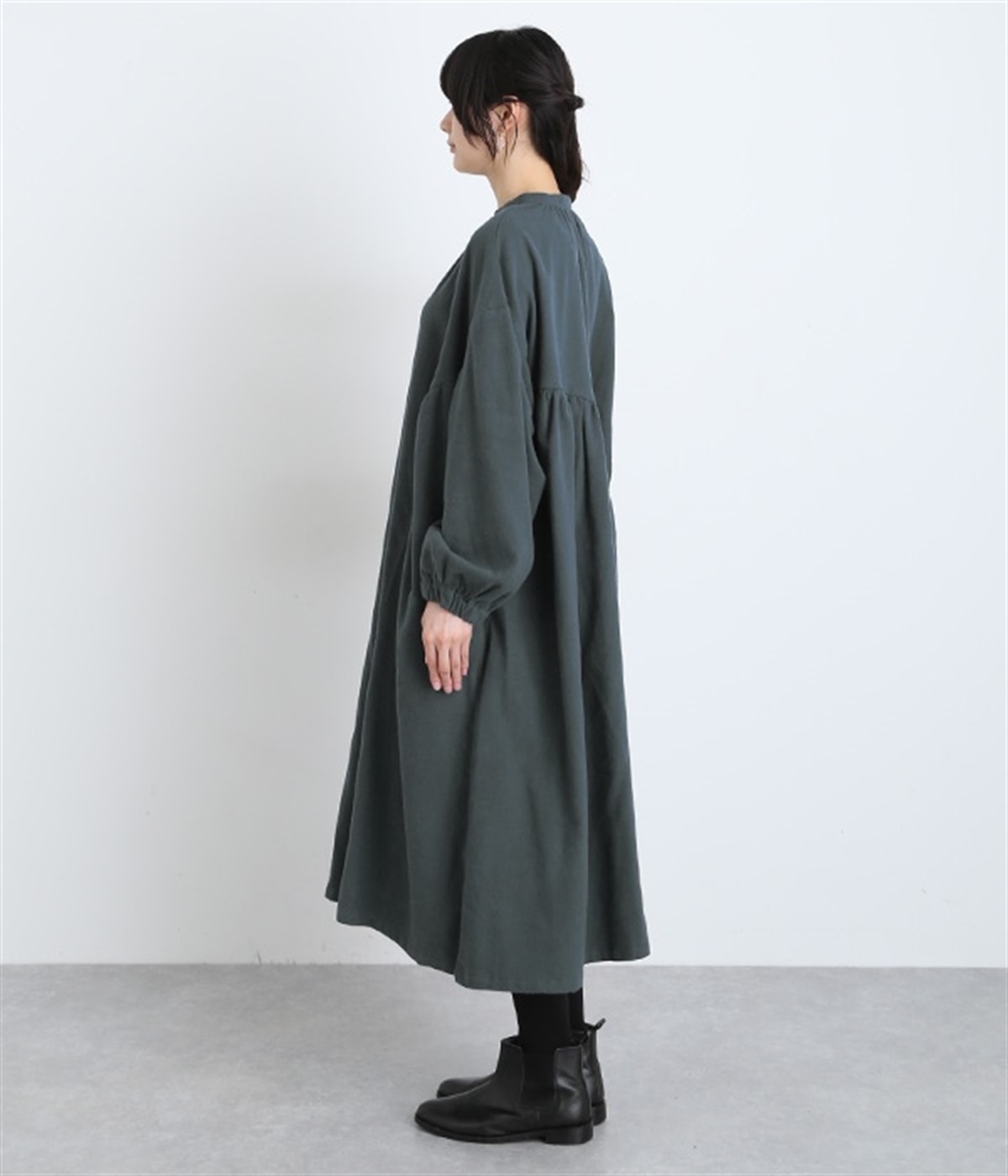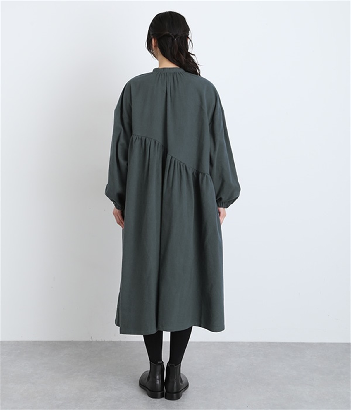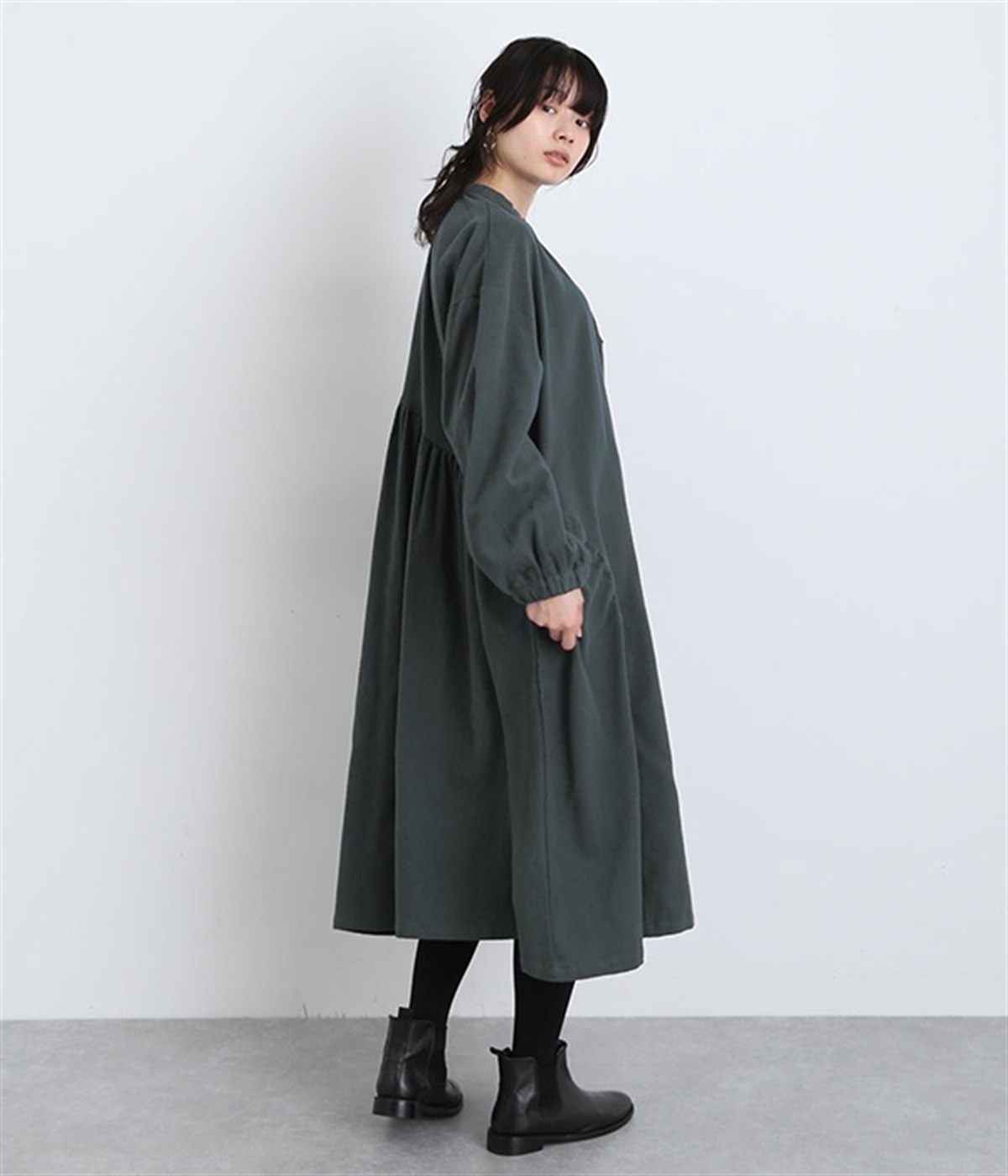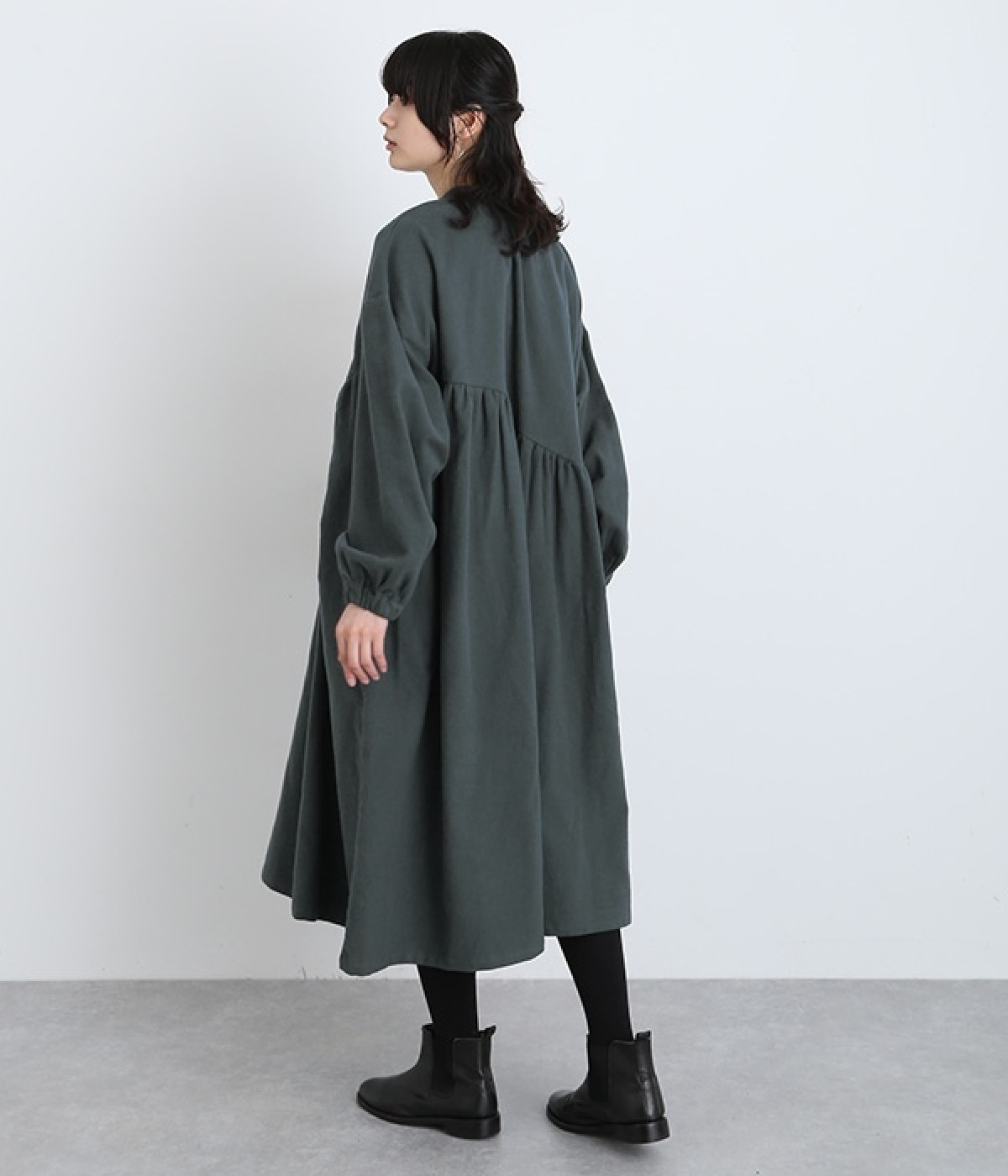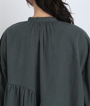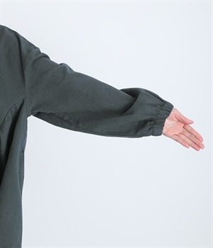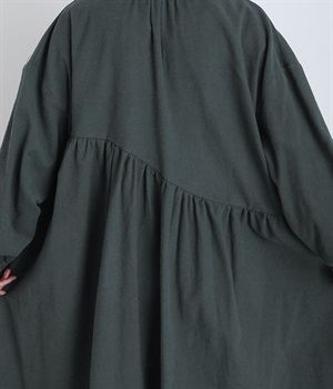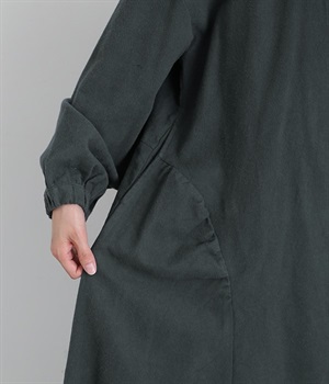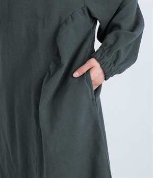 秋冬の着こなしにうれしい、あたたかみのあるコットン起毛素材を使用したワンピース。裏面はドライタッチでさらっとしているため、肌へのはりつきが少なくさわやかに着こなせます。前後でアシンメトリーにカーブ切り替えを入れ、さらに細かなギャザー使いにより立体的&個性的なシルエットに。ぽわんとした袖のデザインを、袖口ゴムがきゅっと引き締めてメリハリをきかせました。シルエットを活かす一枚着ではもちろん、カーディガンやパンツ、スカートを取り入れたレイヤードスタイルも◎。