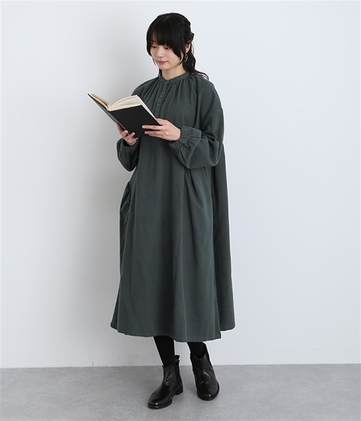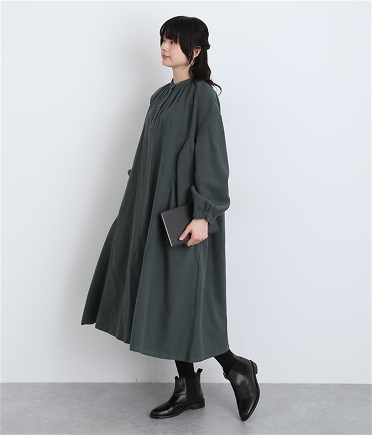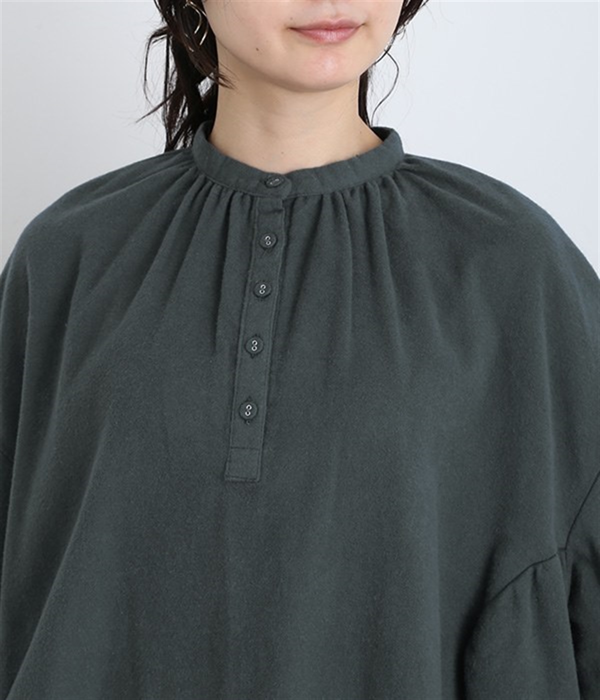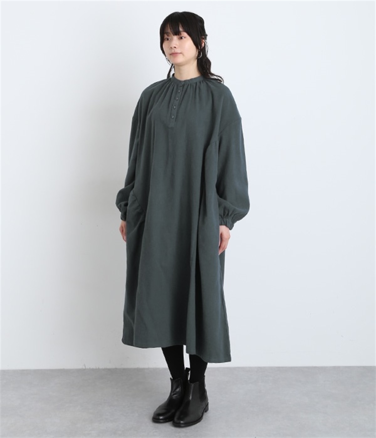 秋冬の着こなしにうれしい、あたたかみのあるコットン起毛素材を使用したワンピース。裏面はドライタッチでさらっとしているため、肌へのはりつきが少なくさわやかに着こなせます。前後でアシンメトリーにカーブ切り替えを入れ、さらに細かなギャザー使いにより立体的&個性的なシルエットに。ぽわんとした袖のデザインを、袖口ゴムがきゅっと引き締めてメリハリをきかせました。シルエットを活かす一枚着ではもちろん、カーディガンやパンツ、スカートを取り入れたレイヤードスタイルも◎。