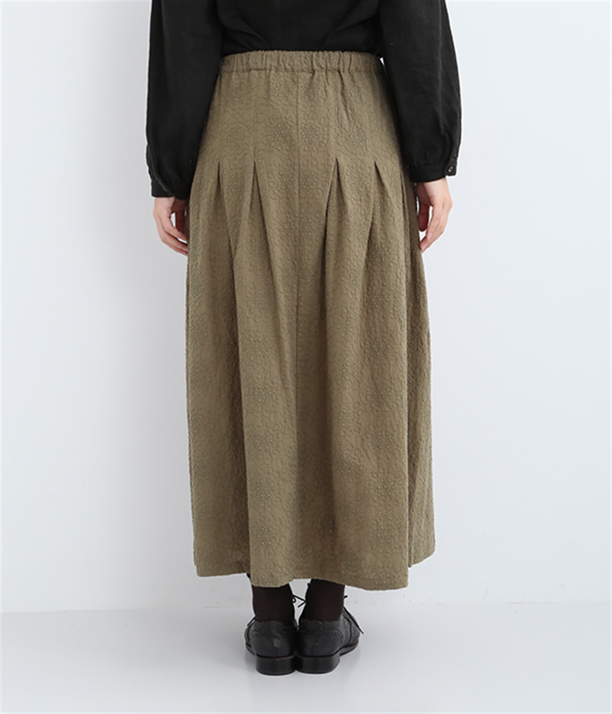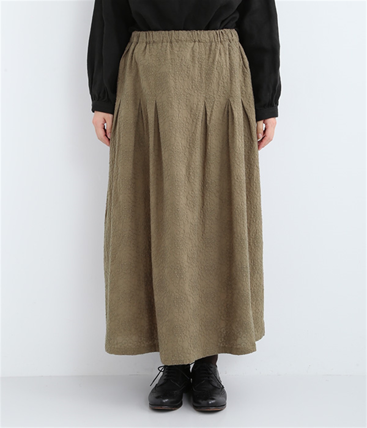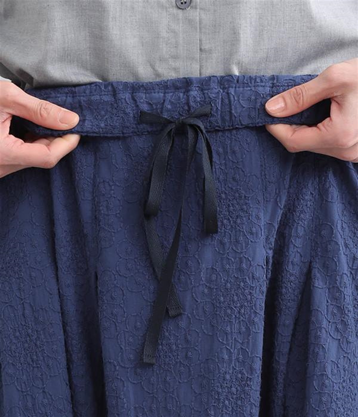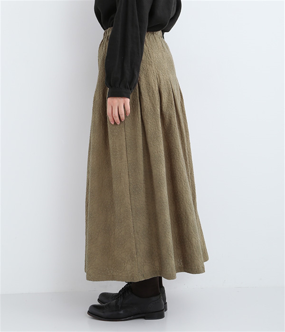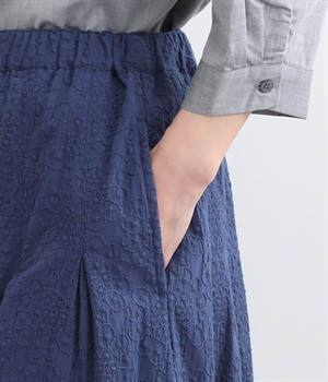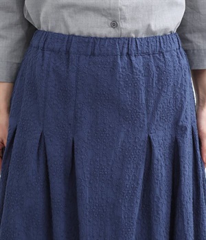 同色糸でほどこした花刺繍を全面にちりばめた表情たっぷりのコットンスカート。腰まわりをすっきり見せる長めのタックをあしらい、裾に向かってきれいなAラインの広がりを描いています。総ゴム仕様のウエストは着脱をアシストし、ストレスの少ない快適な穿き心地。内ひもを備え、フィットの調整が可能です。デイリー使いにはもちろん、ちょっとしたお出かけシーンにも華を添えてくれる一枚です。