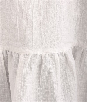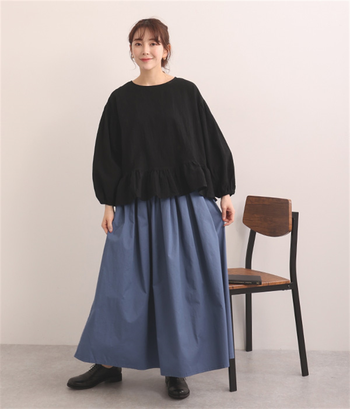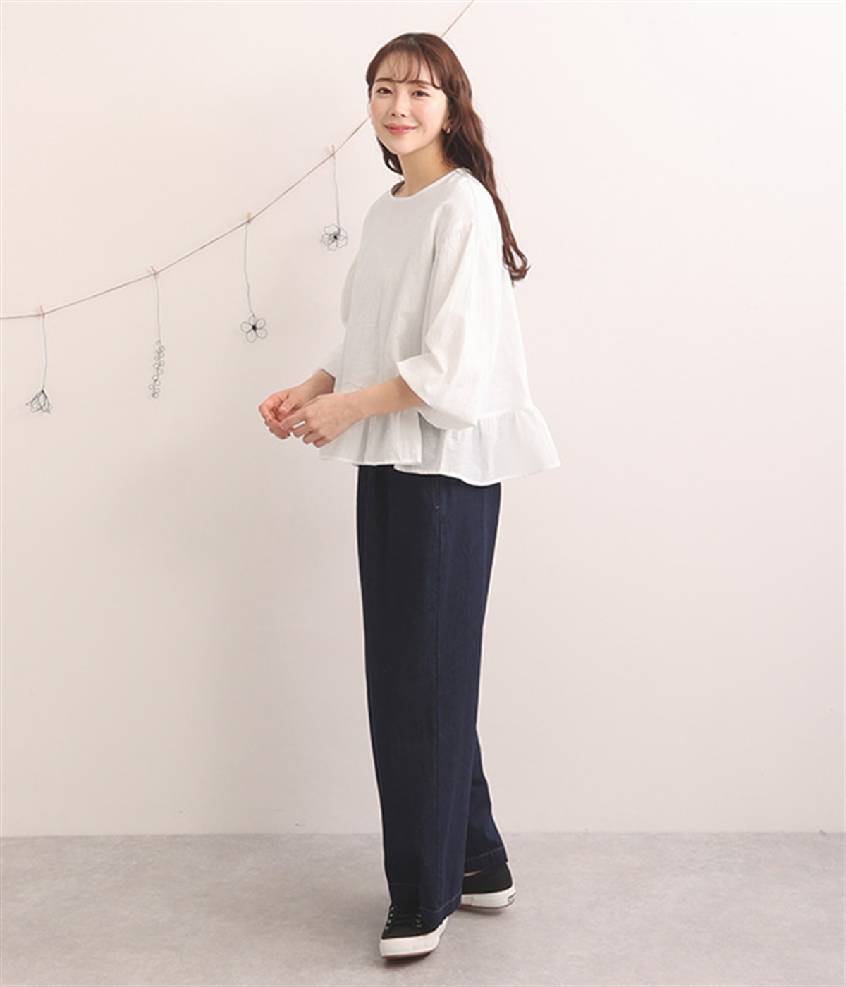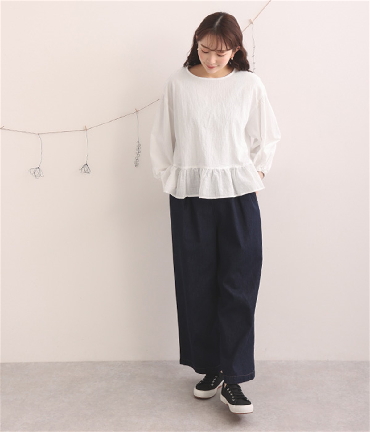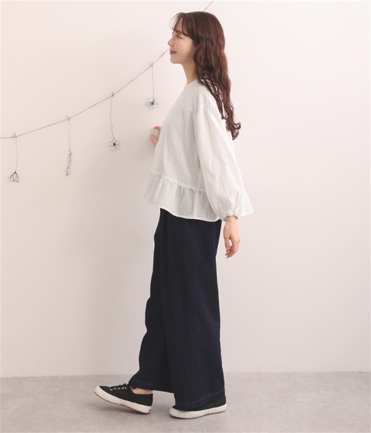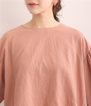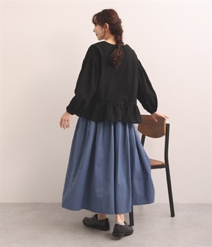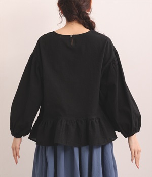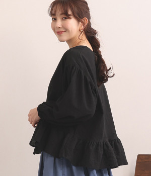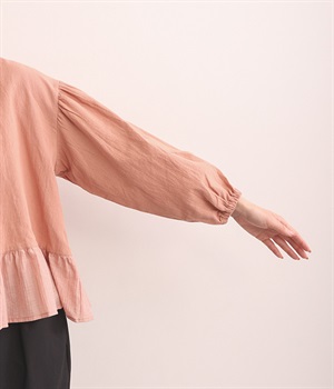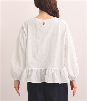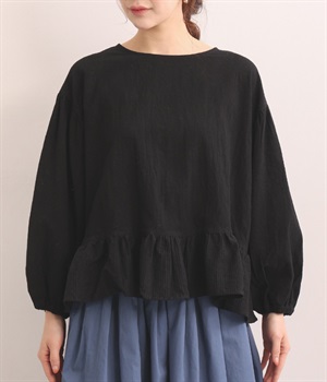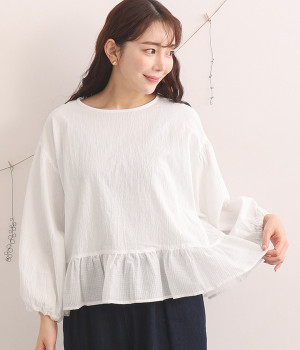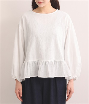 生地の織りの凹凸により、強めのドライタッチな風合いを実現したコットンワッシャー素材のプルオーバー。薄地の別布フリルを裾にあしらうことで、透け感にほのかなコントラストをつけたフェミニンな仕上がりです。ボリューミーな袖の先にはゴムを通しているため、プッシュアップして着こなしに変化をつけることも可能。体のラインを拾いにくいシルエットなので、華やかな上品さがありつつもゆったりと着用できます。