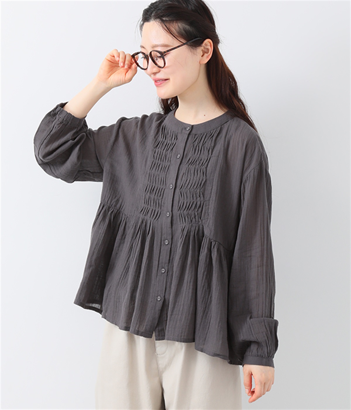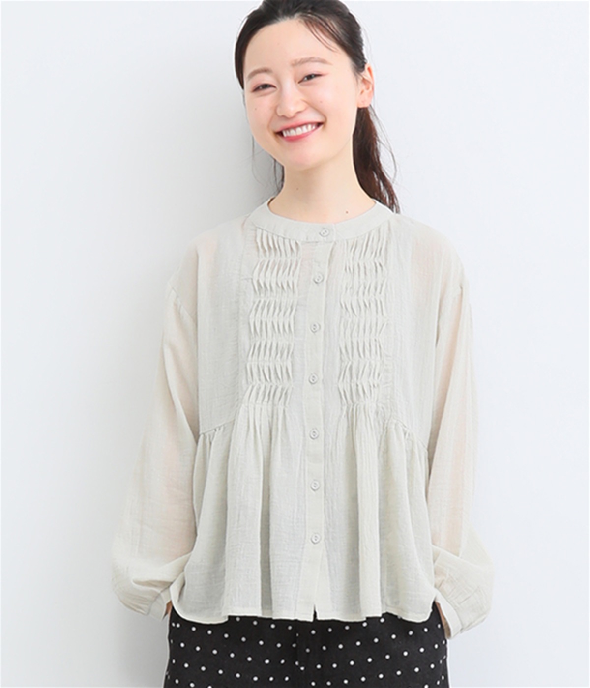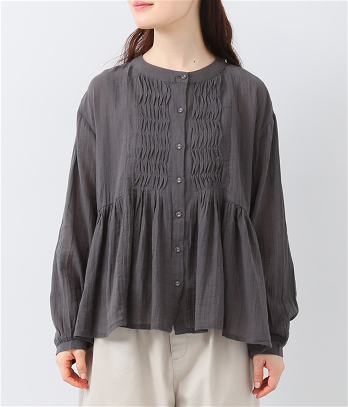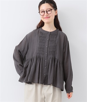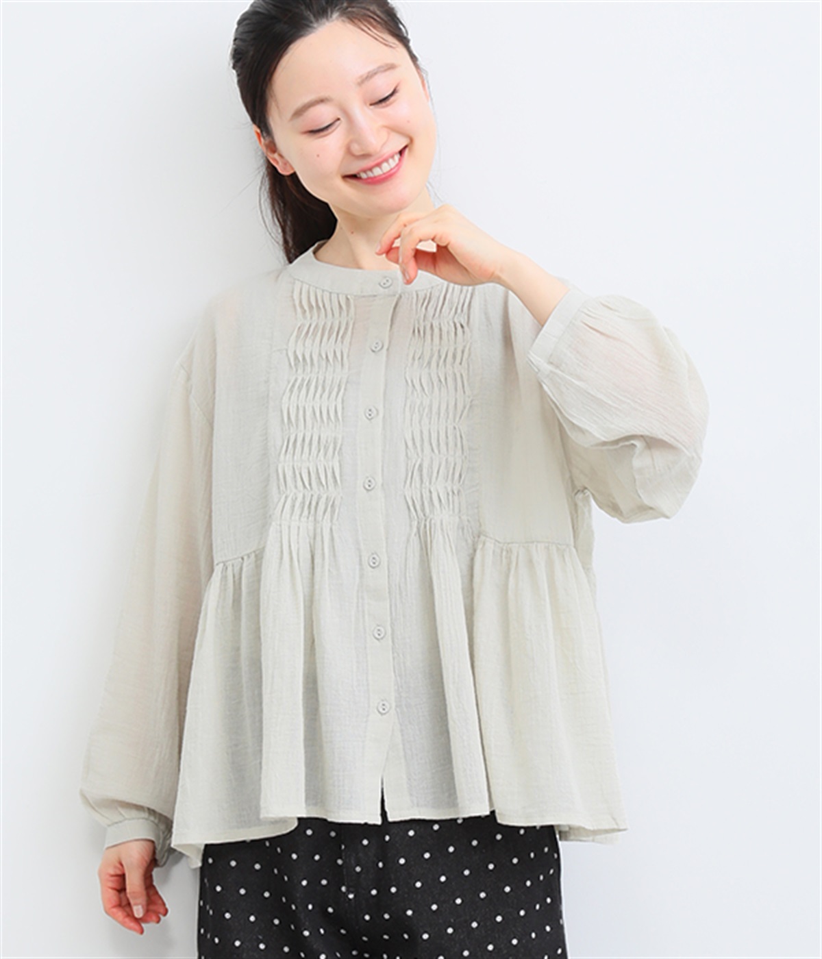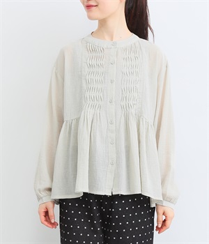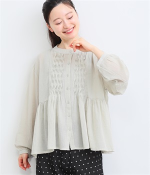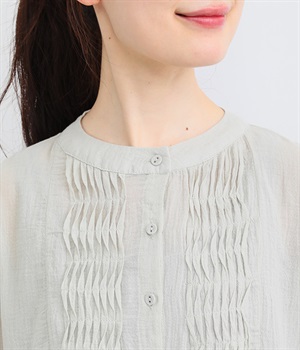 フロントの波打つピンタック&バンドカラーがエレガント