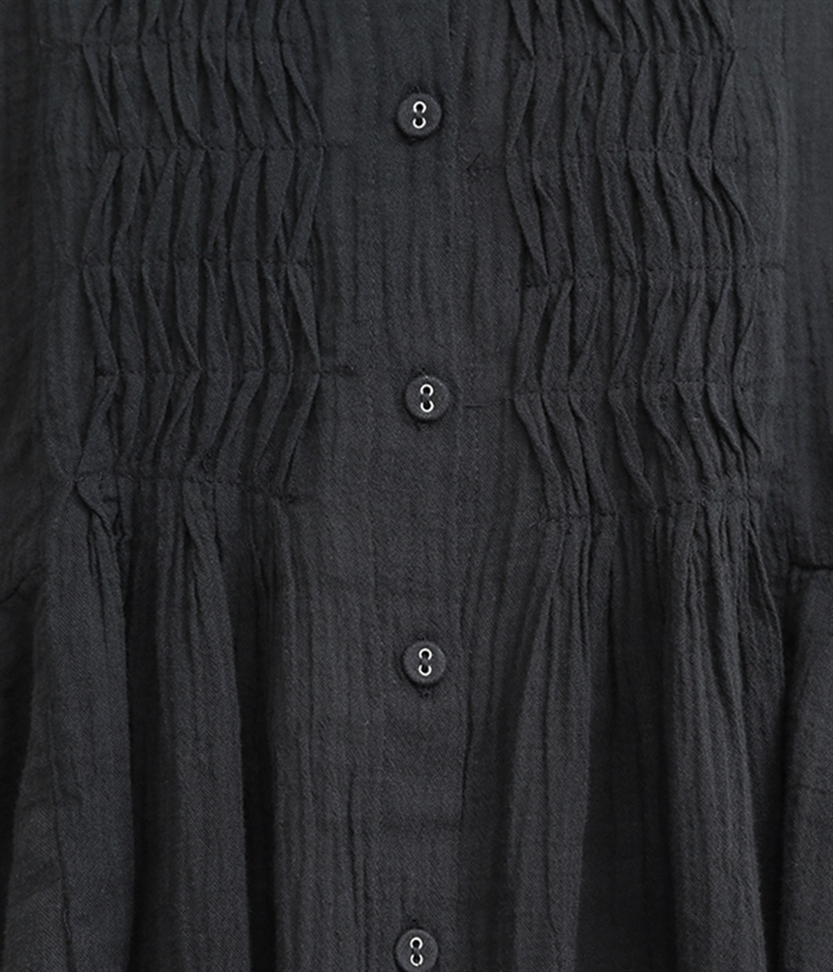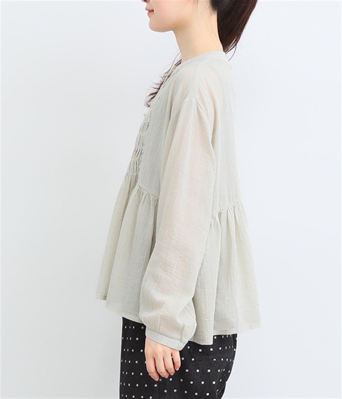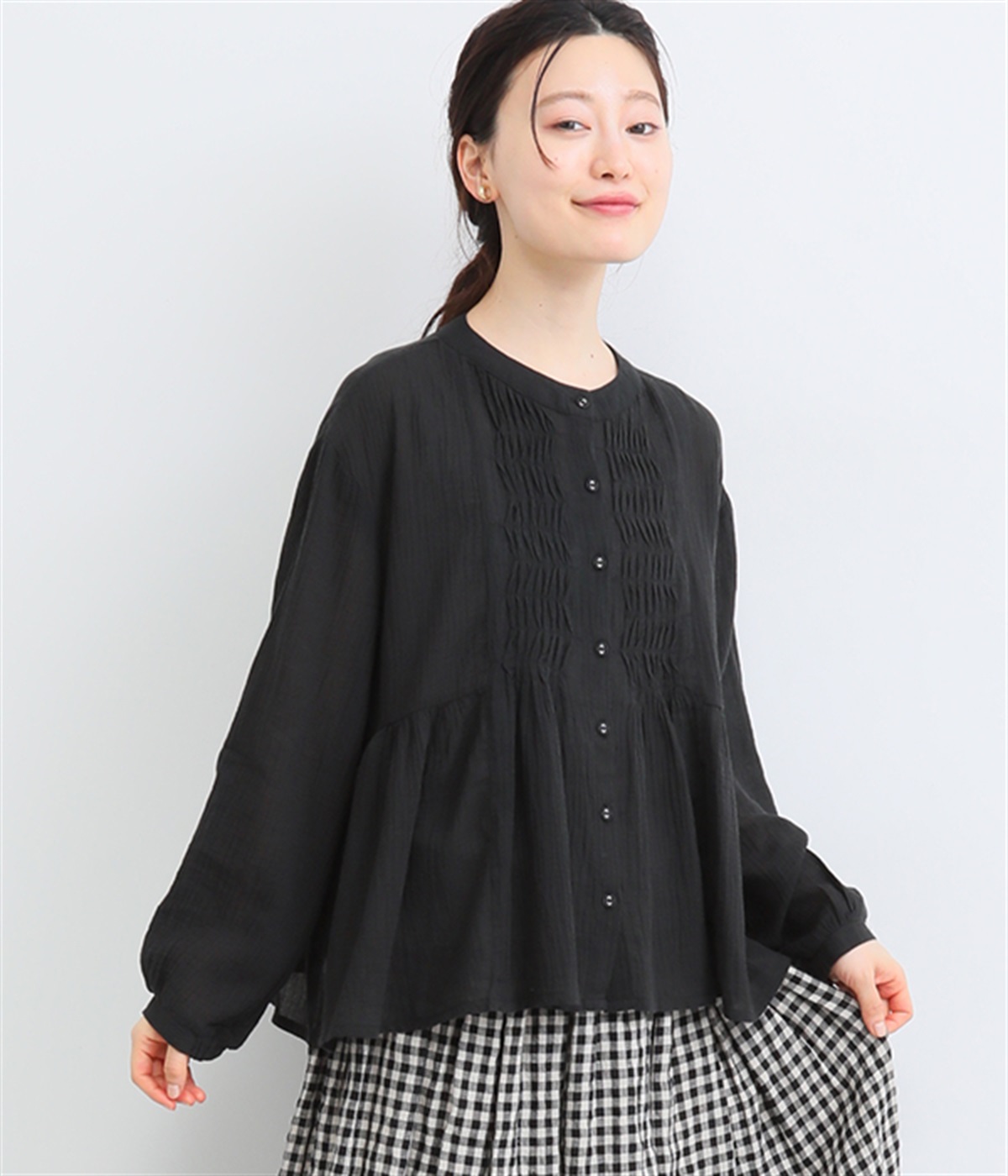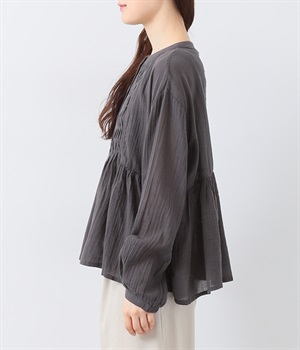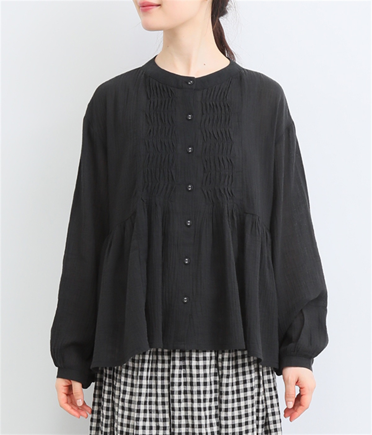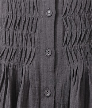 フロントの波打つピンタック&バンドカラーがエレガント