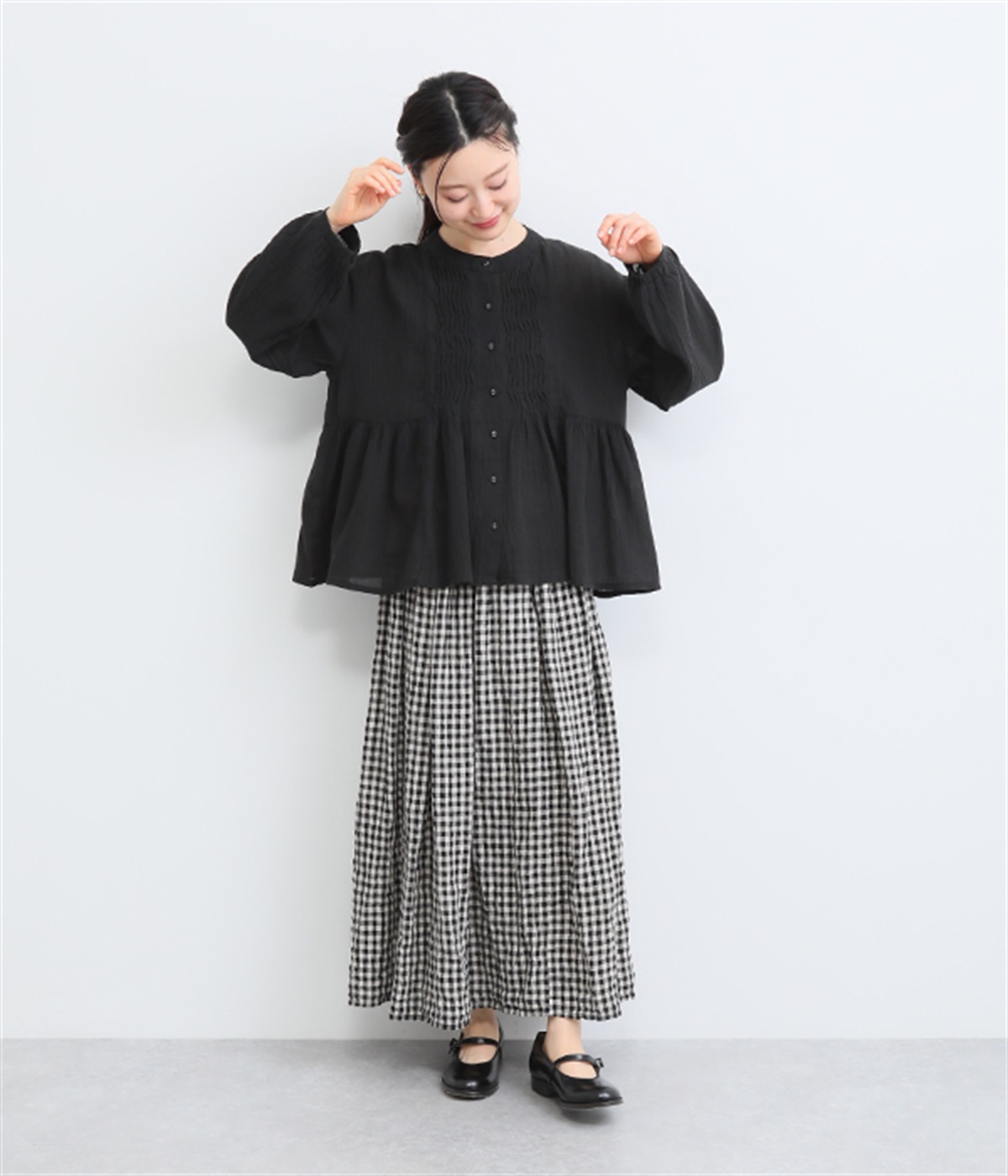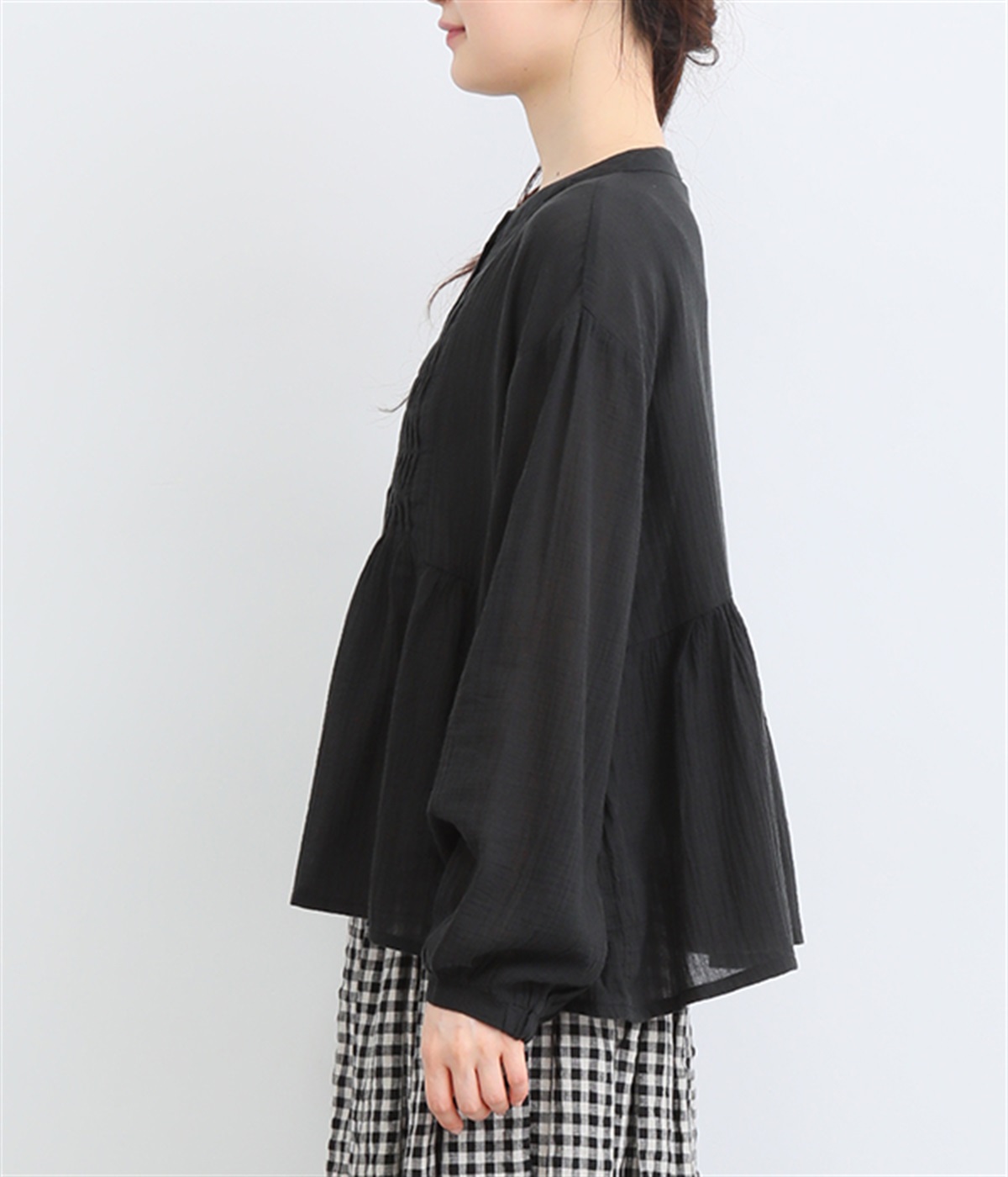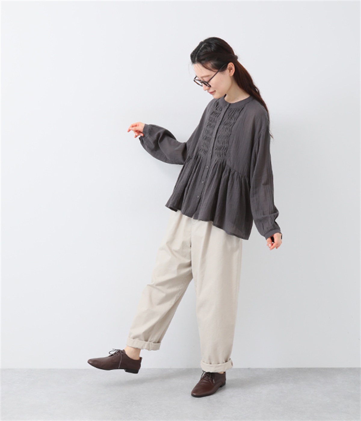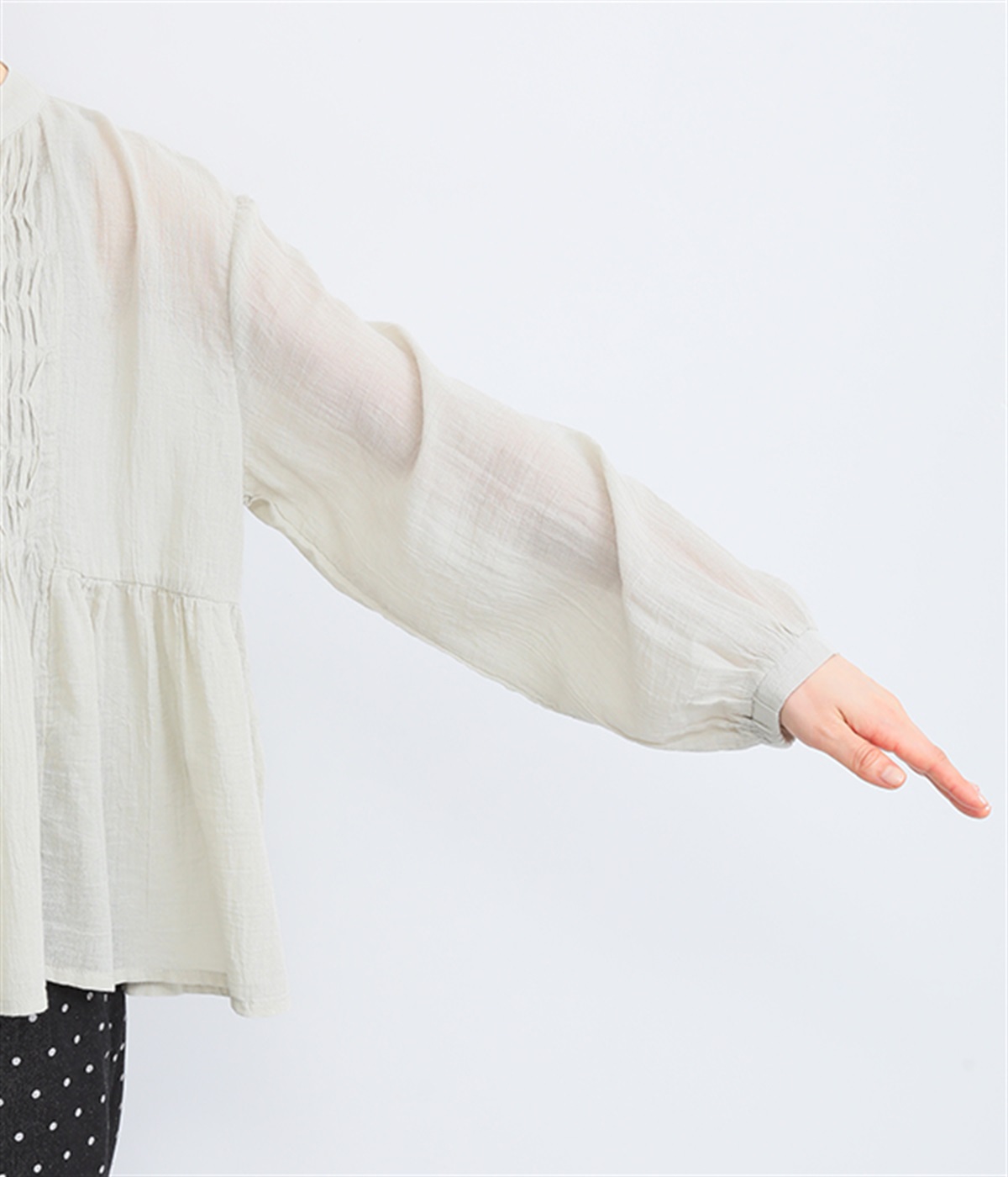 フロントの波打つピンタック&バンドカラーがエレガント