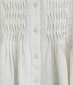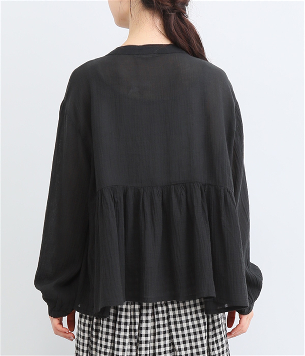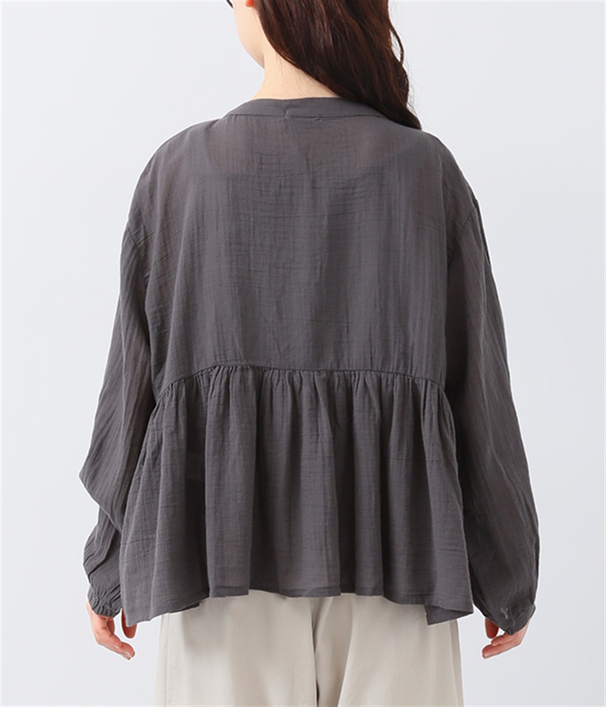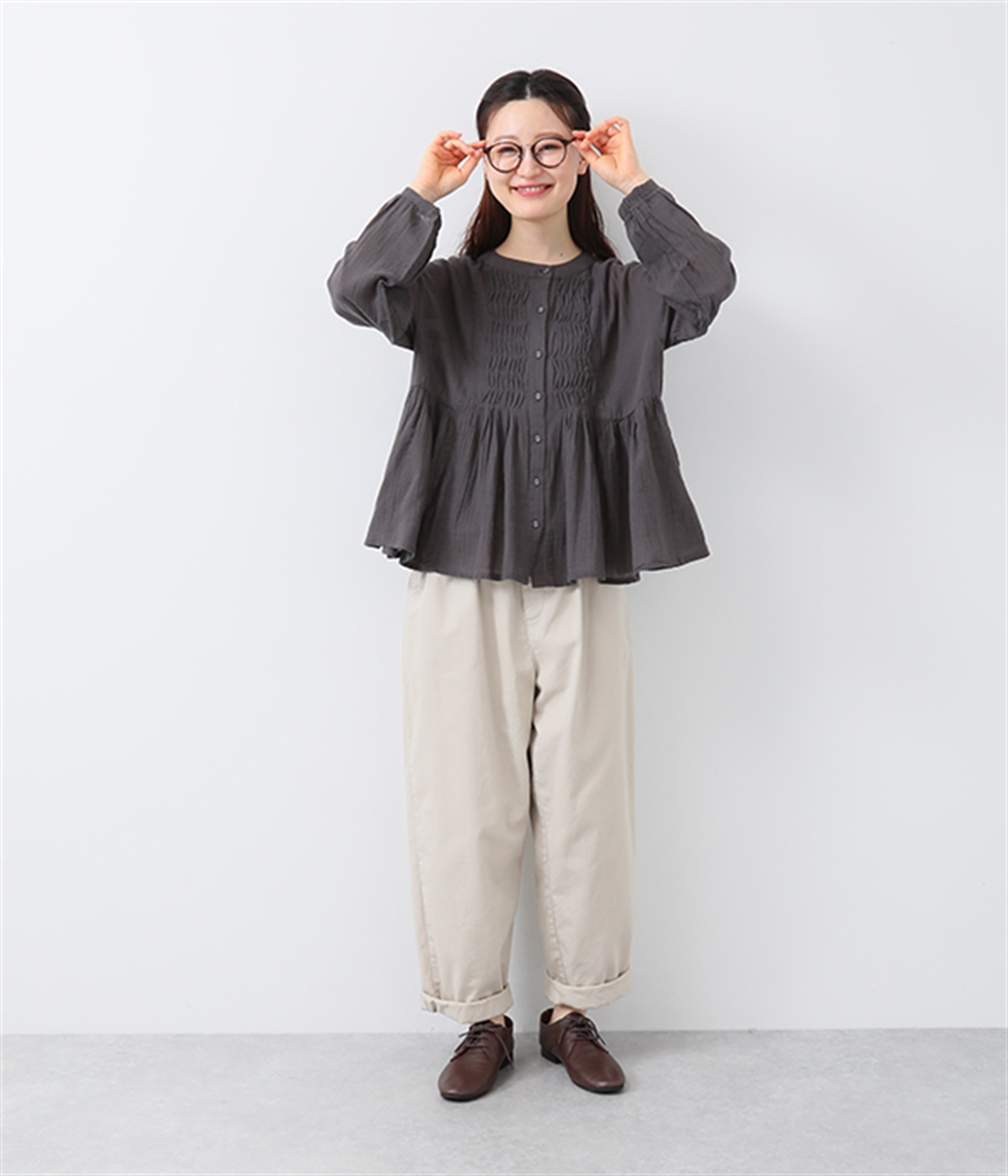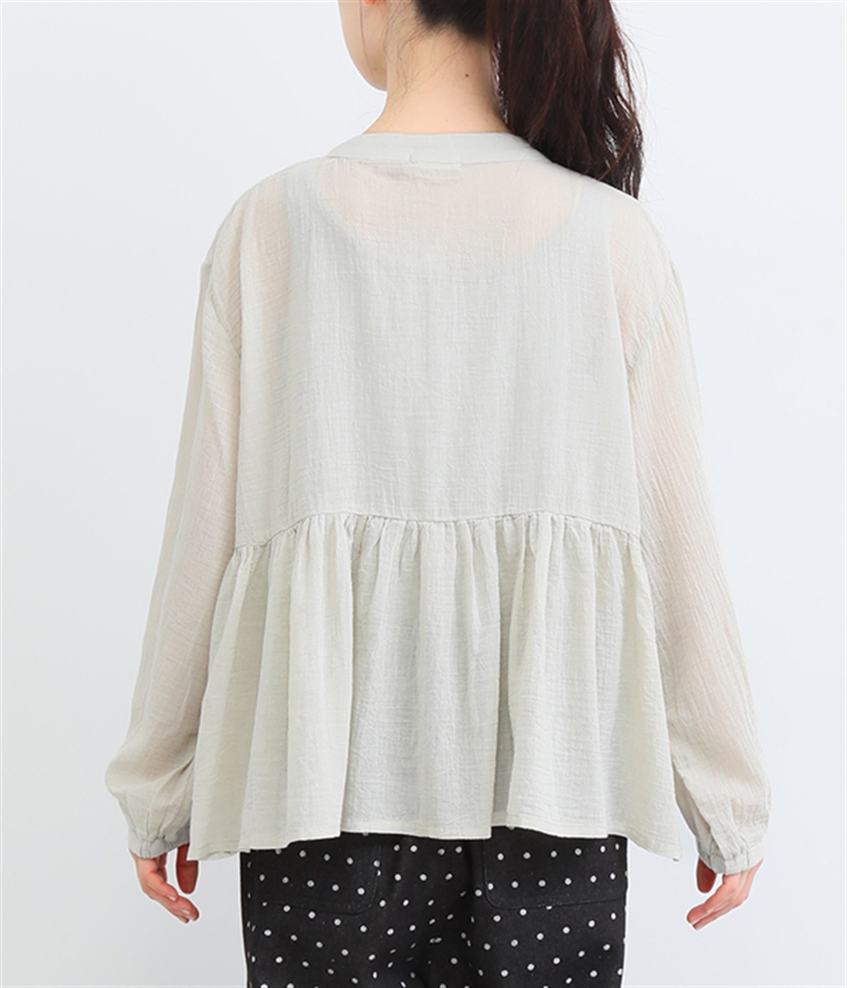 フロントの波打つピンタック&バンドカラーがエレガント